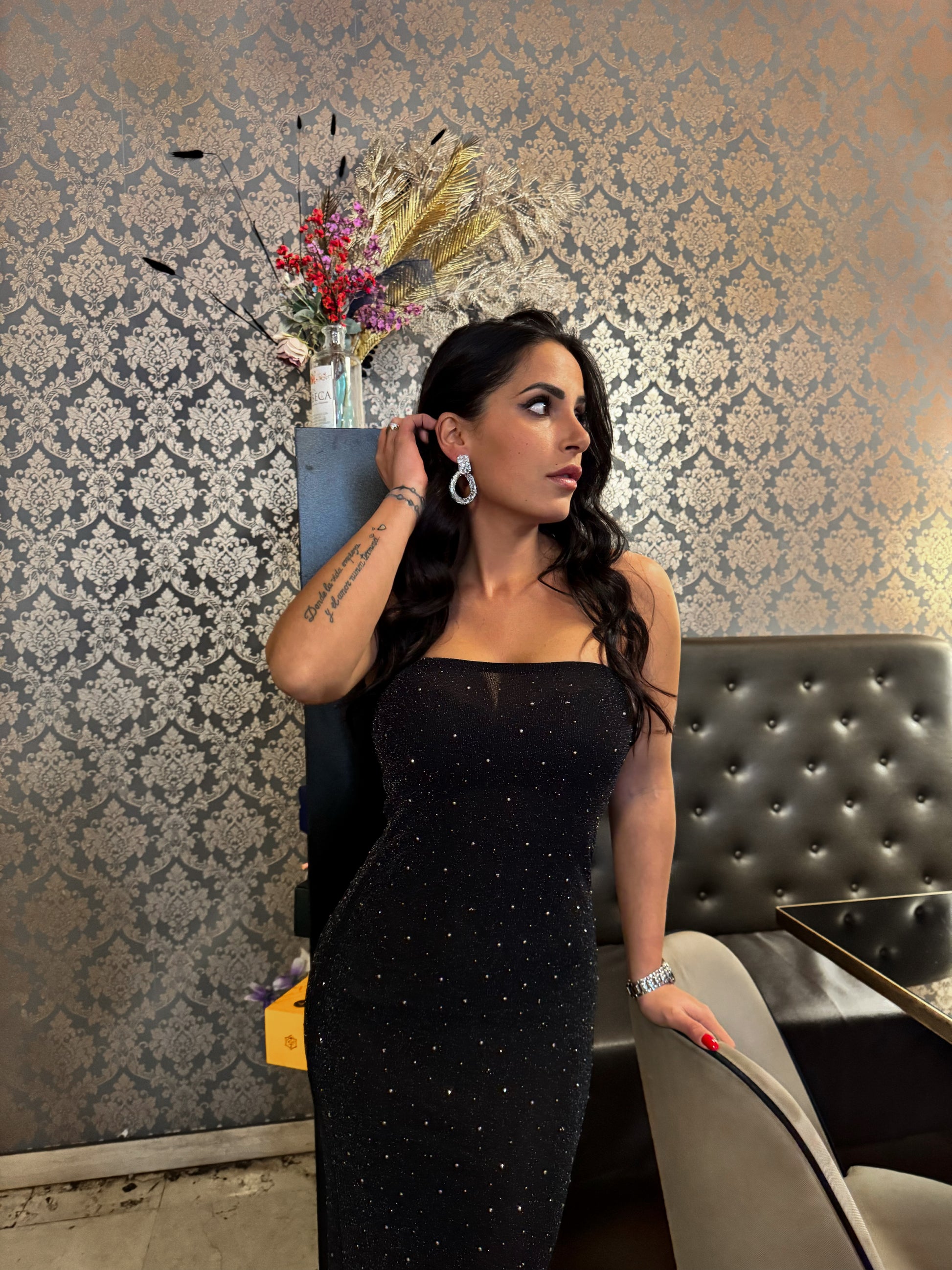 Un capo iconico e senza tempo. Questo abito lungo nero a fascia è pensato per valorizzare la silhouette con eleganza. Tempestato di micro swarovski dona brillantezza ad ogni passo.
