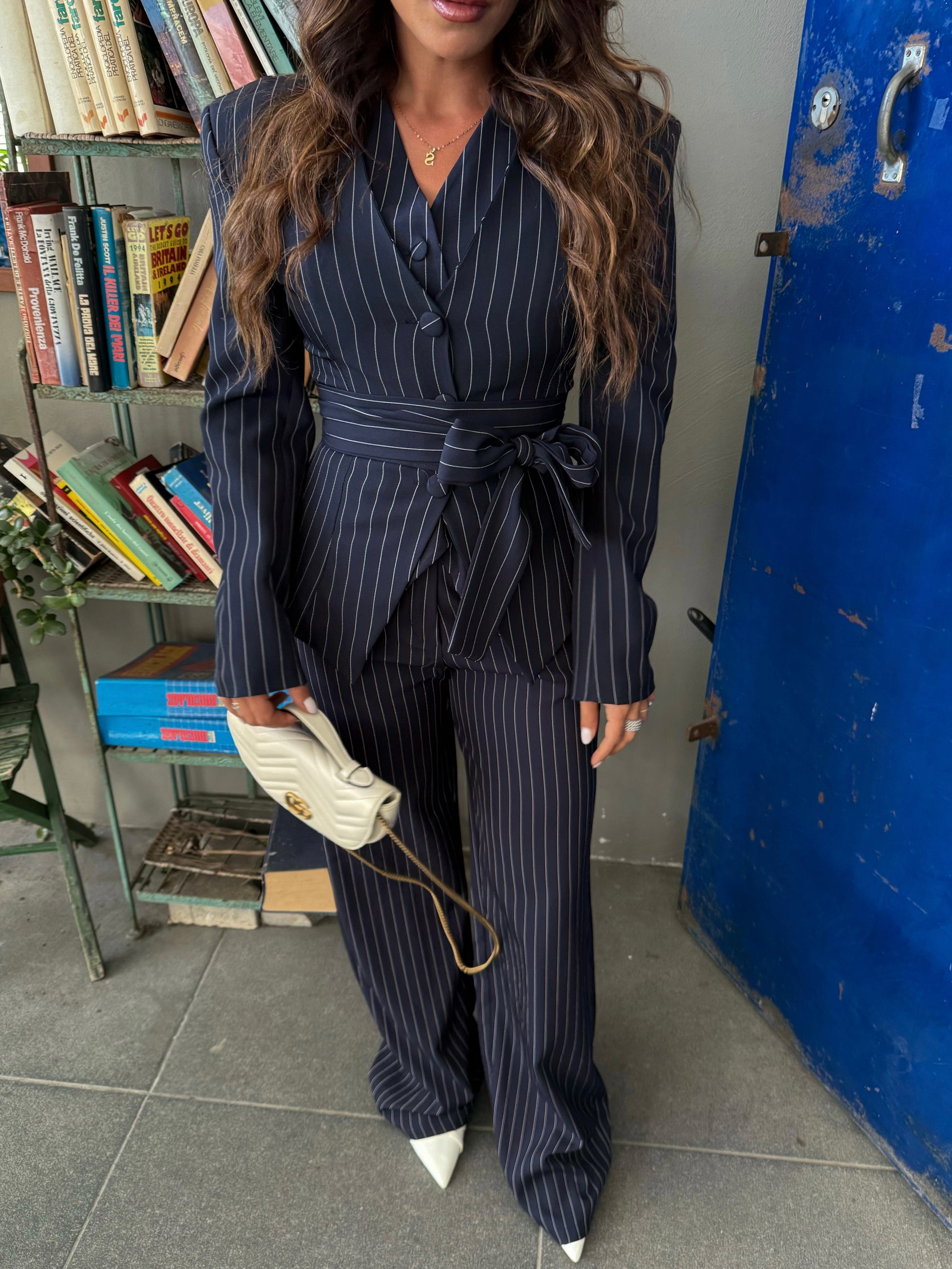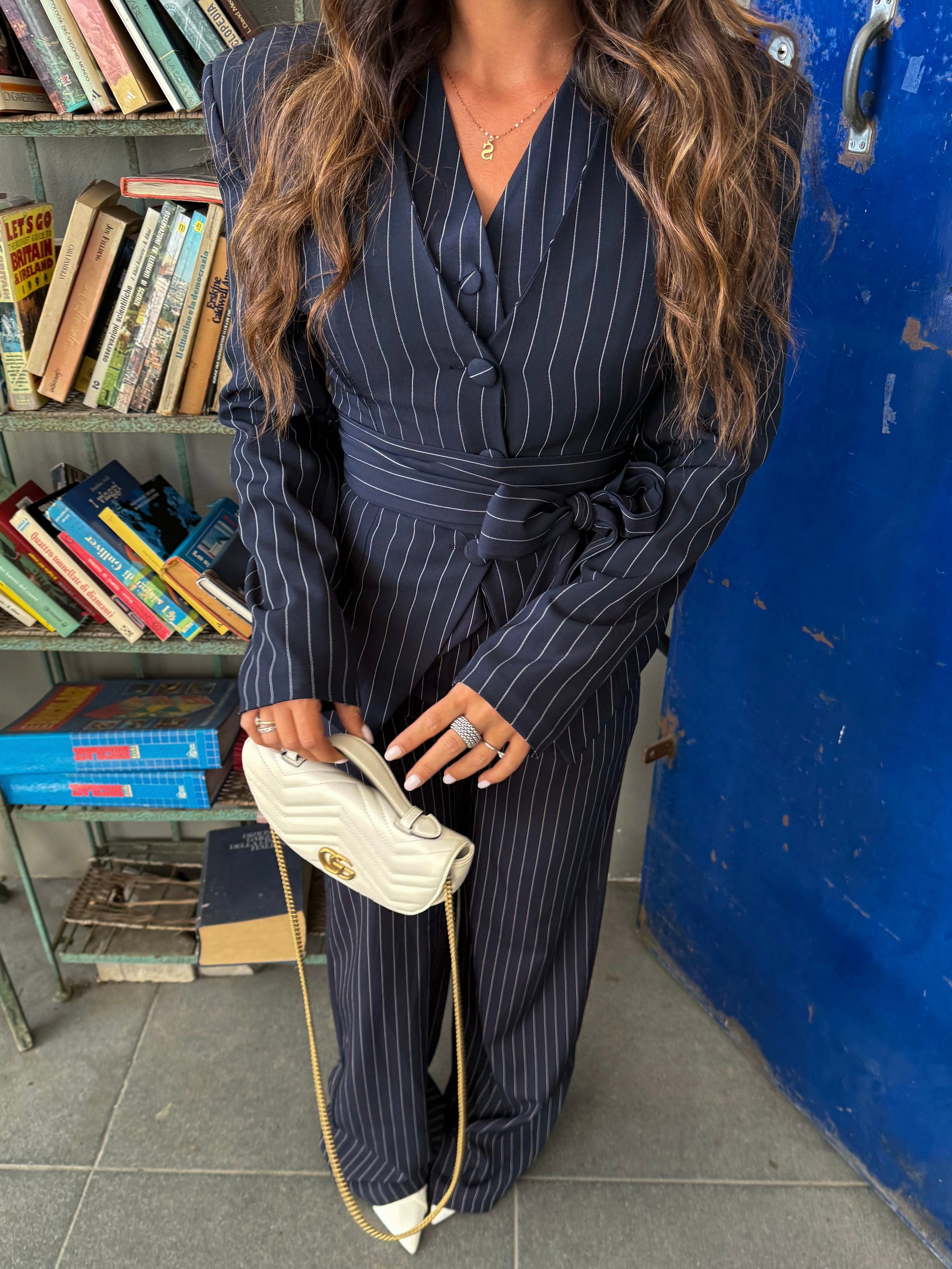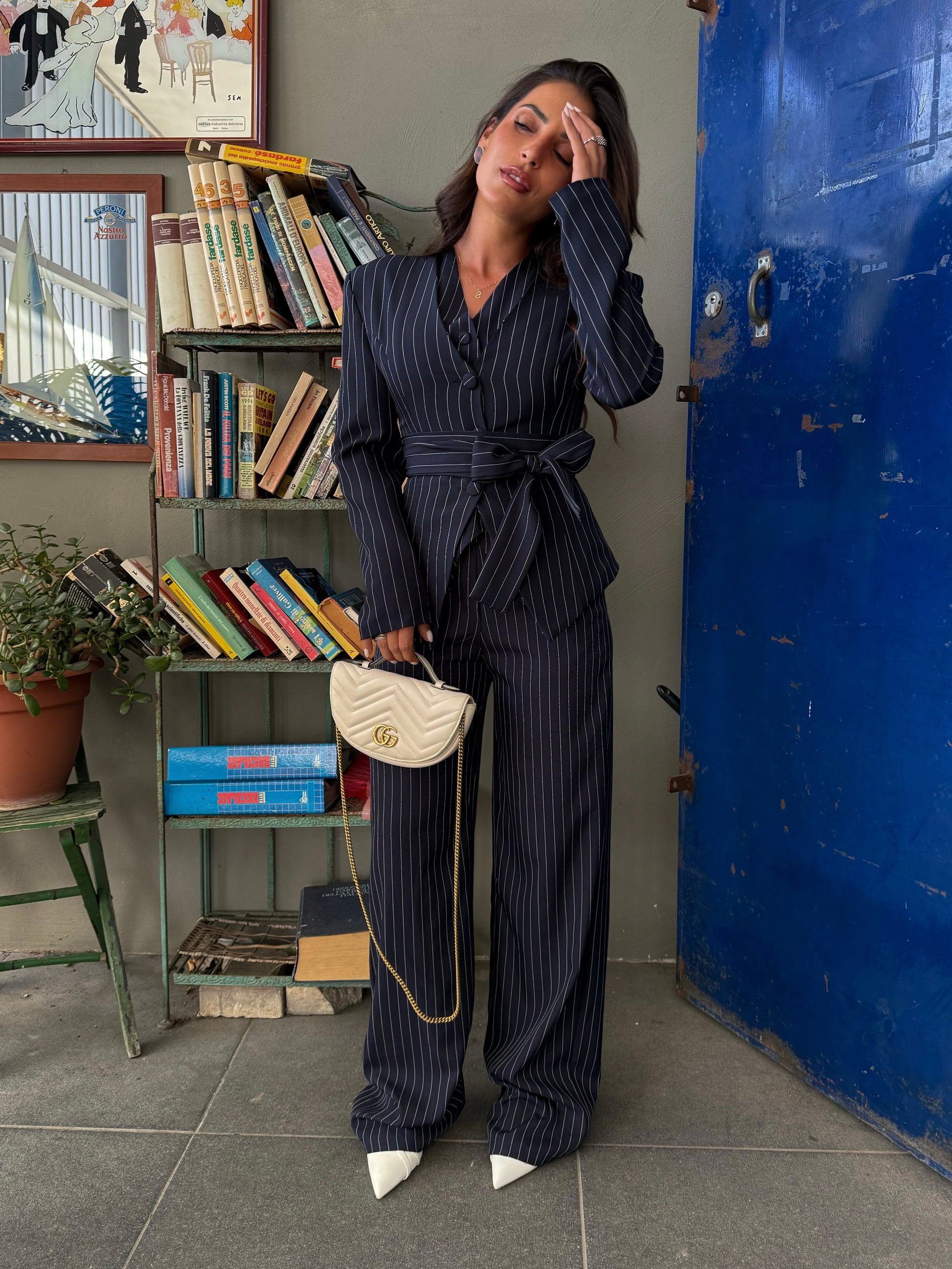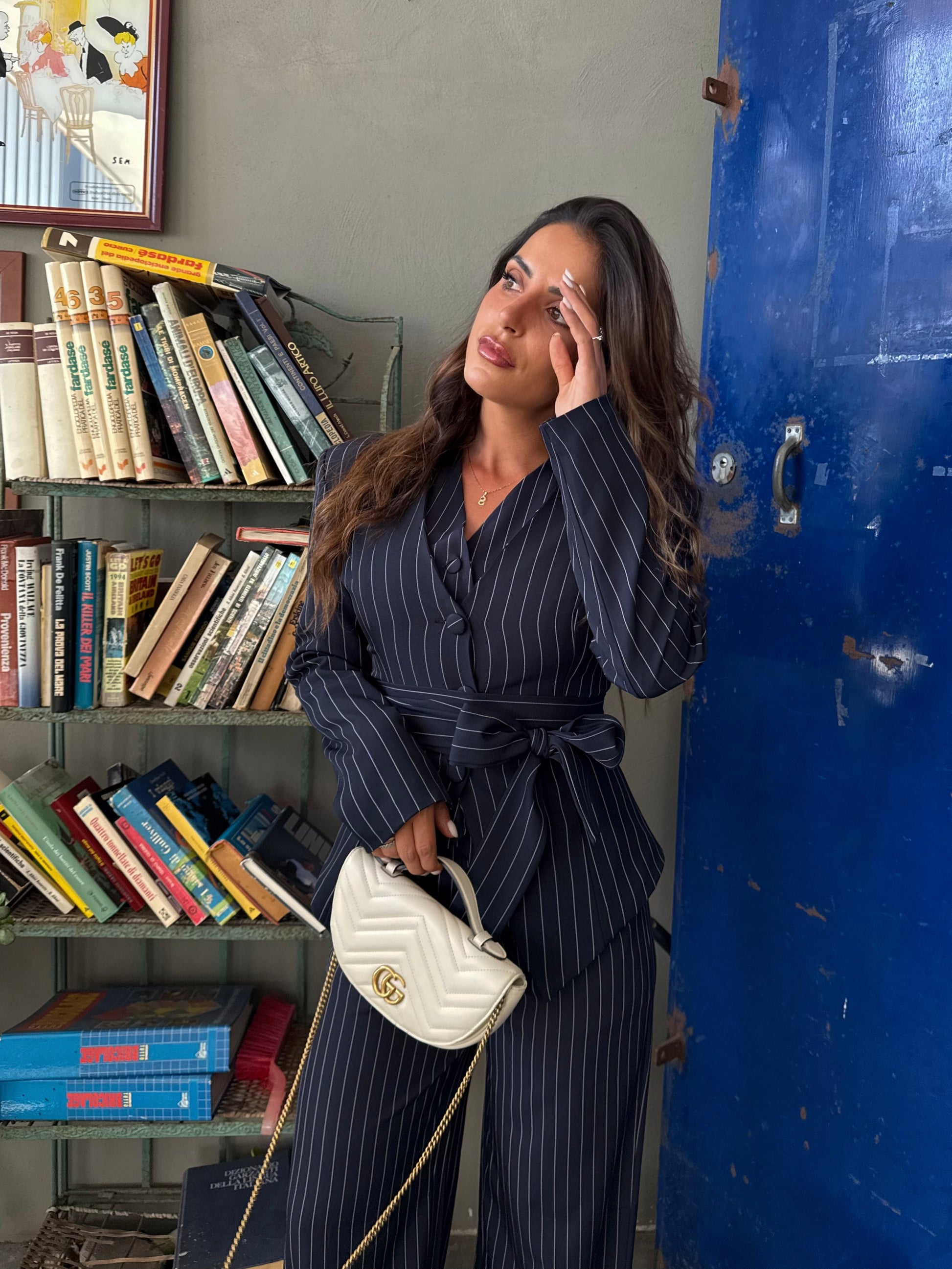 Taglio strutturato , spalline rinforzate e fit che valorizza . Questo blazer gessato blu con sottili righe bianche è l'alleato perfetto per look decisi ma versatili. I bottoni frontali e la fusciacca in vita rimovibile permettono di adattarlo ad ogni silhouette e occasioni .
