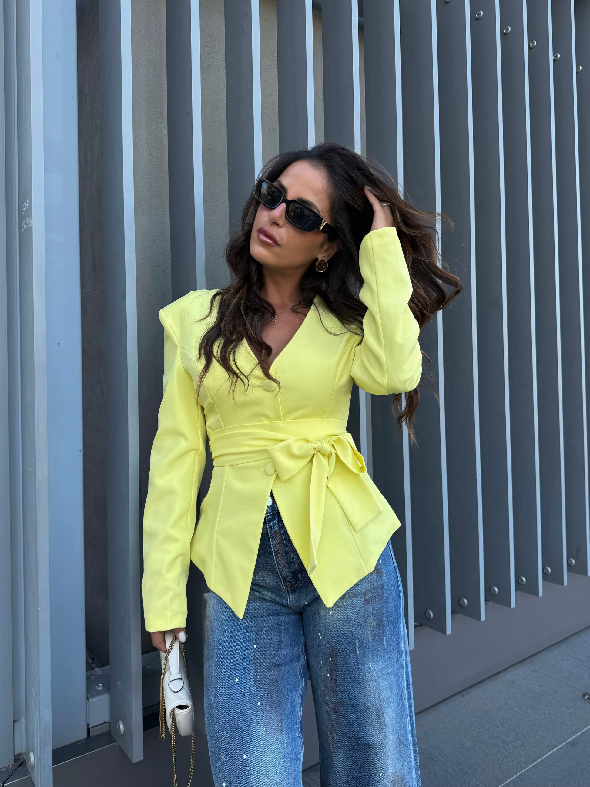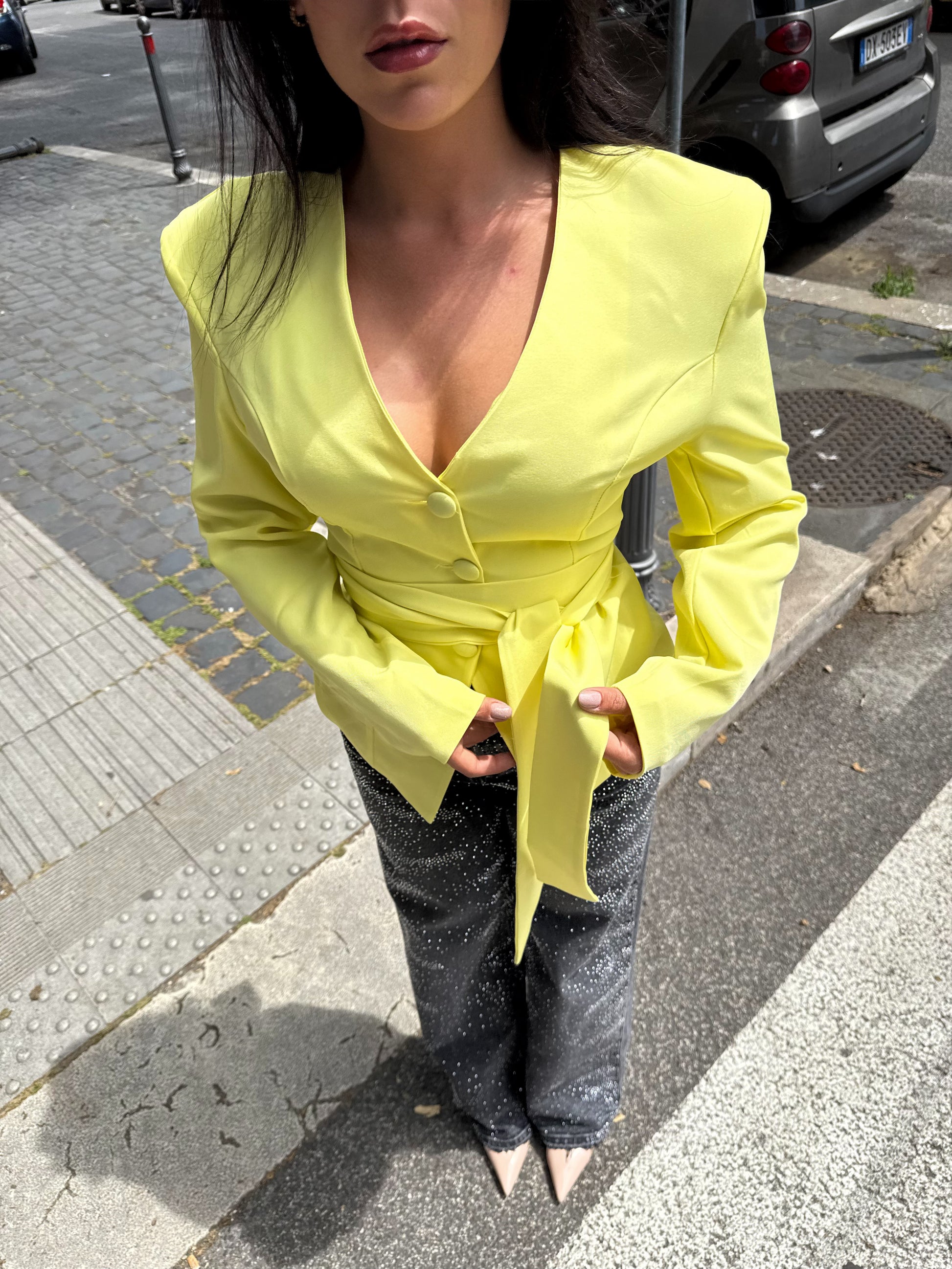 Un'esplosione di stile e personalità . Questo blazer è il pezzo forte che ti svolta l'outfit . Ha una linea strutturata che valorizza il punto vita grazie alla fusciacca rimovibile . Scollo a V , bottoni sul davanti e spallina rinforzata . Lo indossi con un jeans , shorts o gonna per un look easy ma d'effetto , oppure con un pantalone elegante per un'occasione speciale. Perfetto per le mezze stagioni .