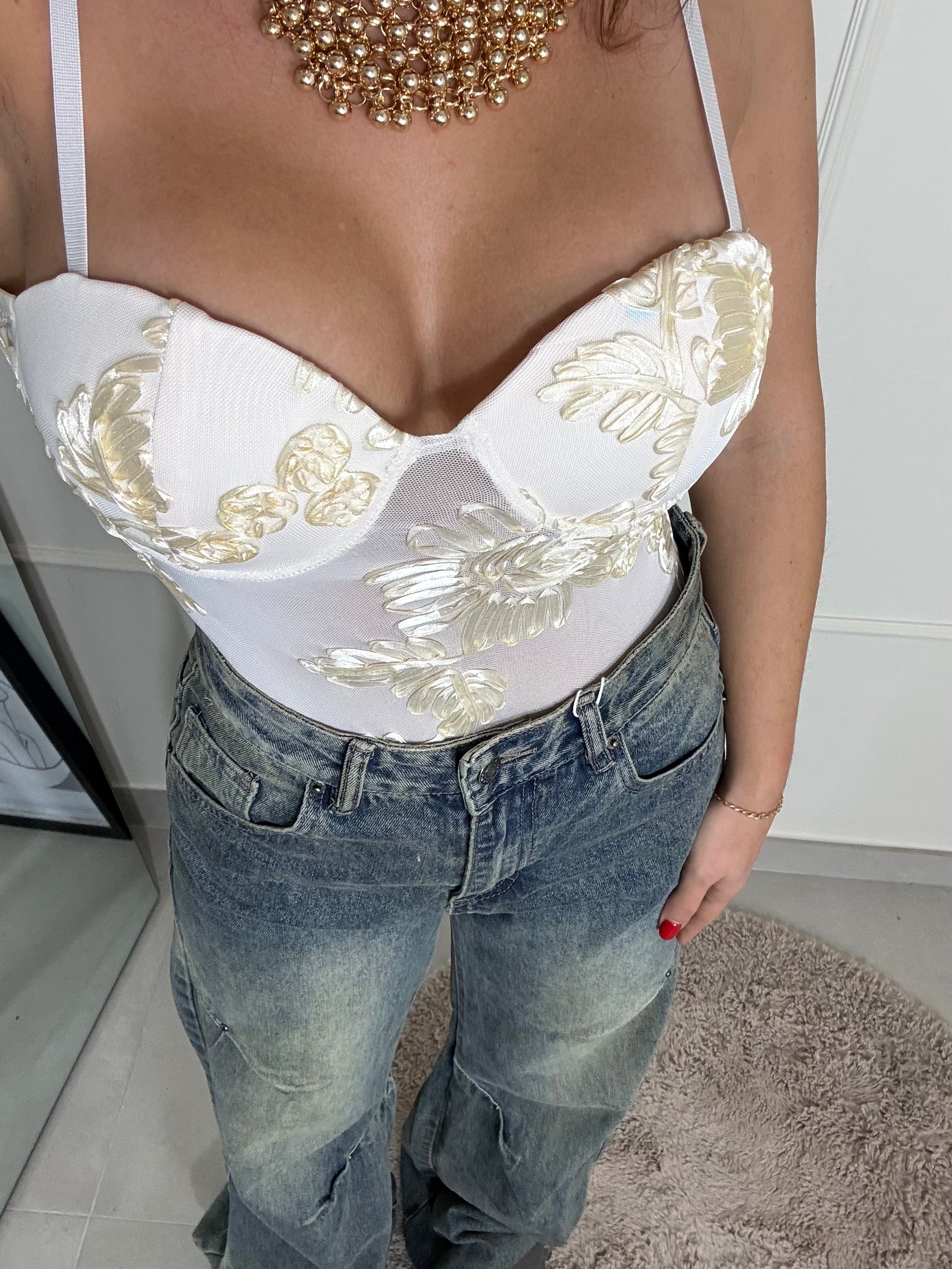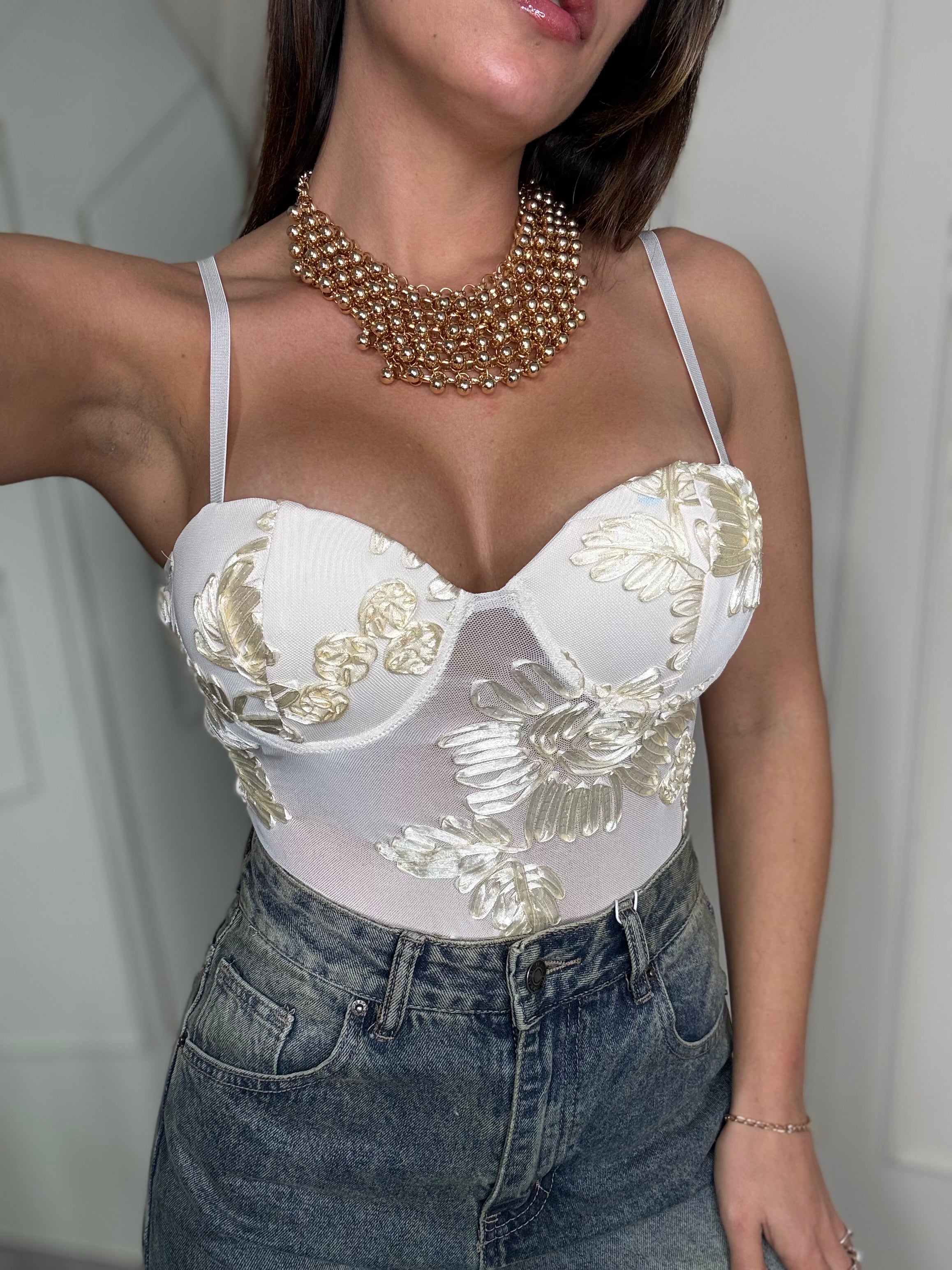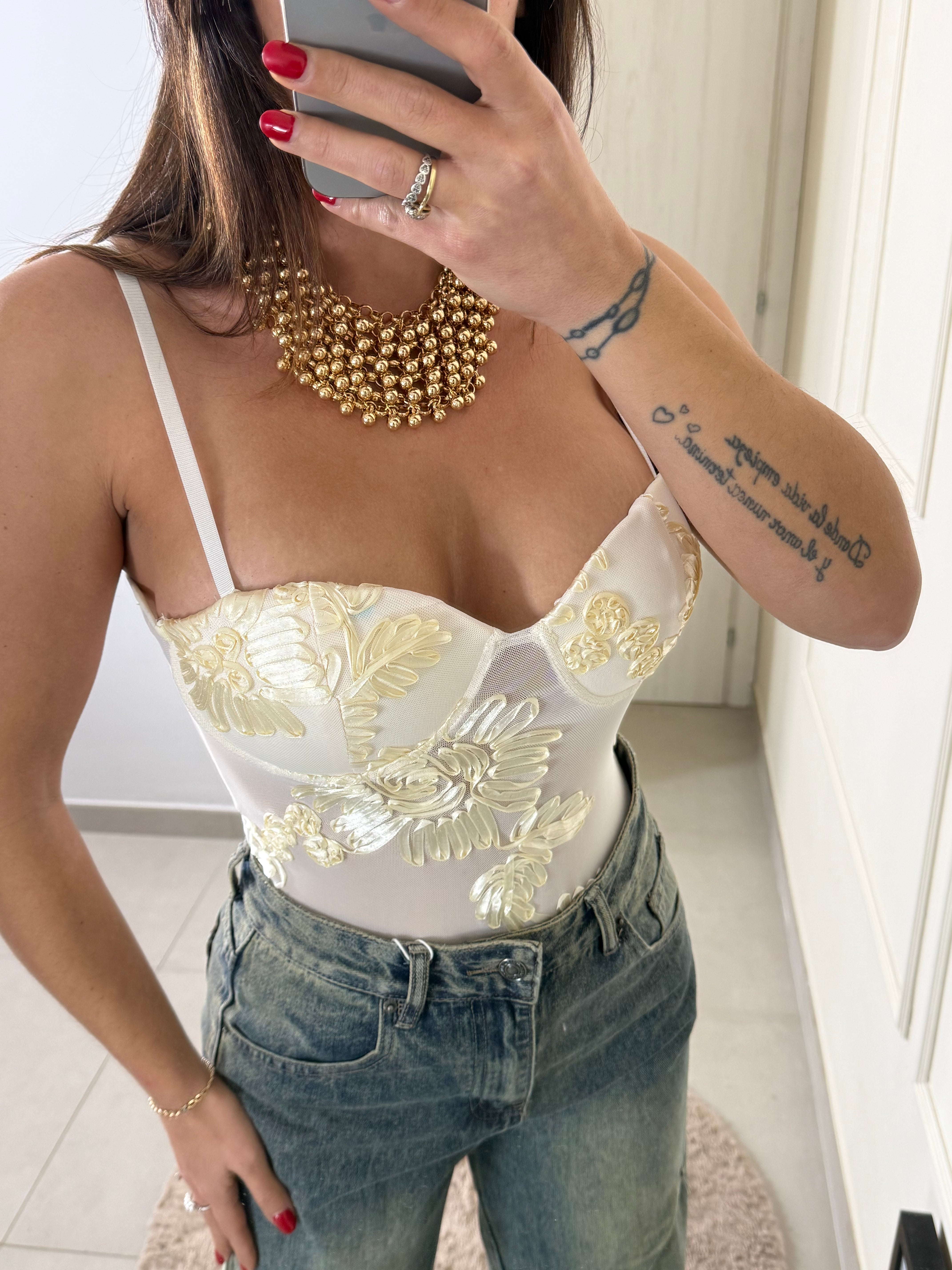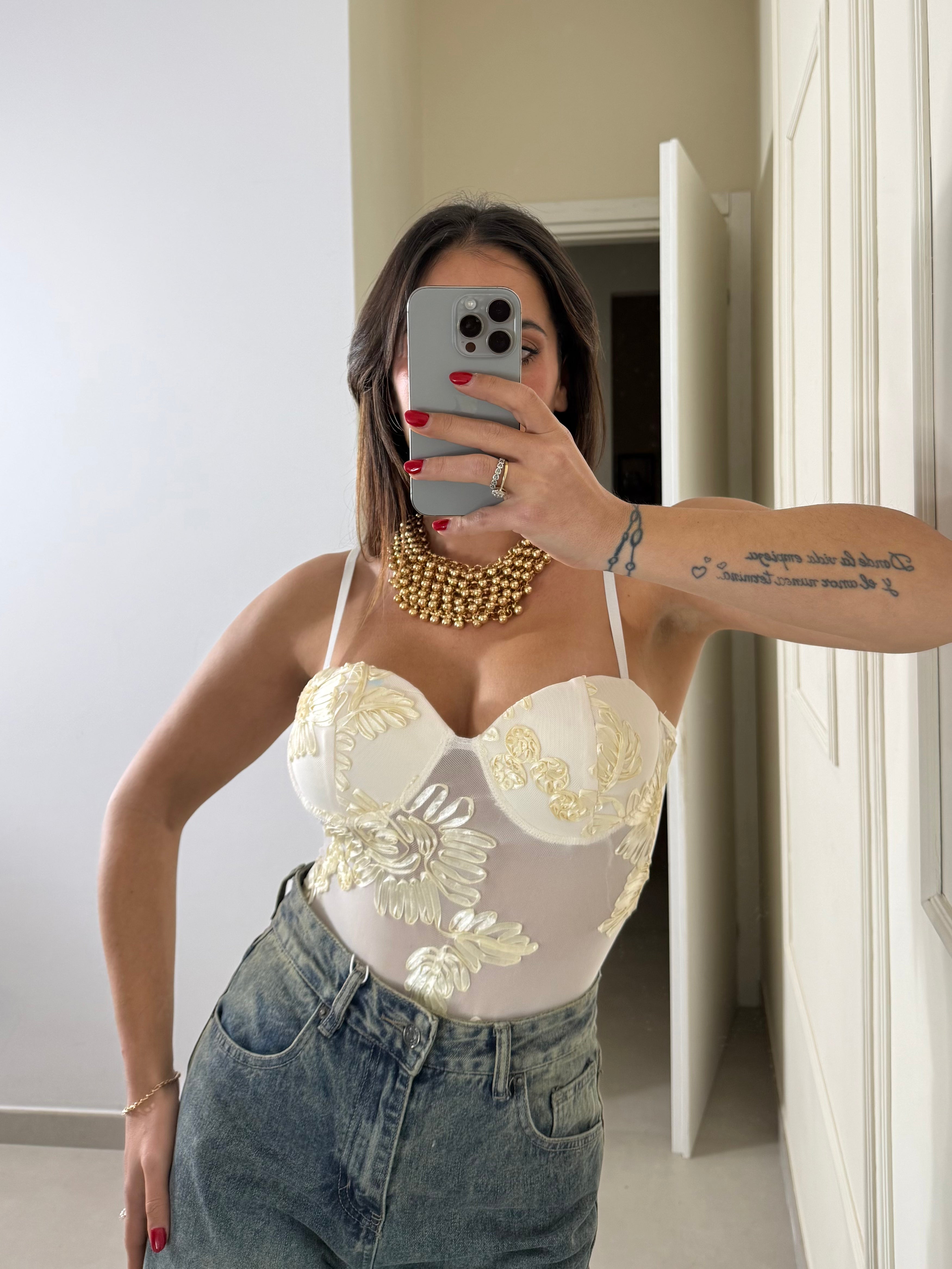 Raffinato e sensuale, questo body color champagne , dotato di coppe imbottite e bretelline regolabili, totalmente trasparente sul retro, mentre il davanti è impreziosito da fiori in rilievo champagne. Perfetto da indossare da solo o come sotto giacca , per look serali e outfit più ricercati. Taglia unica veste comodamente fino una L