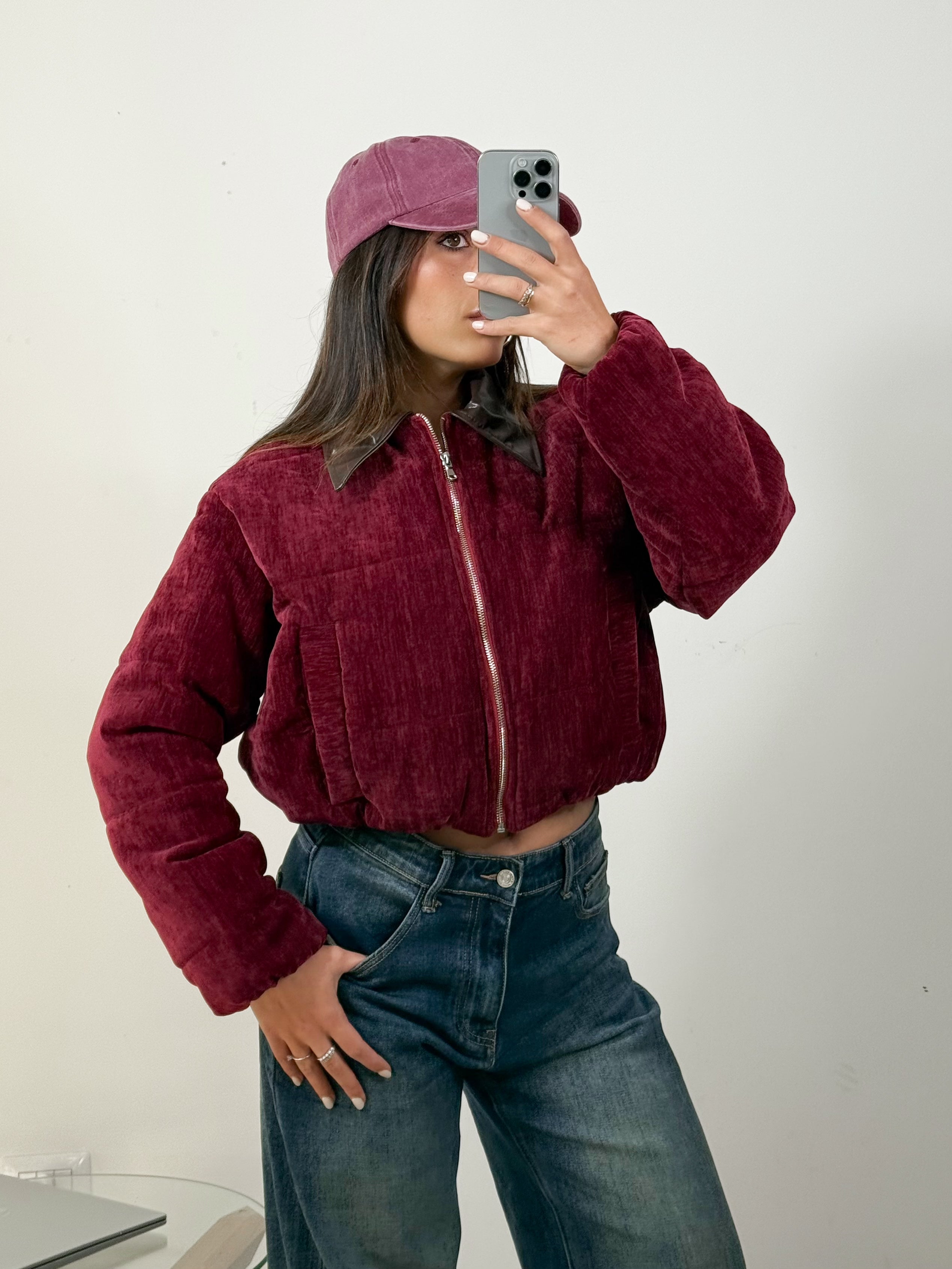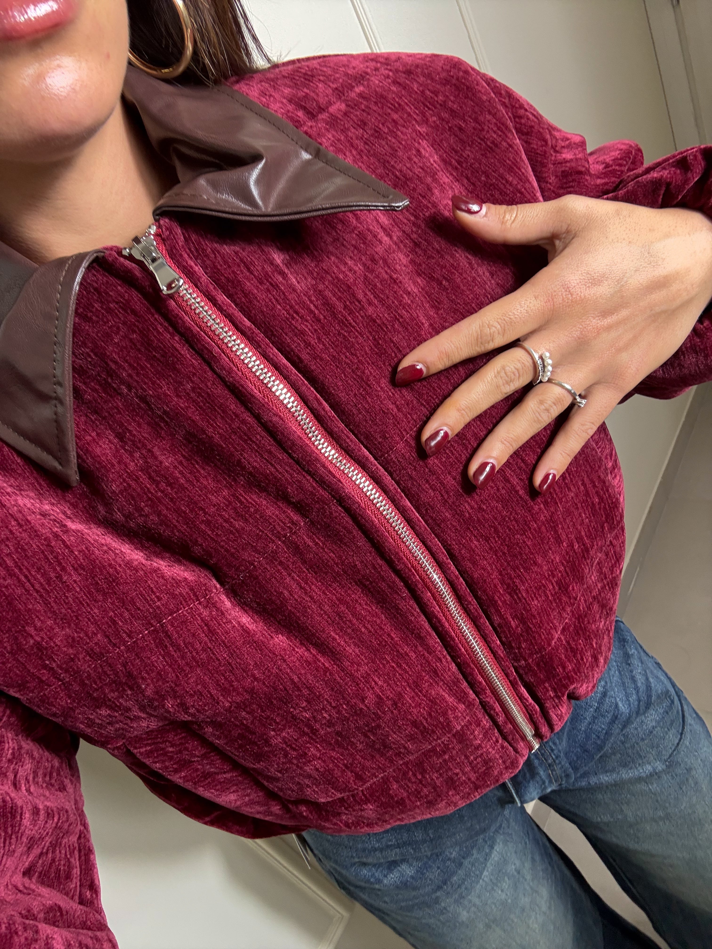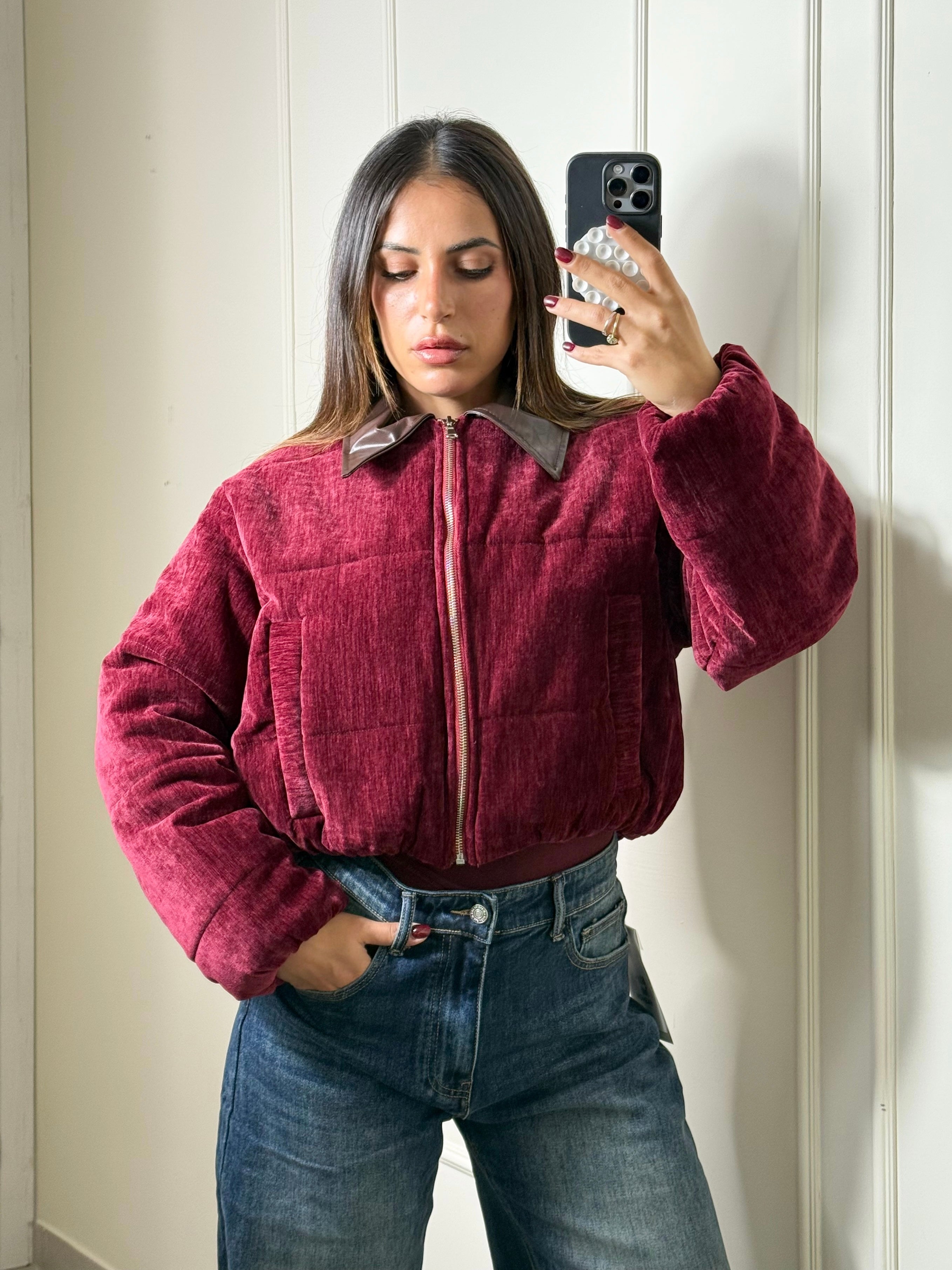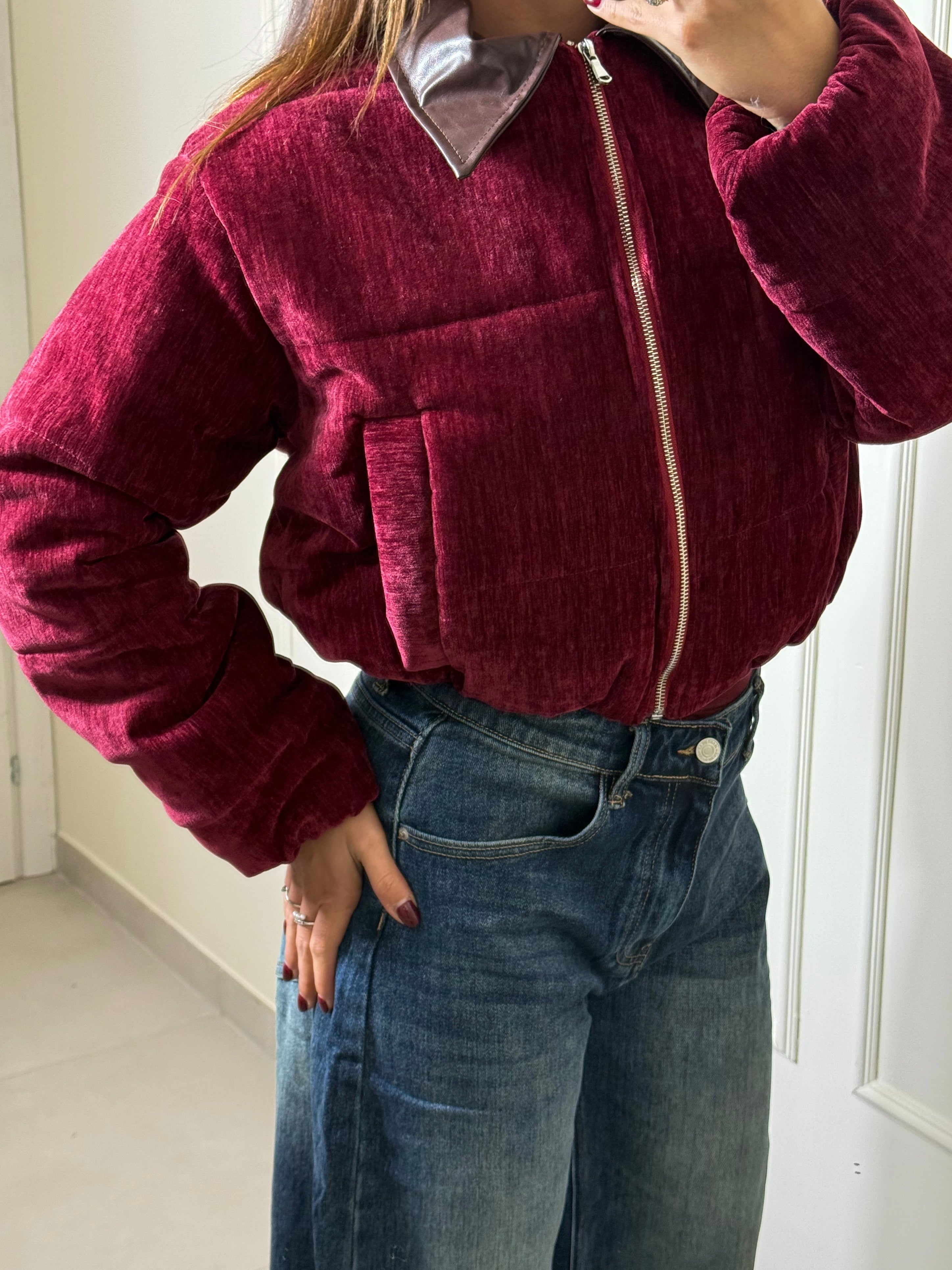 Il tessuto di color bordeaux intenso si abbina al colletto in ecopelle marrone, due colori di tendenza che insieme creano un contrasto irresistibile. Presenta elastico in vita e ai polsini, tasche laterali. Taglia unica