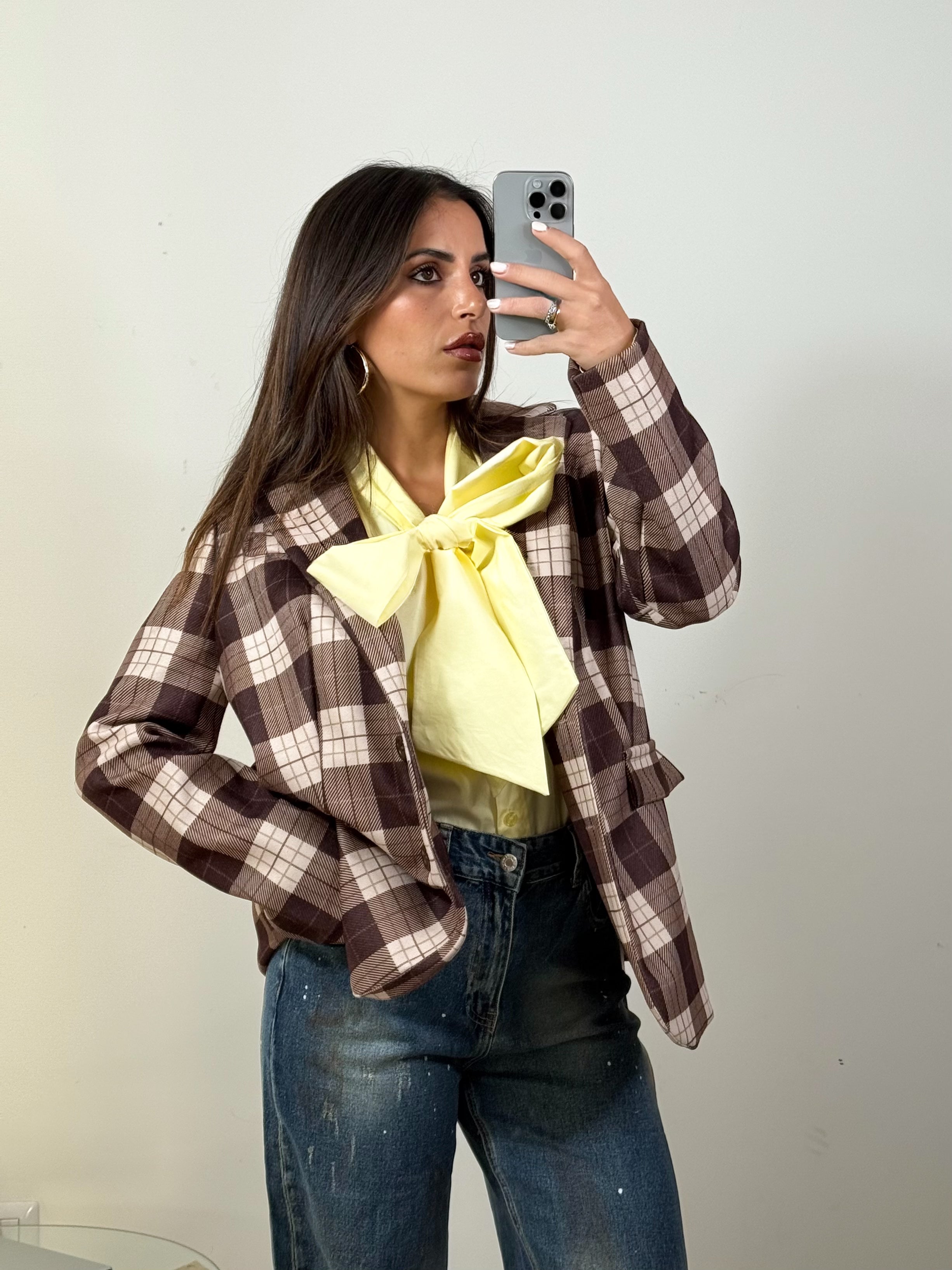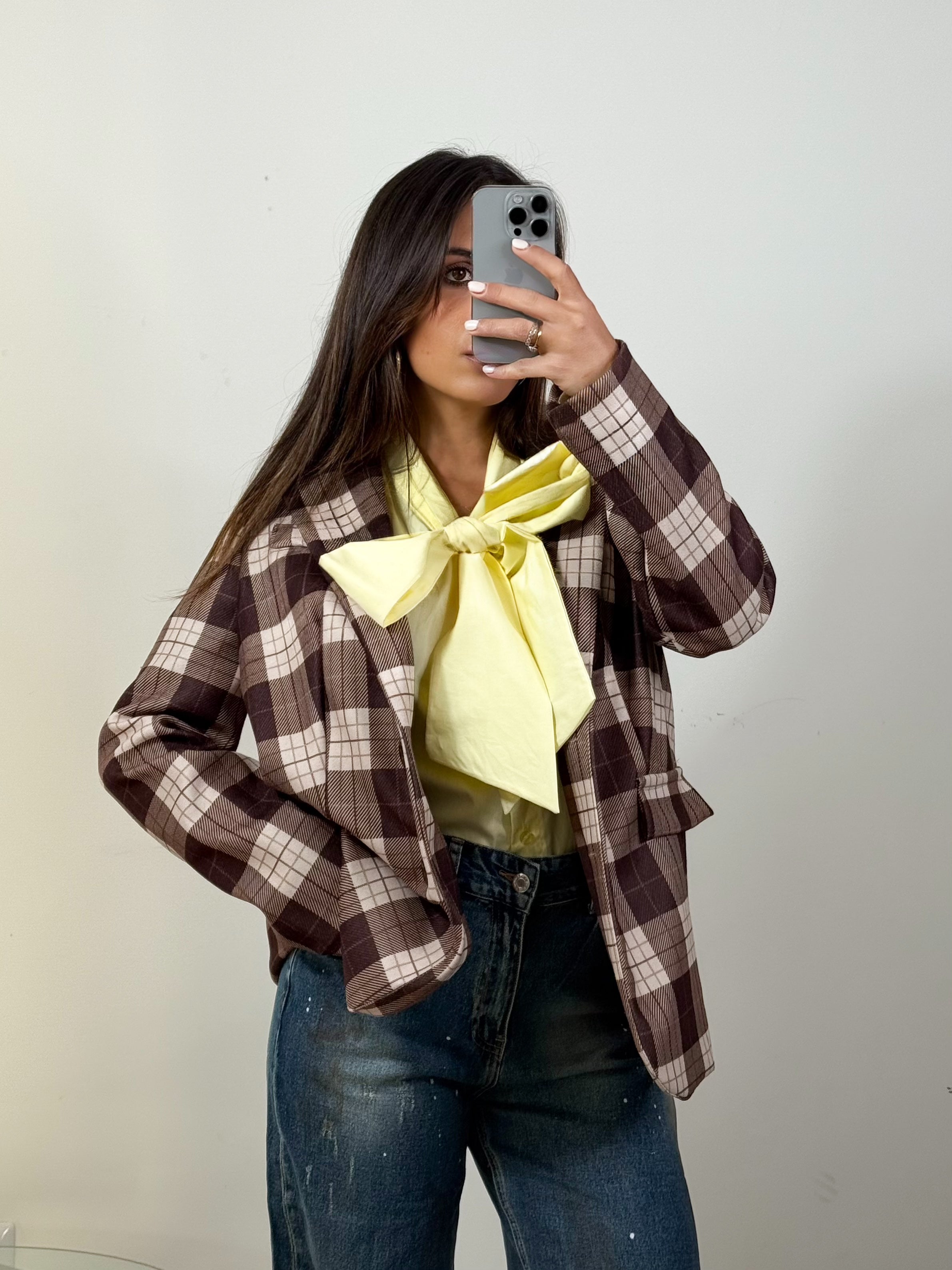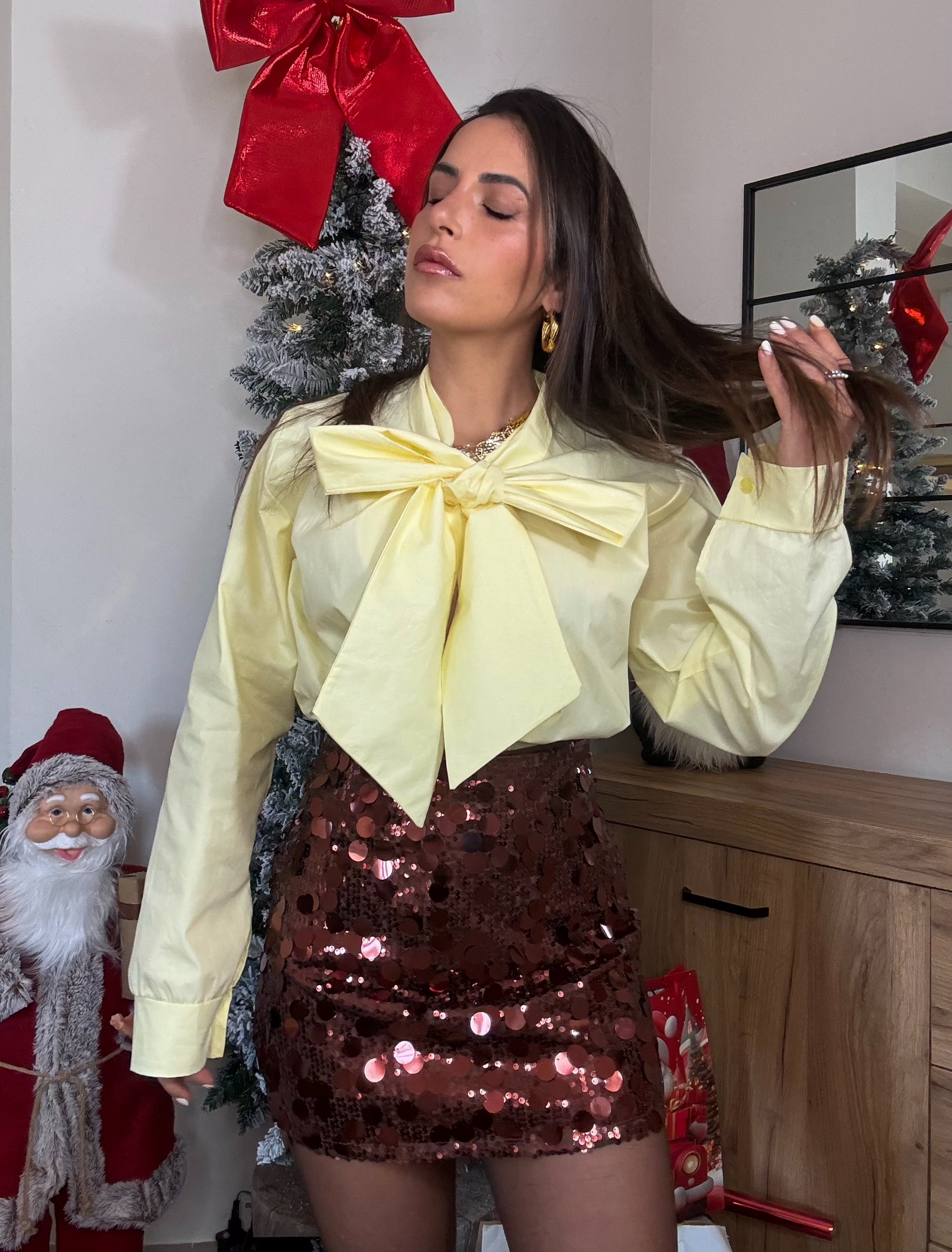 Una camicia chic e di tendenza, di un giallo luminoso e femminile. Il dettaglio del fiocco al collo che la rende unica. Bellissima da sola , perfetta sotto un gilet , un cardigan o giacca. Un capo versatile che trasforma davvero ogni look. Taglia unica veste fino una L