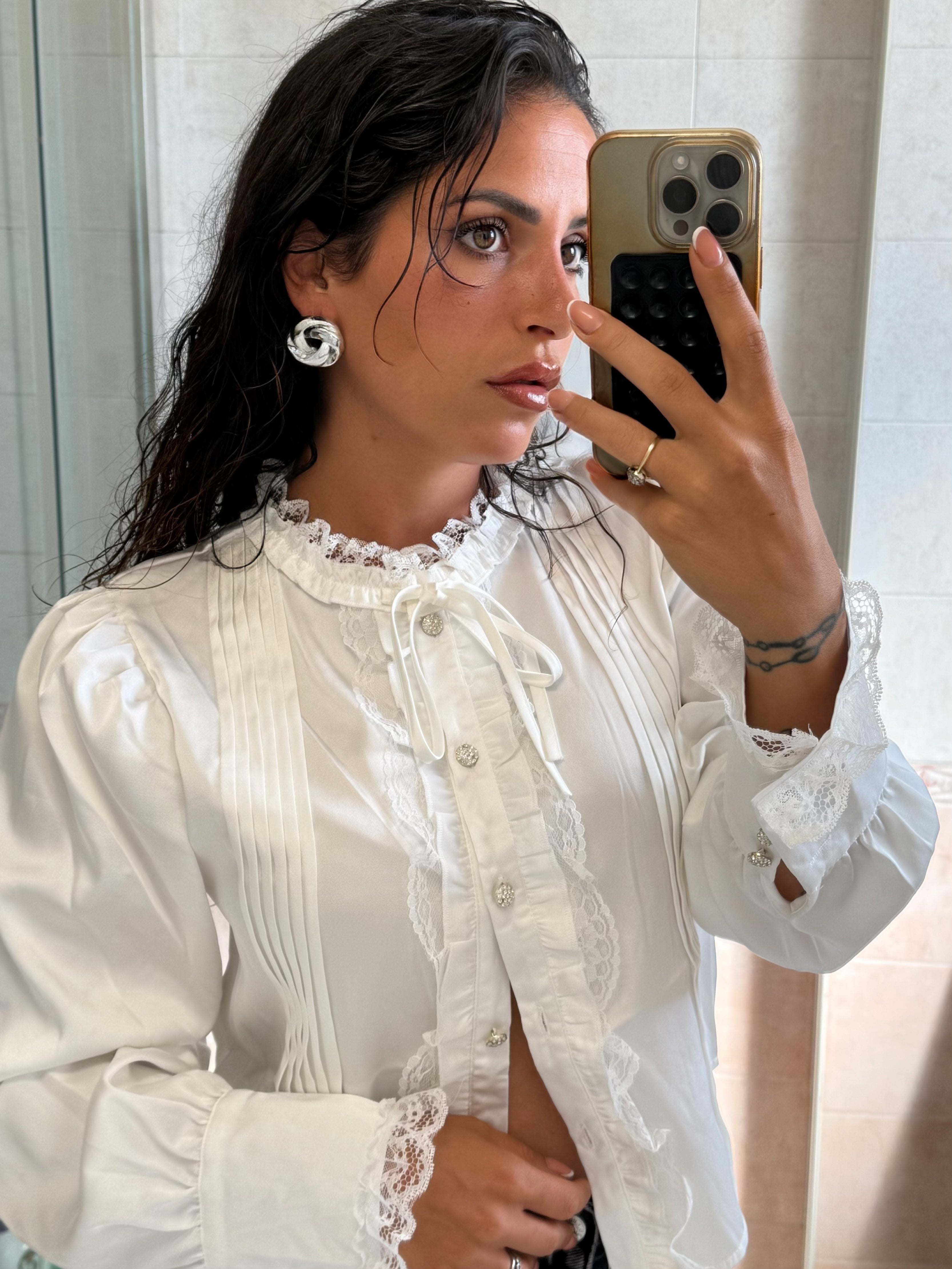 Questa camicia in tessuto in tessuto satinato effetto seta è un vero gioiello . arricciature delicate, bottoni gioiello , inserti in pizzo e nastrino al collo . Le maniche a sbuffo e il polsino rifinito con merletto completano lo stile vintage- chic . Perfetta per : eventi , aperitivi , ufficio .