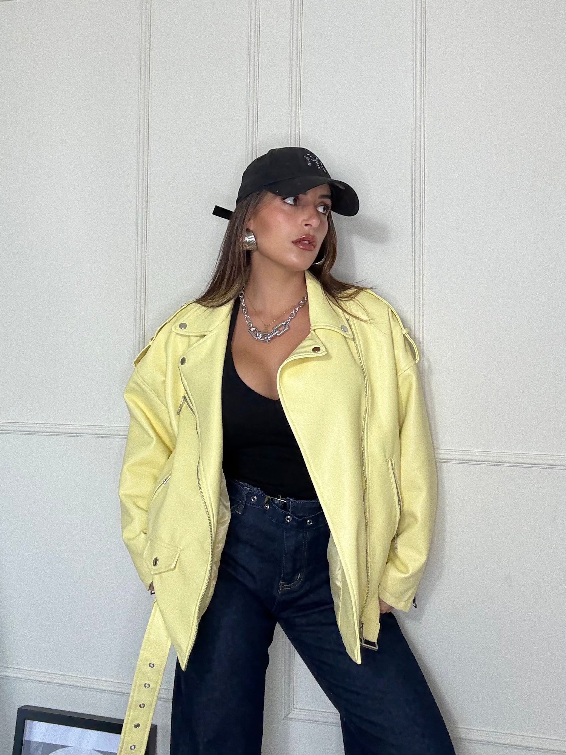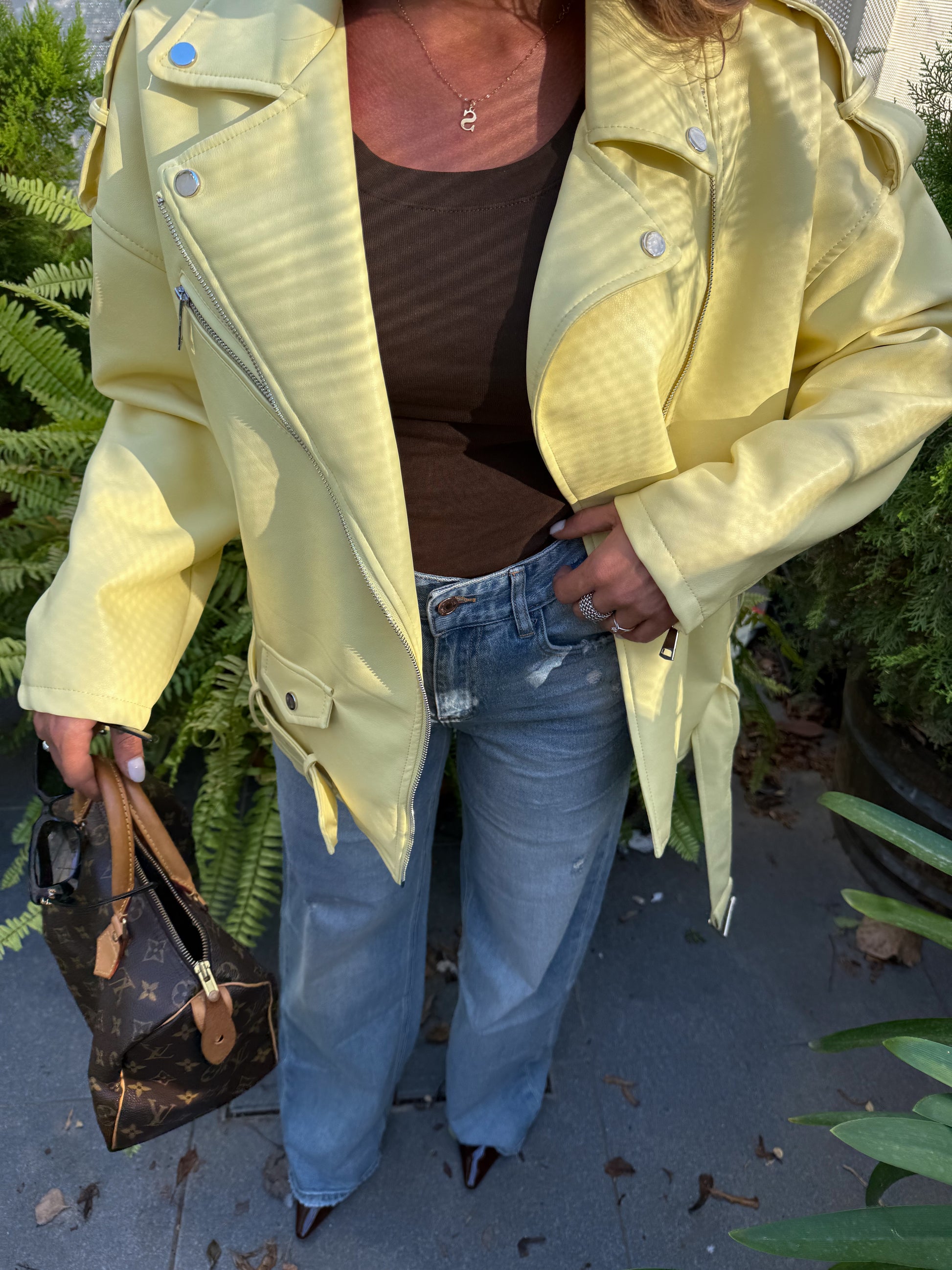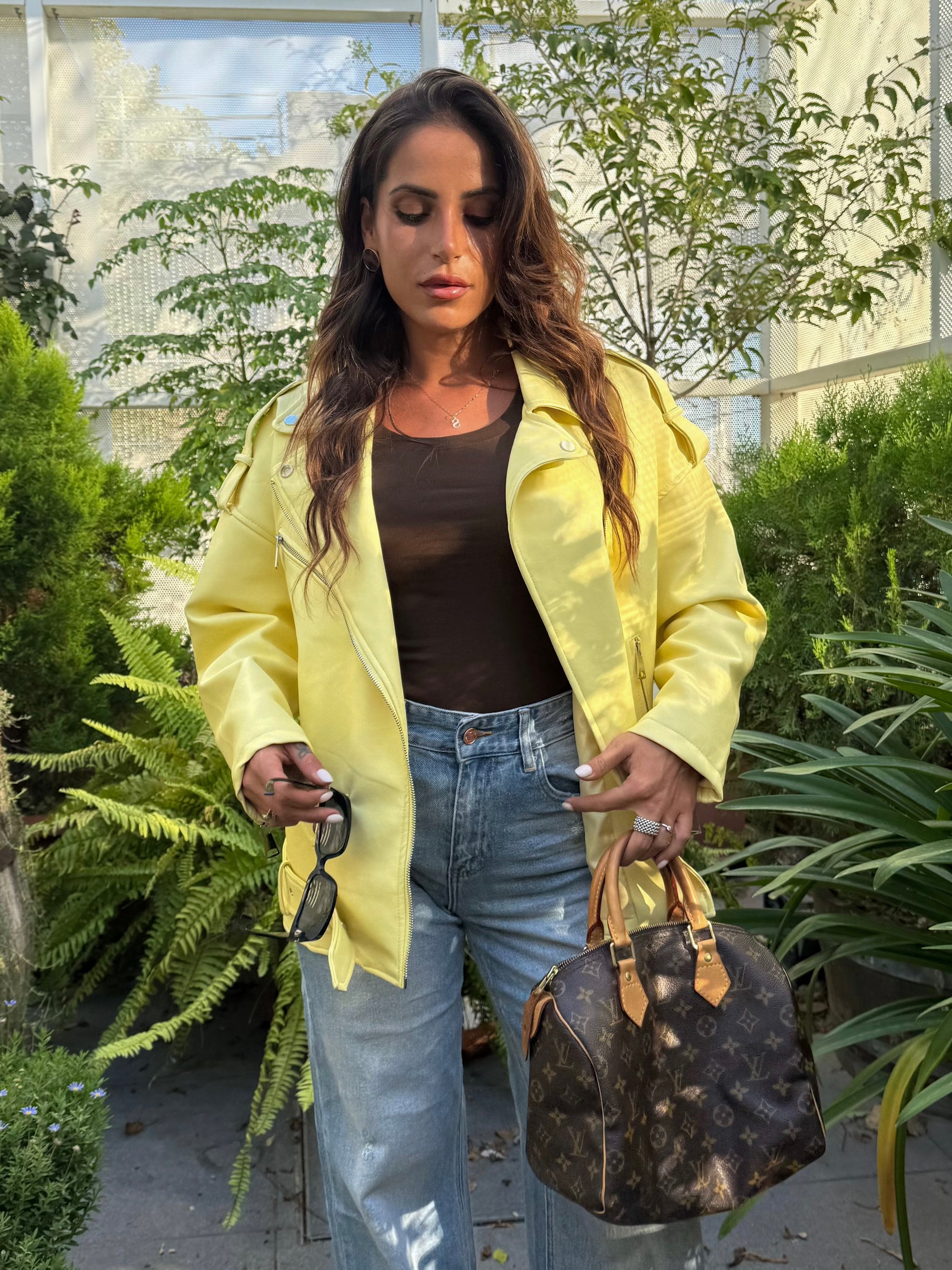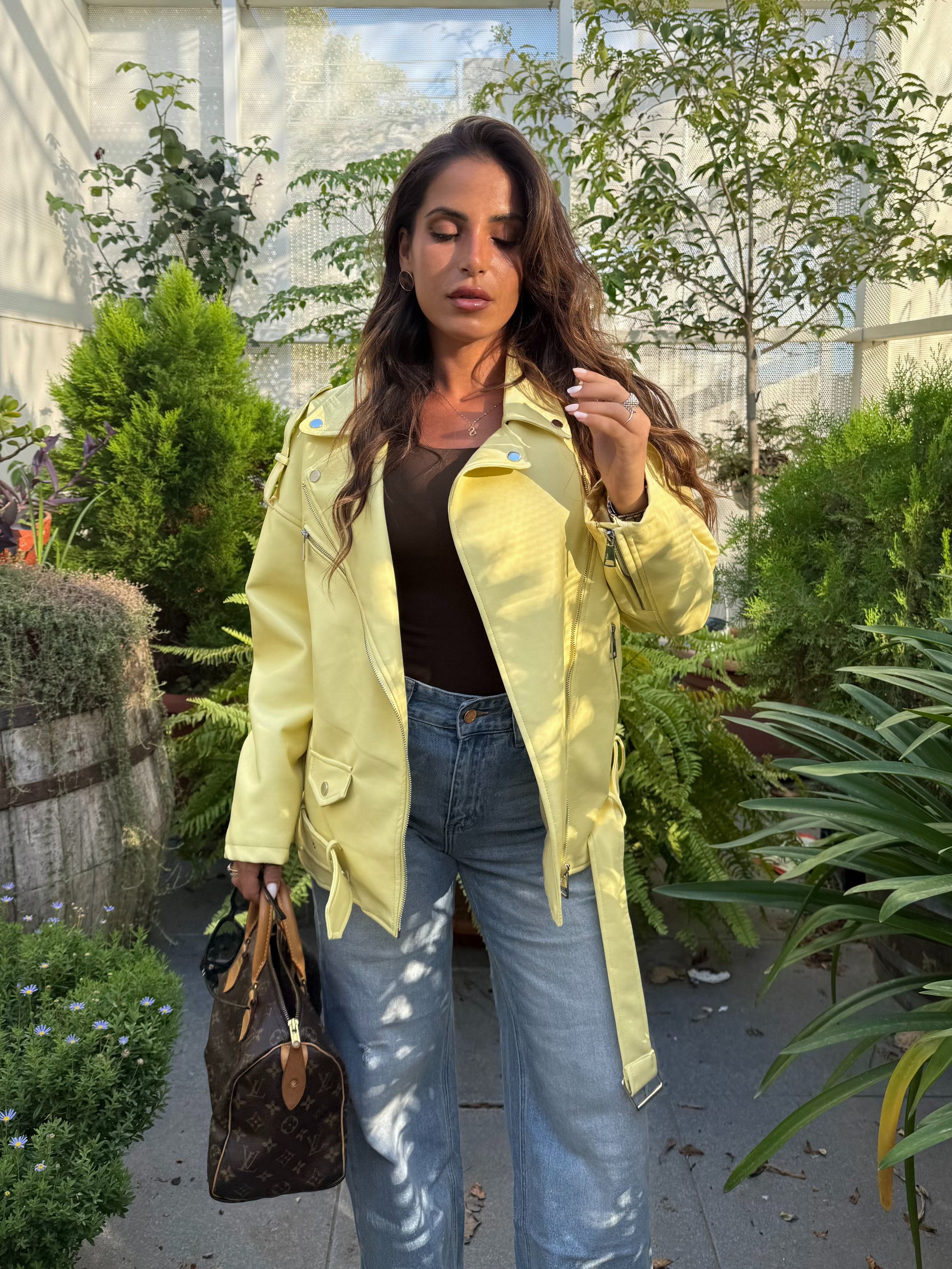Un 'esplosione di stile . Questo chiodo oversize giallo è il capospalla perfetto per dare personalità a qualsiasi look . Dal taglio ampio e grintoso si abbina facilmente a jeans gonne o abiti ,