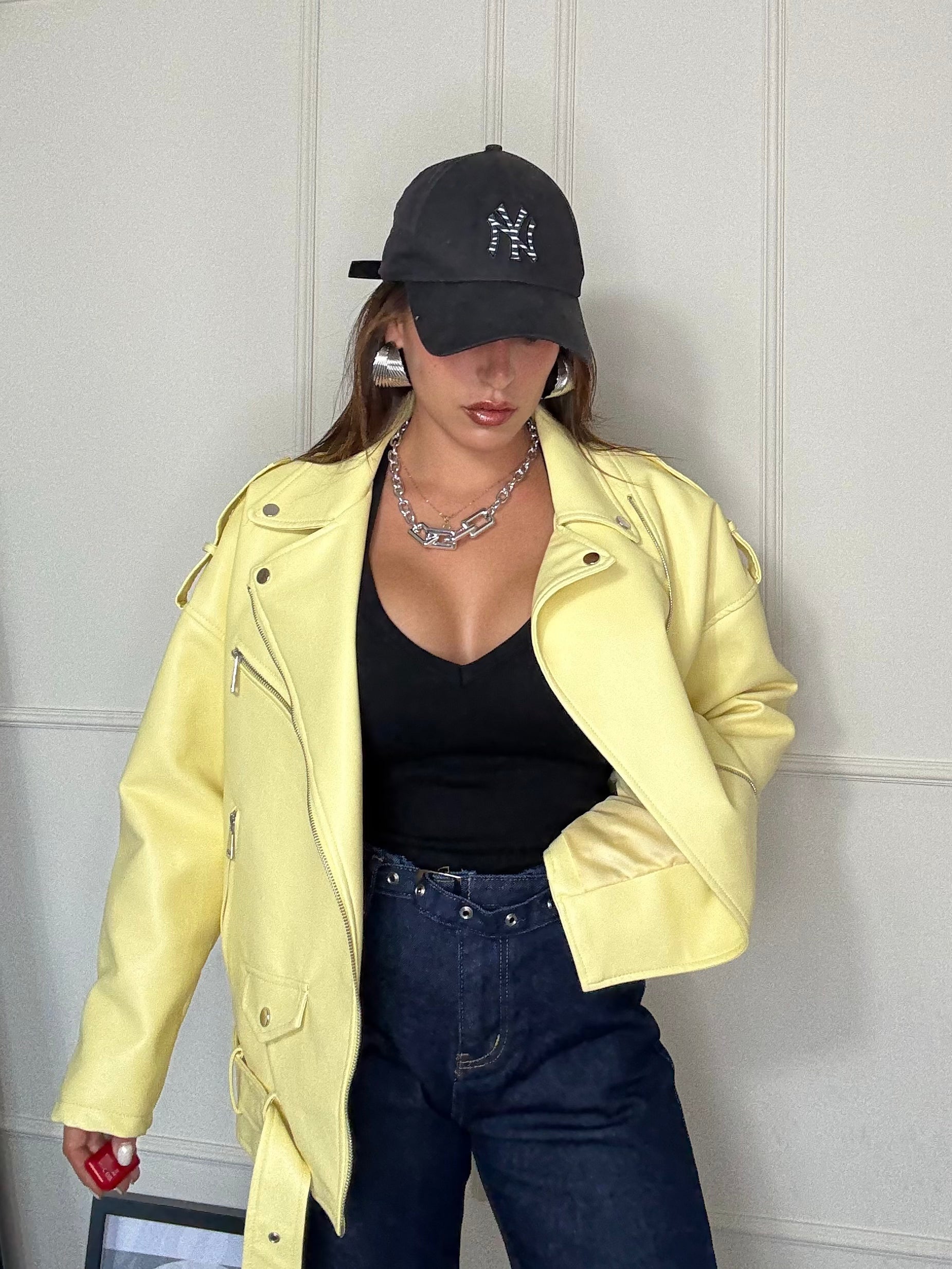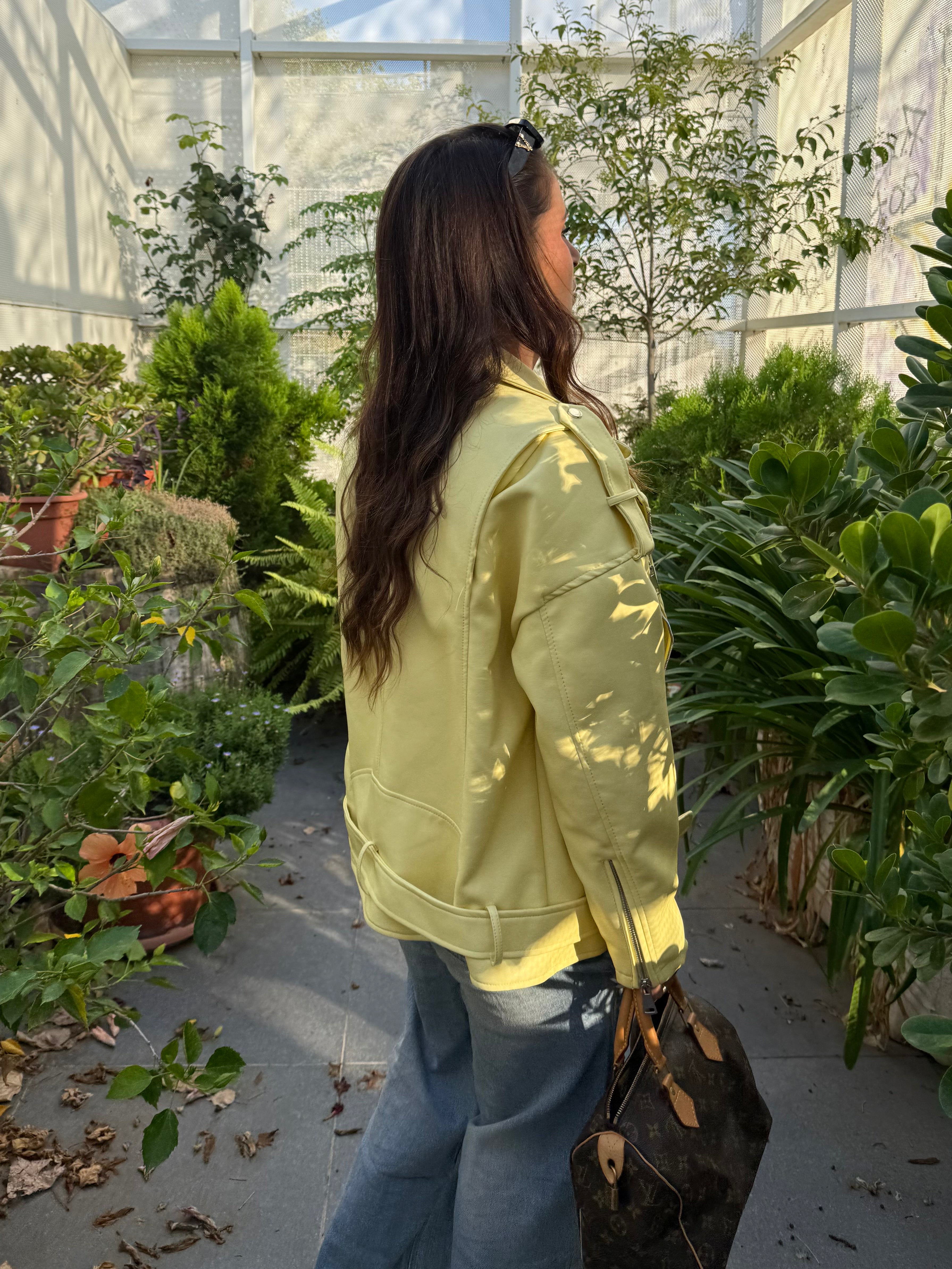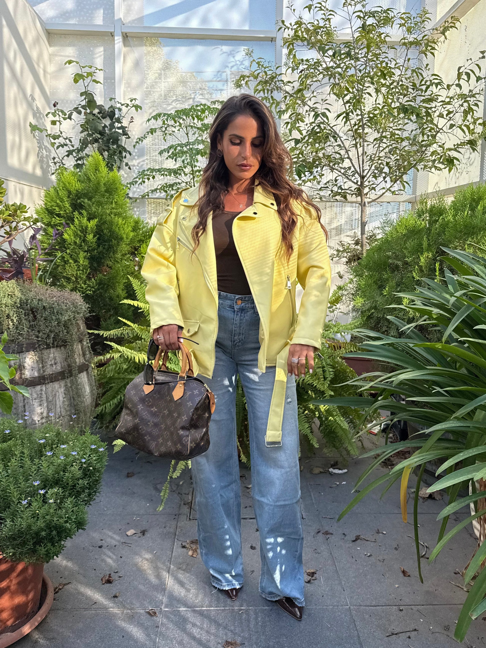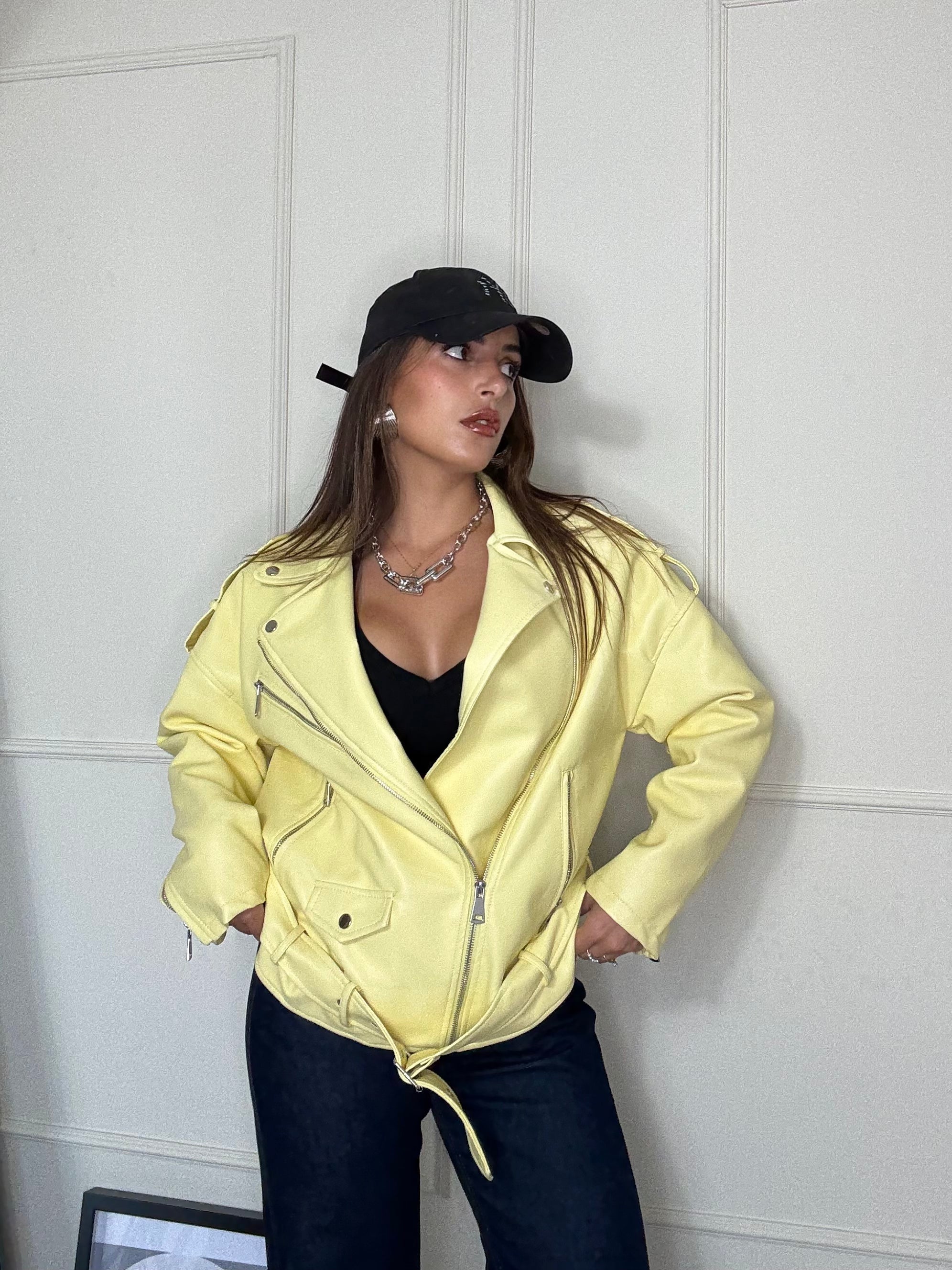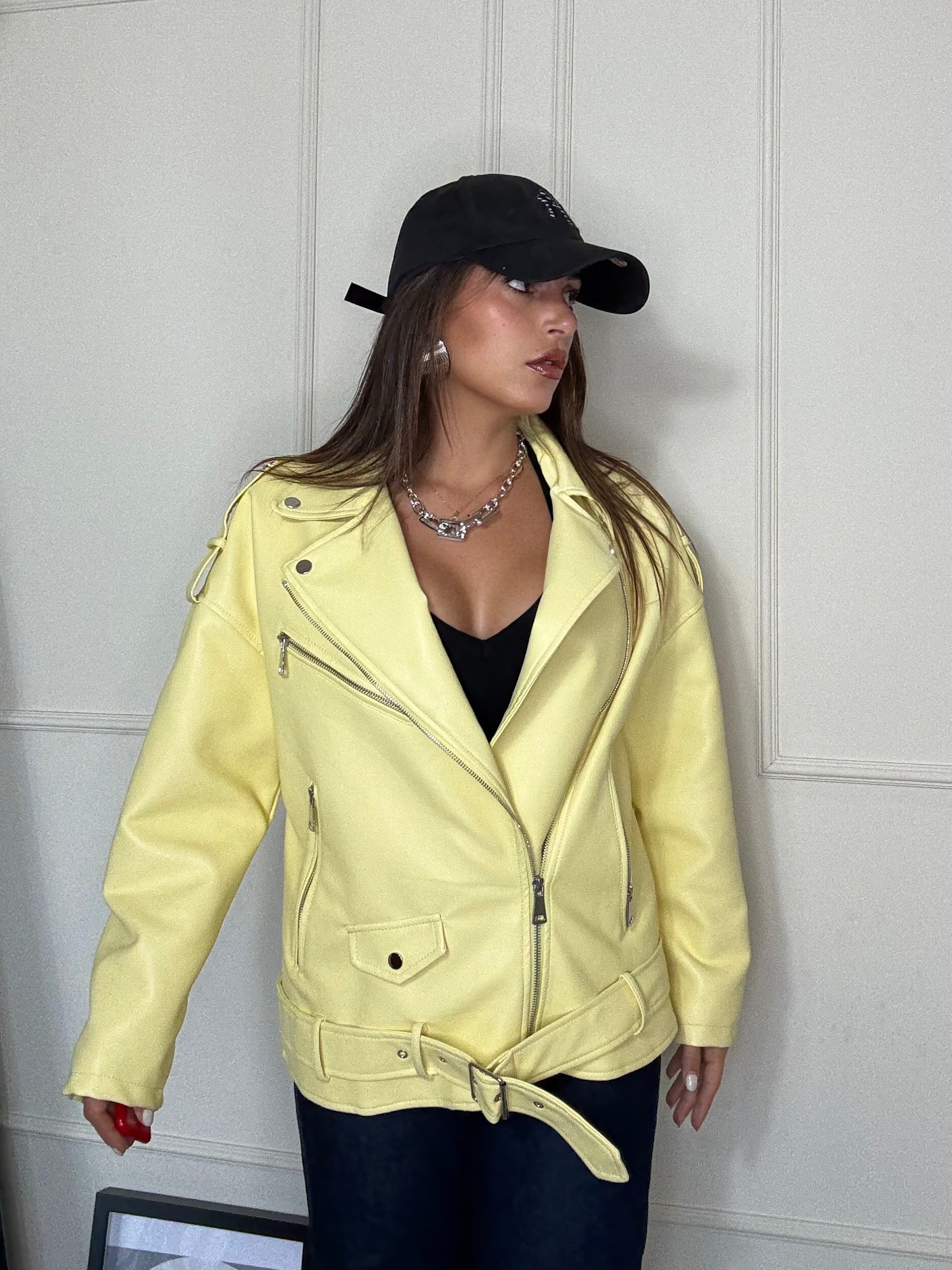 Un 'esplosione di stile . Questo chiodo oversize giallo è il capospalla perfetto per dare personalità a qualsiasi look . Dal taglio ampio e grintoso si abbina facilmente a jeans gonne o abiti ,