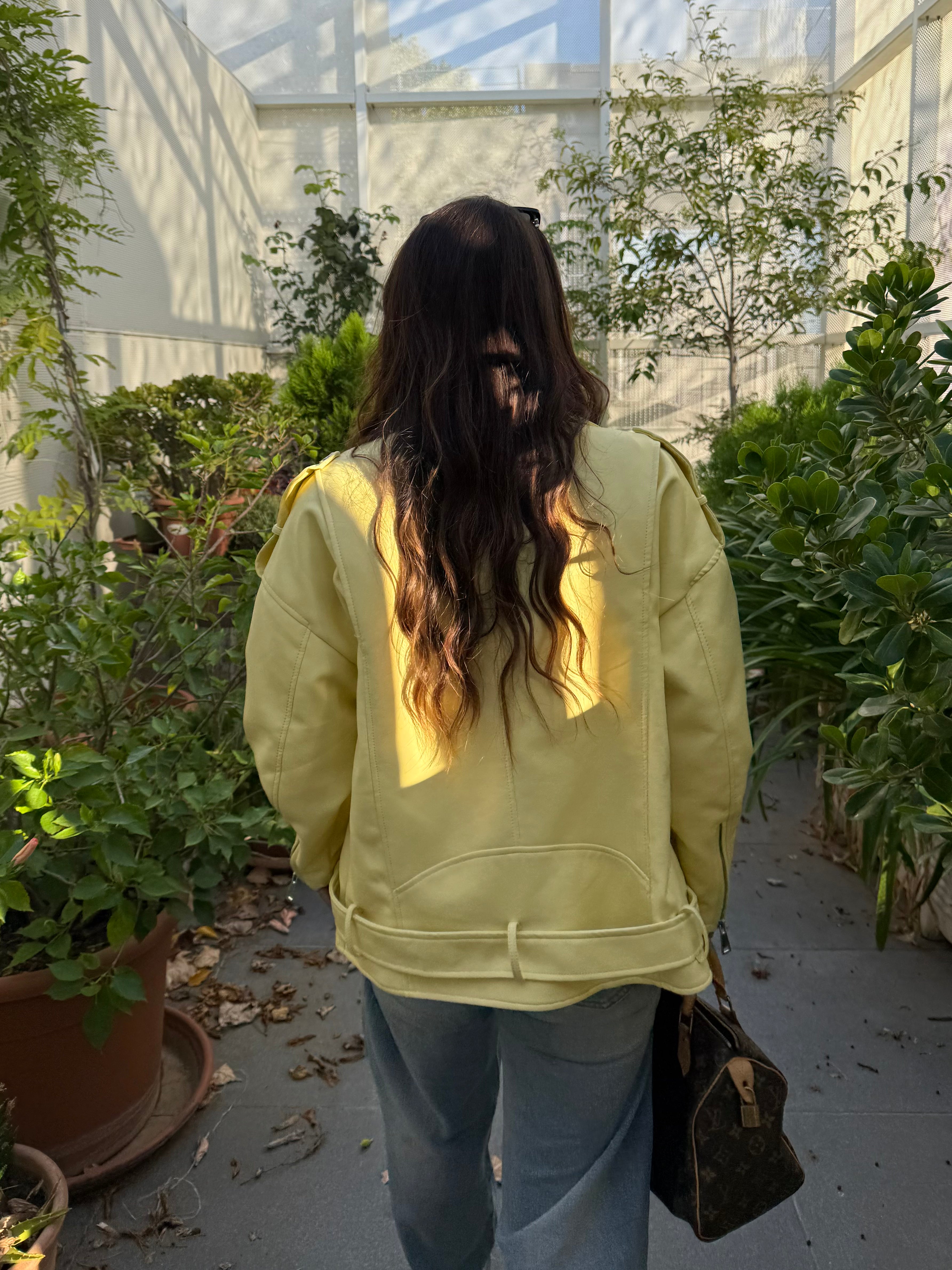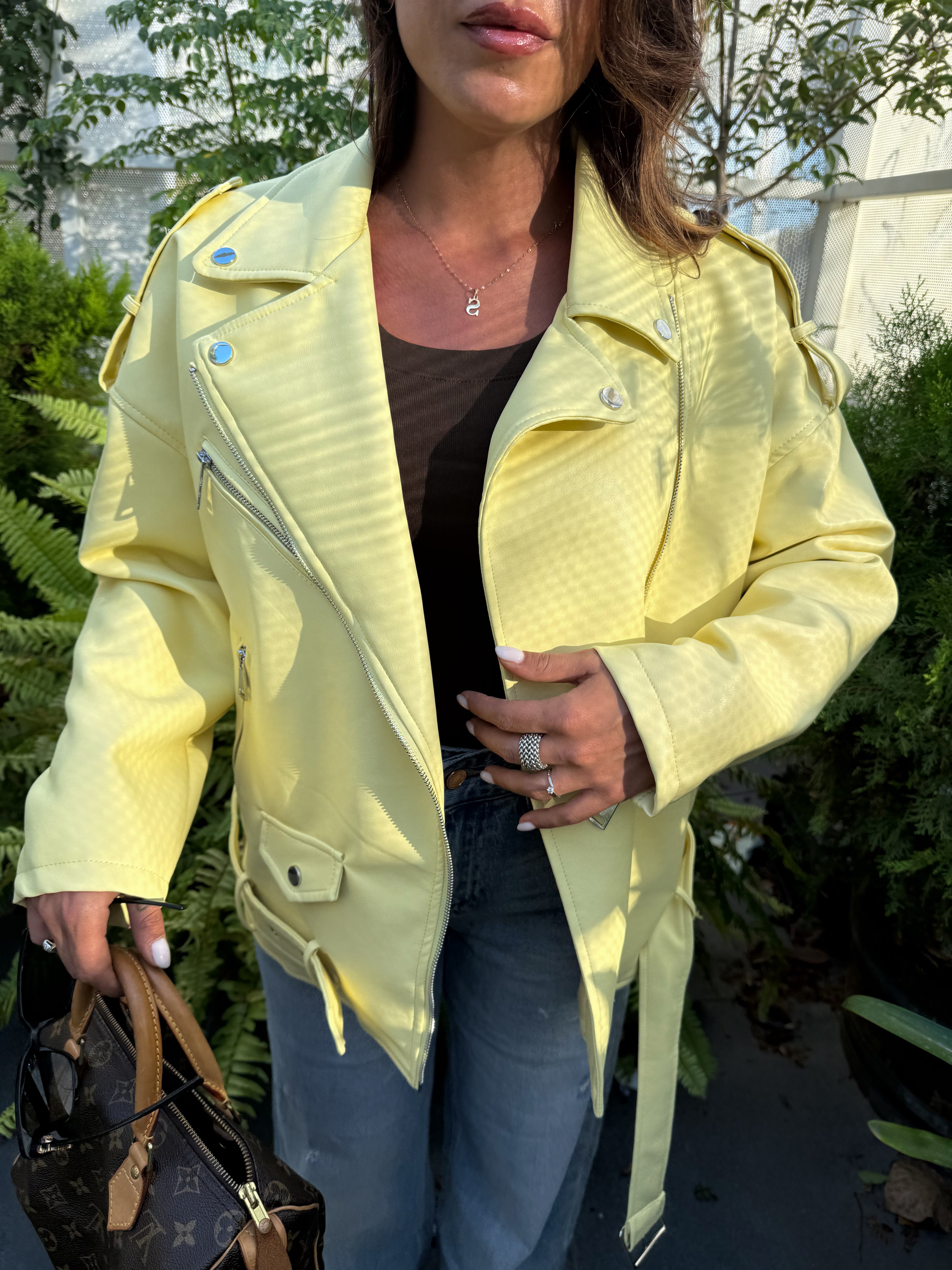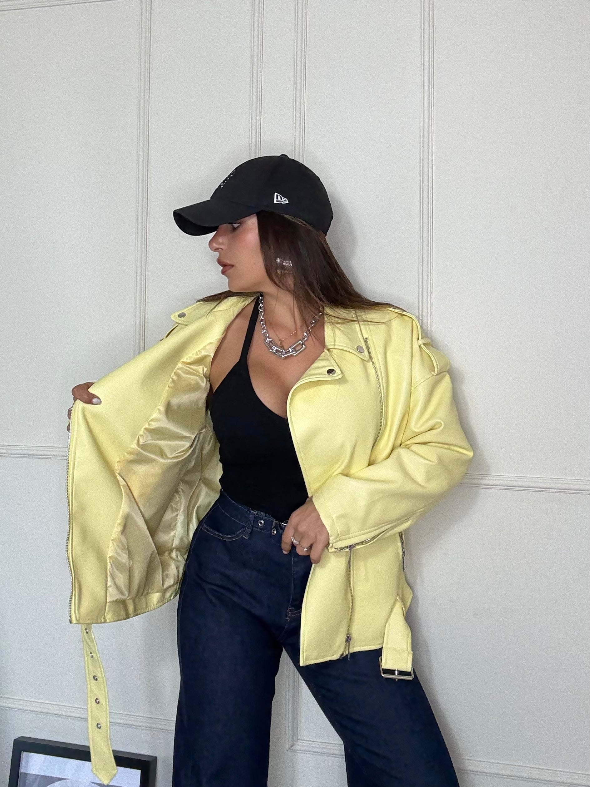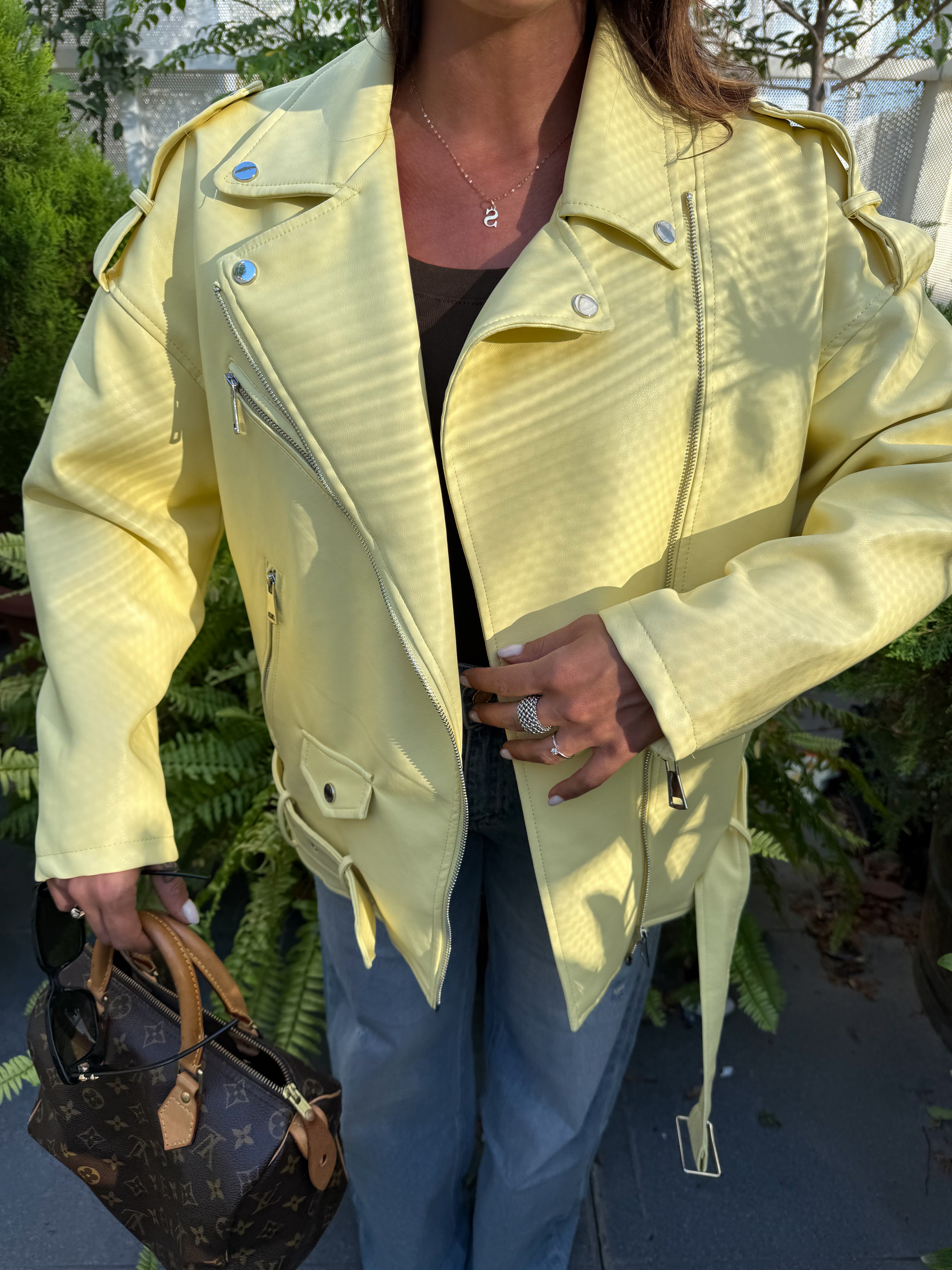 Un 'esplosione di stile . Questo chiodo oversize giallo è il capospalla perfetto per dare personalità a qualsiasi look . Dal taglio ampio e grintoso si abbina facilmente a jeans gonne o abiti ,