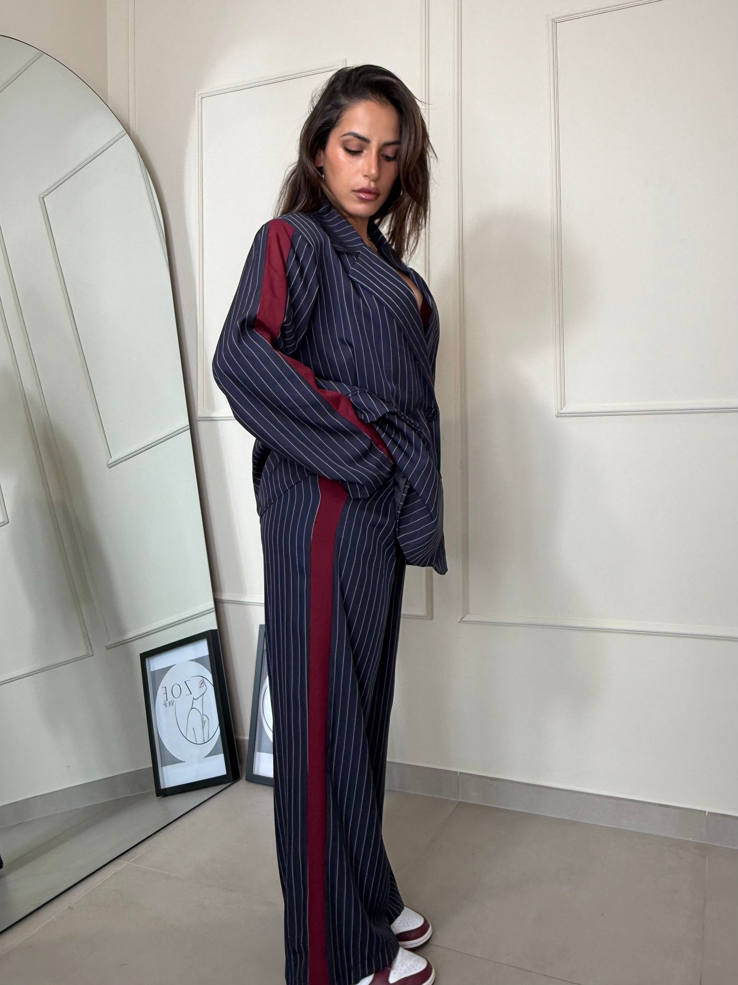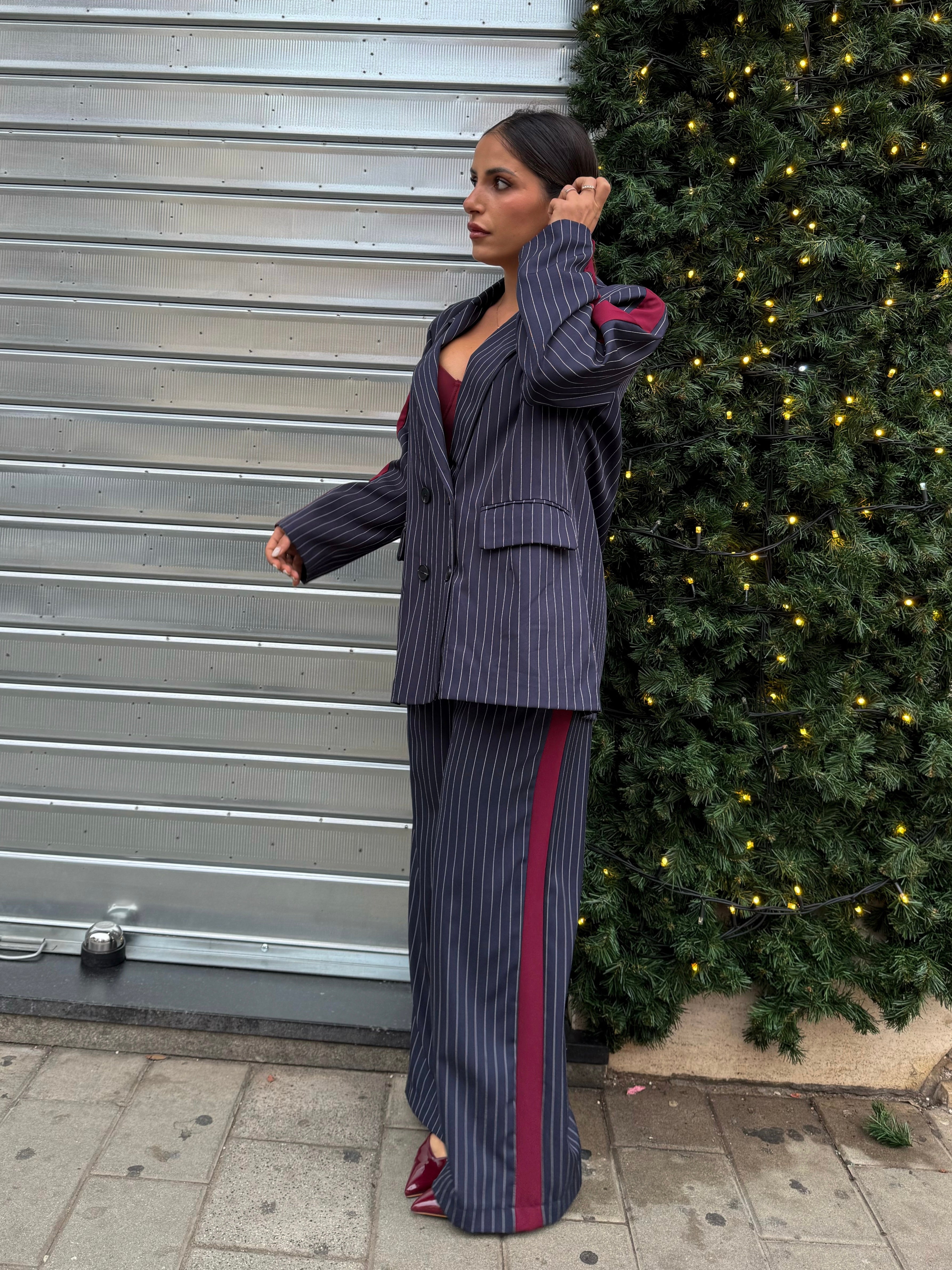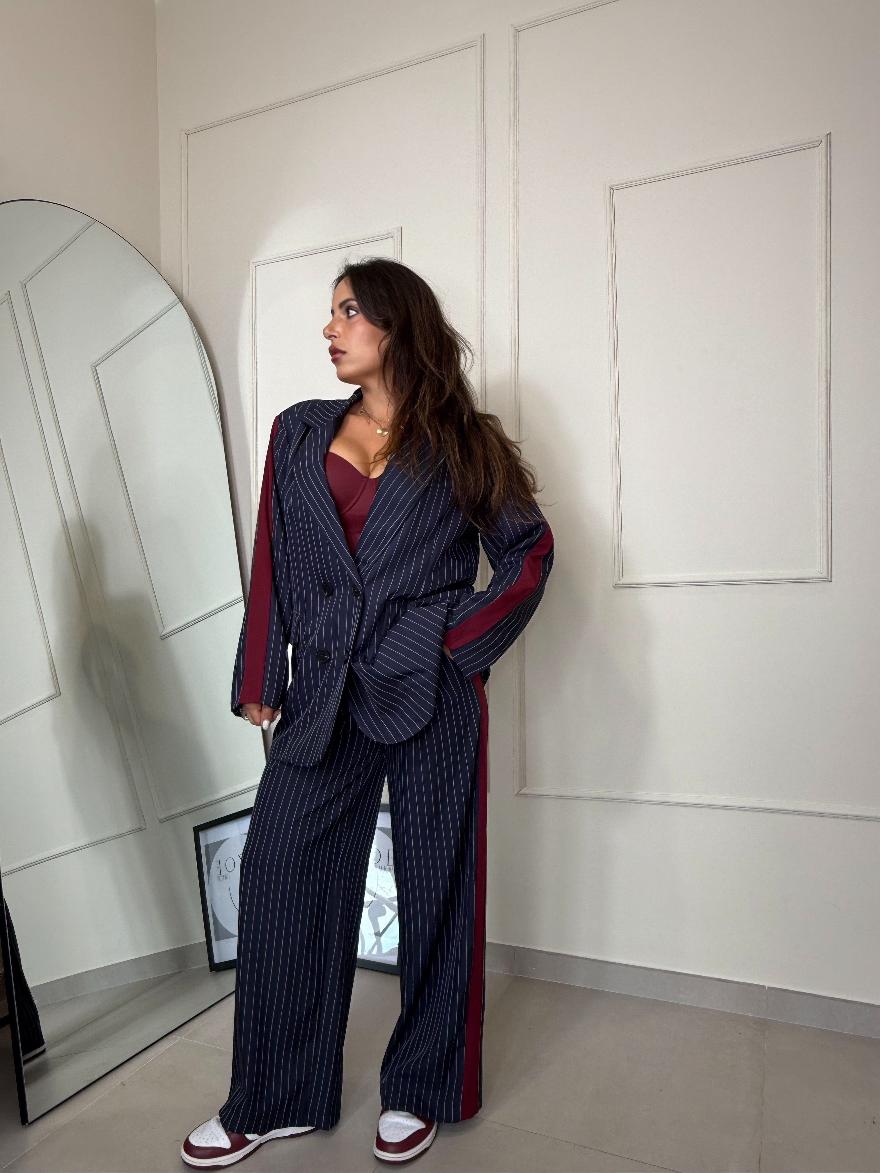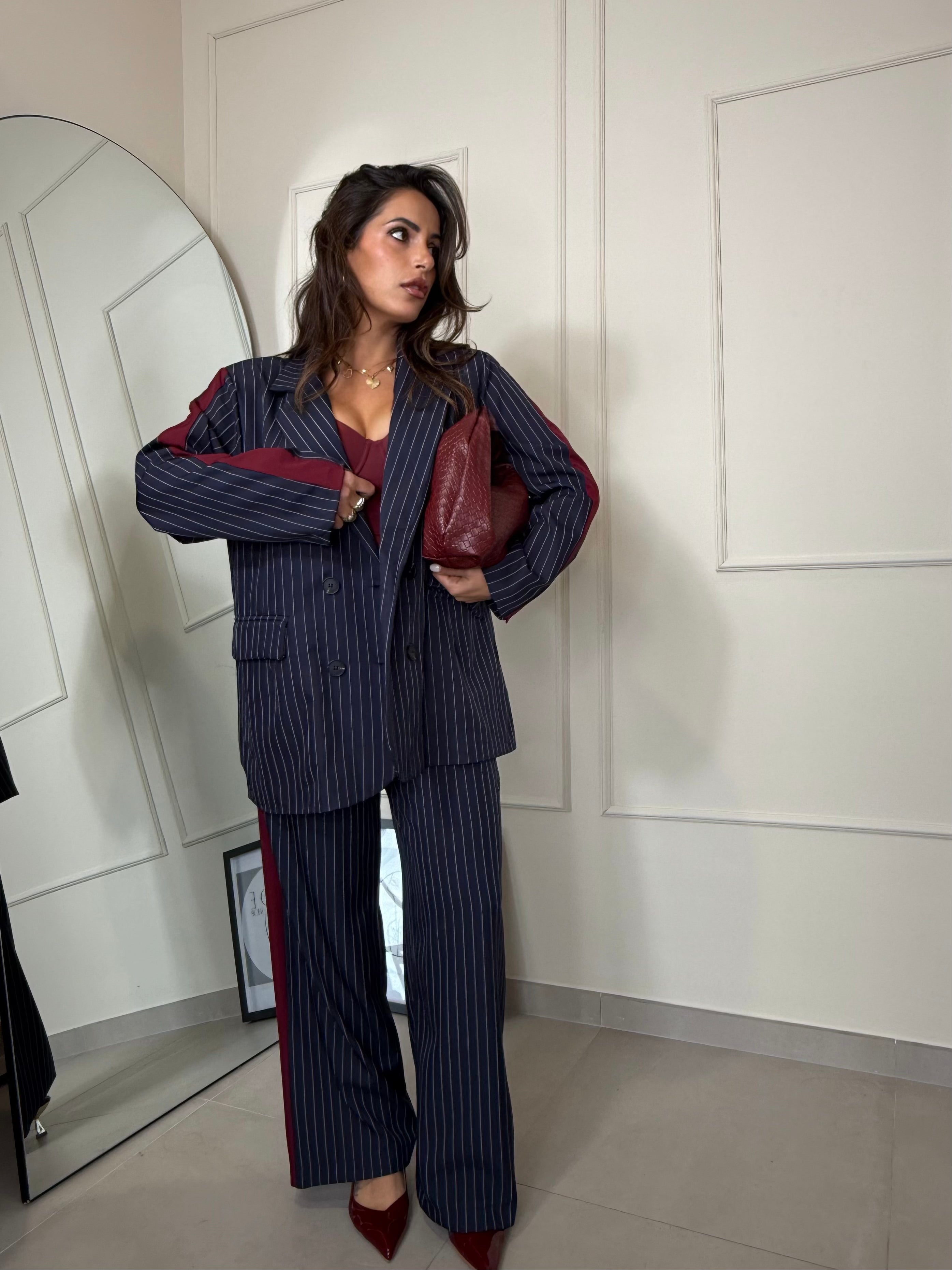 Elegante , moderno e grintoso. Completo gessato blu con dettagli bordeaux, composto da blazer oversize e pantalone dal taglio dritto . Il completo è taglia unica. Sara in foto è alta 1,63