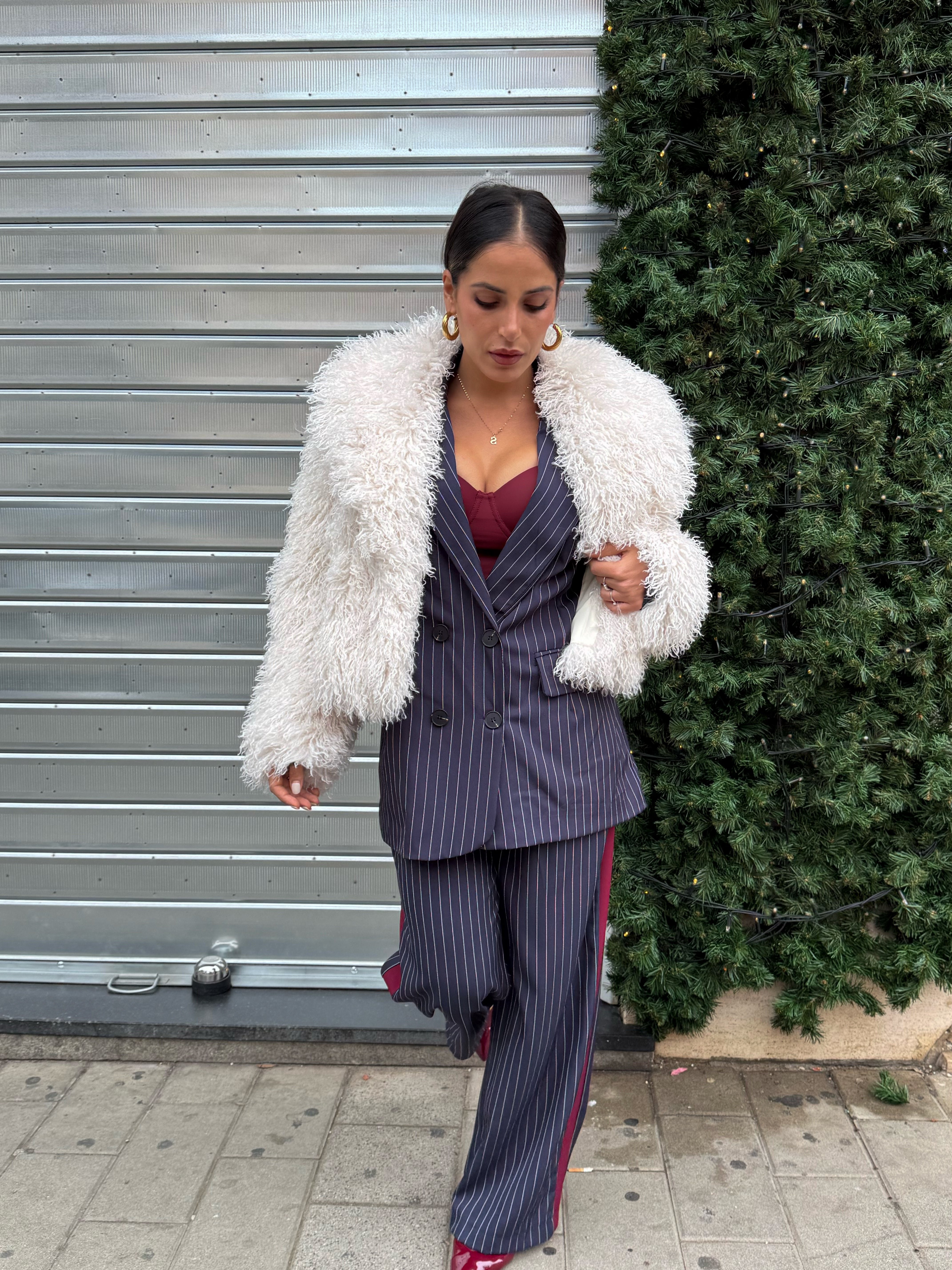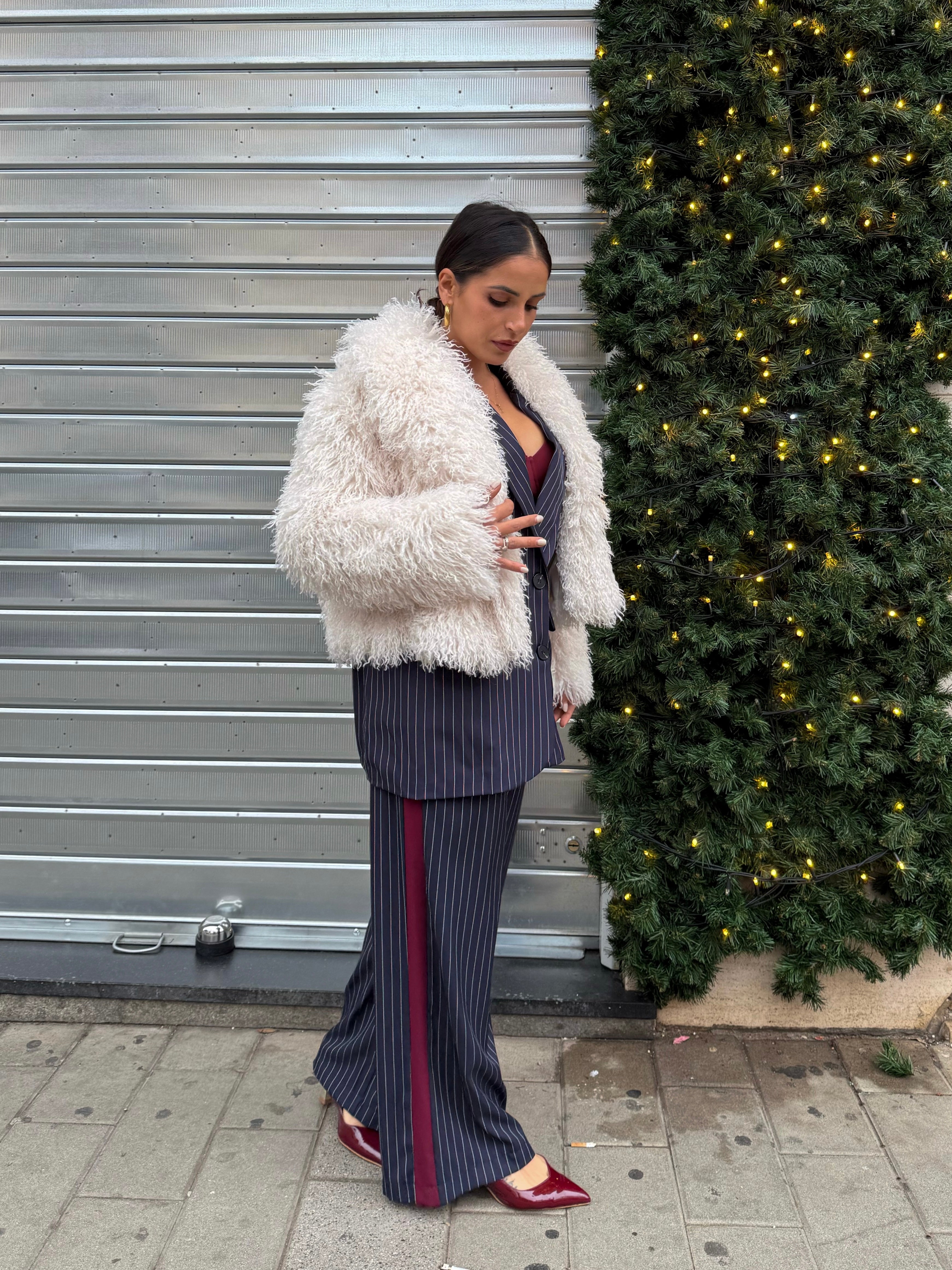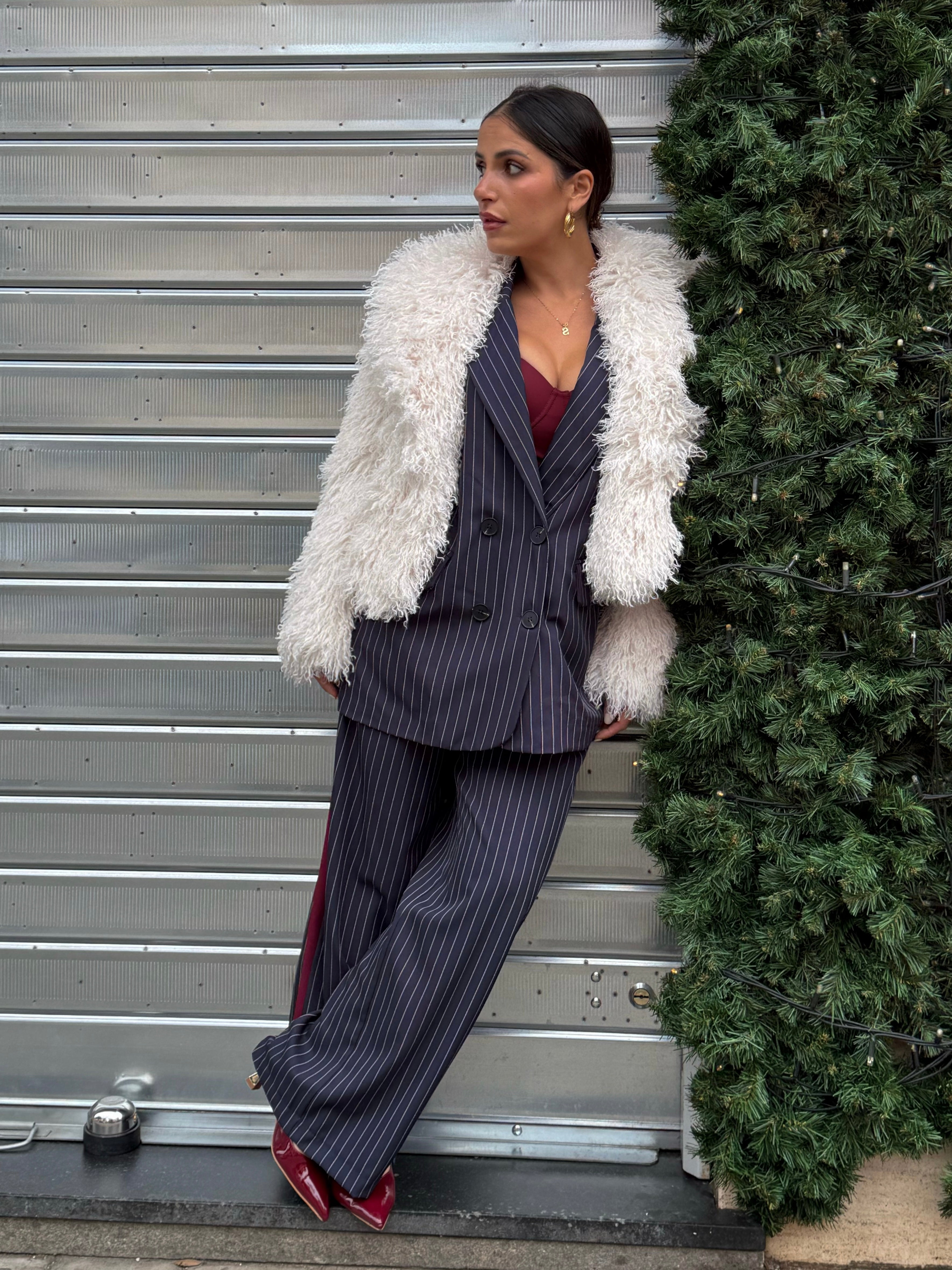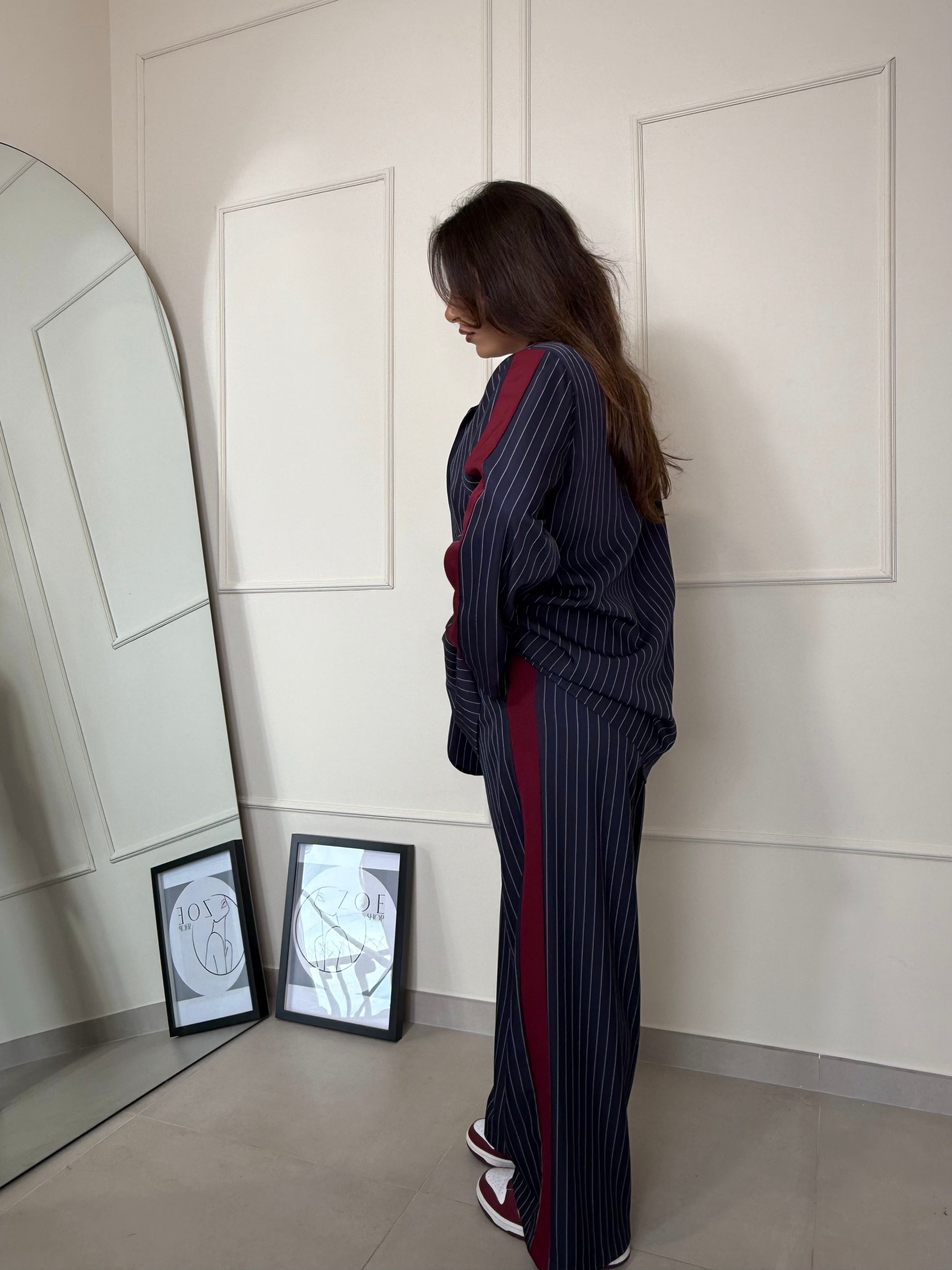 Elegante , moderno e grintoso. Completo gessato blu con dettagli bordeaux, composto da blazer oversize e pantalone dal taglio dritto . Il completo è taglia unica. Sara in foto è alta 1,63