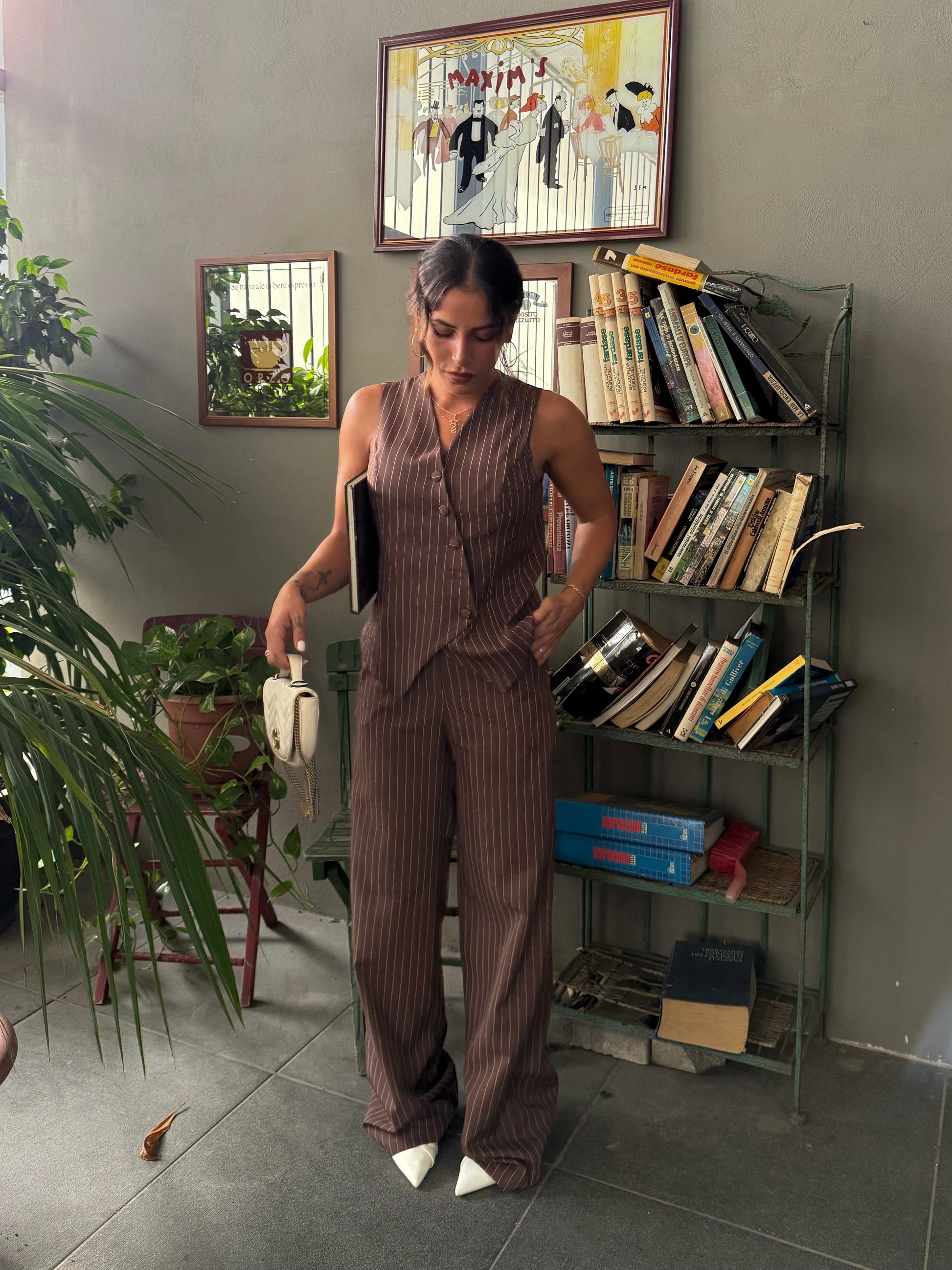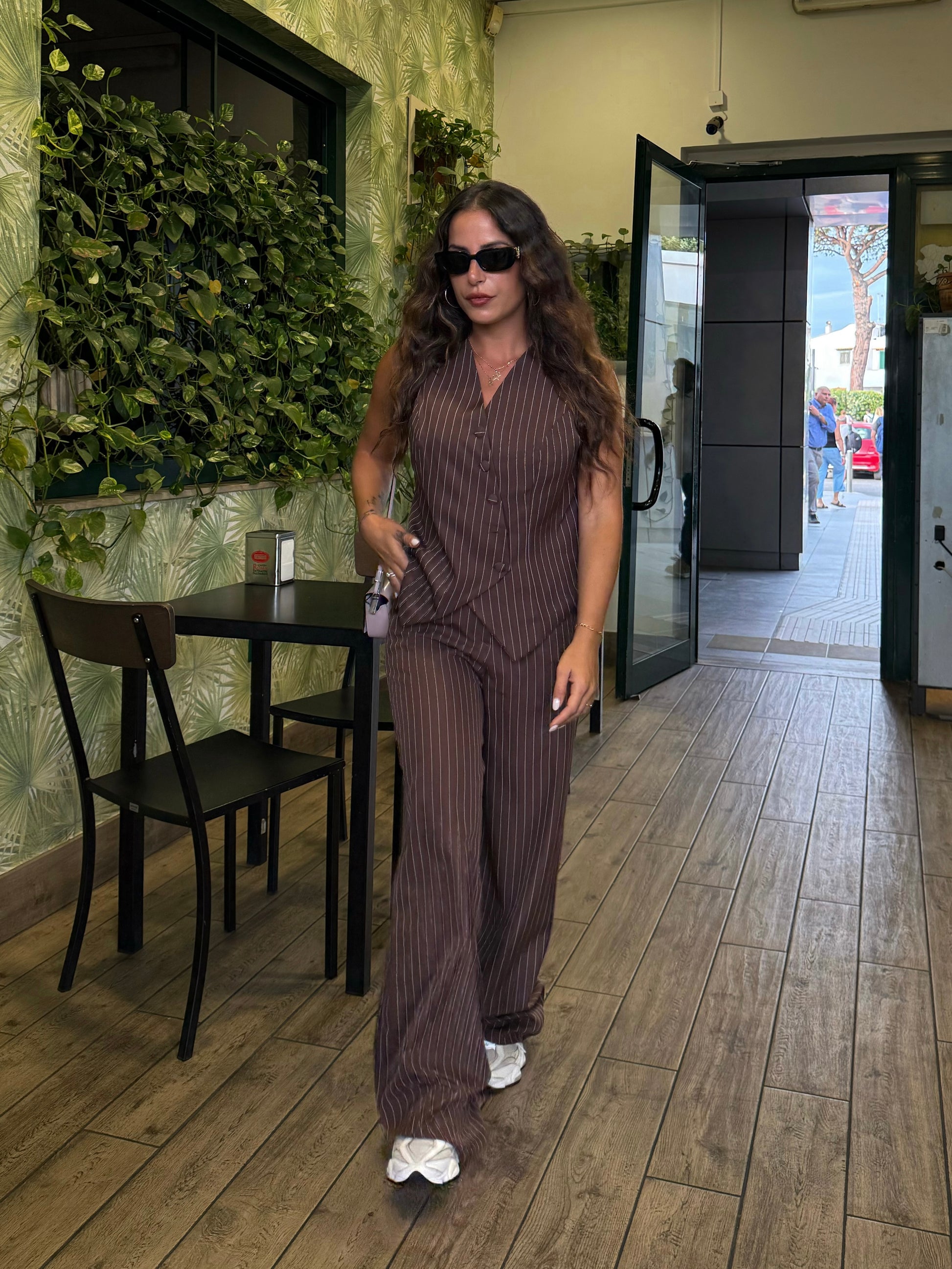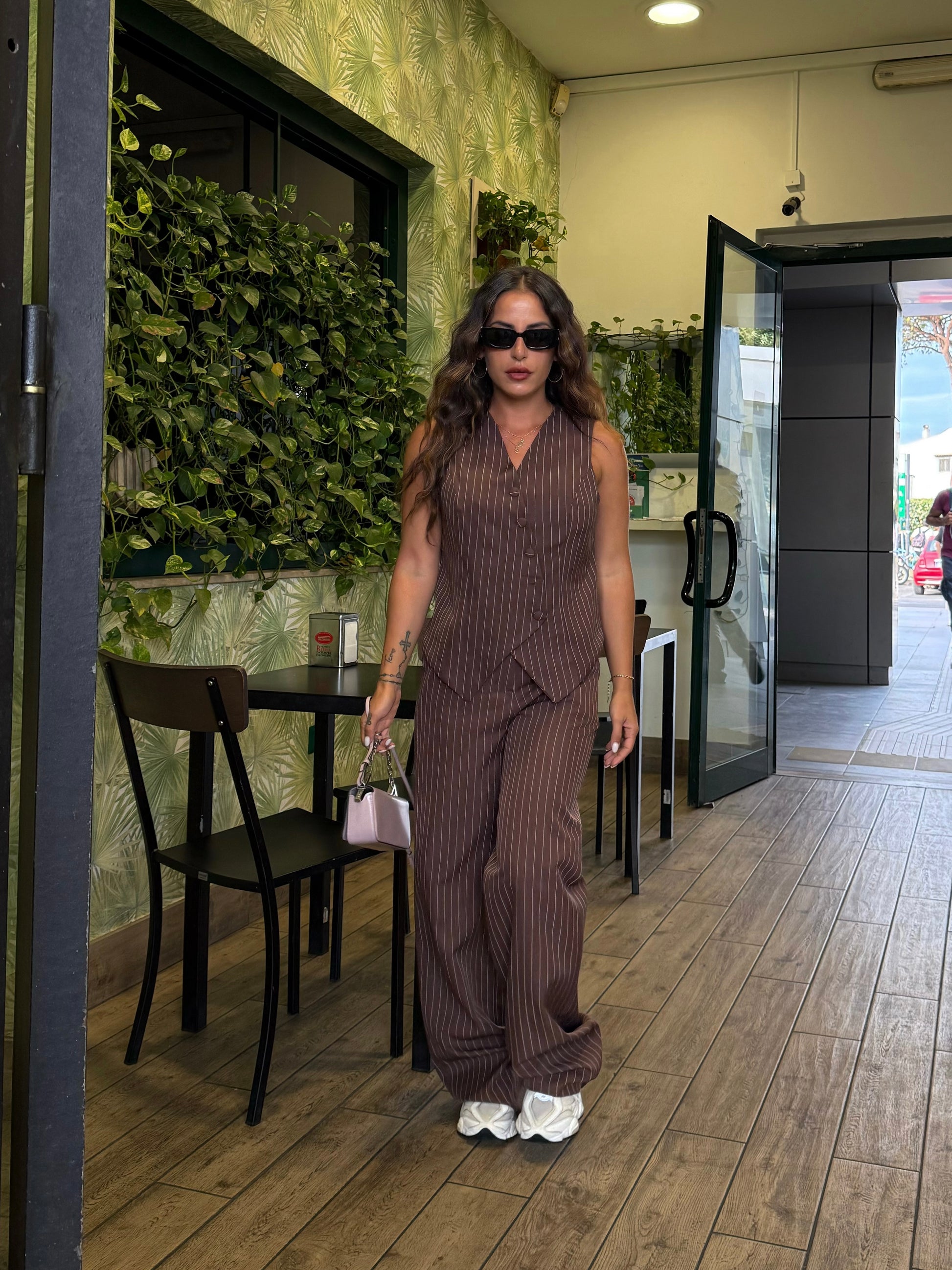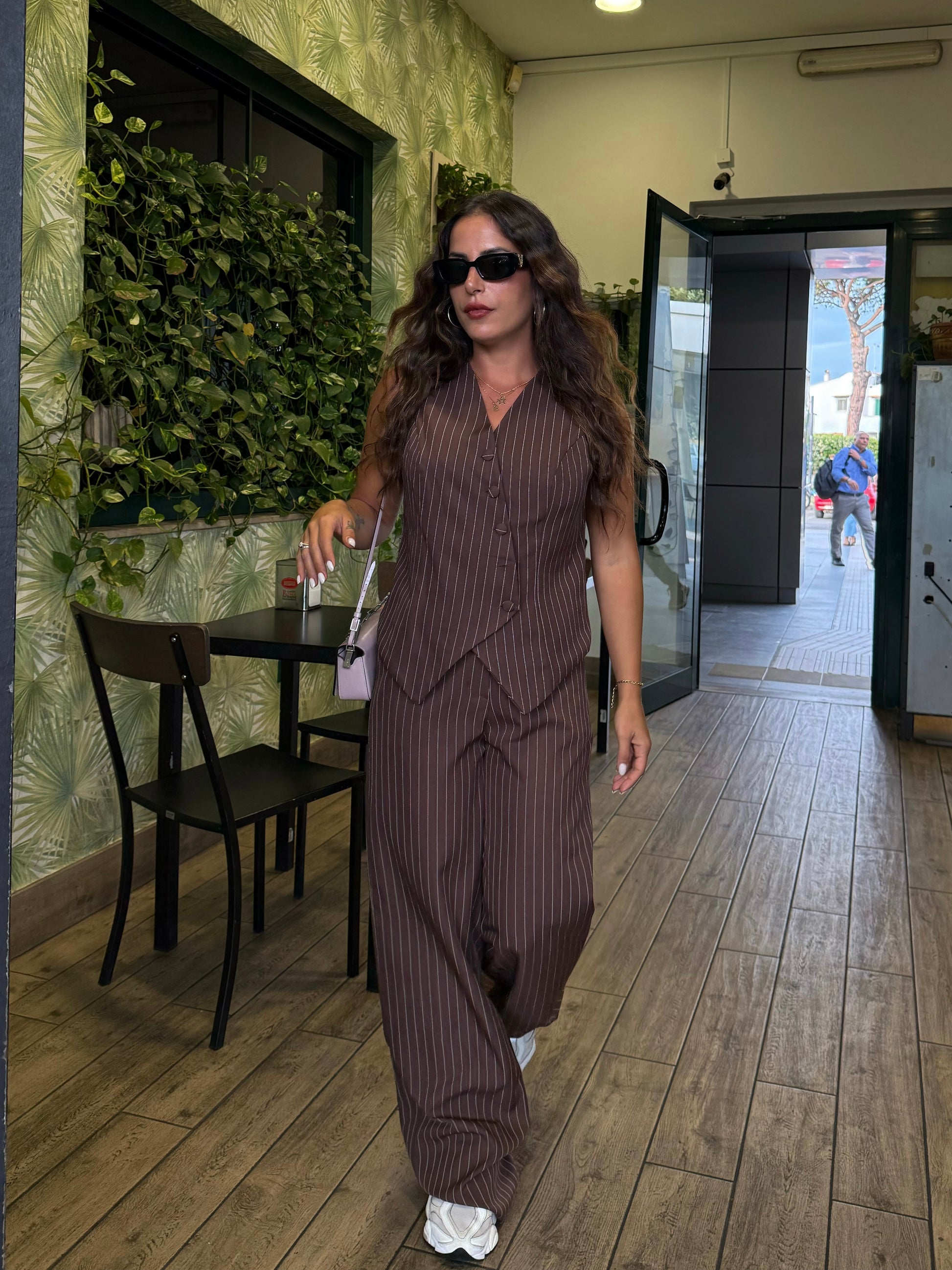 Un completo che unisce stile e praticità . Il gilet davvero particolare , con bottoncini e chiusura asimmetrica , ideale da portare anche con sotto una t shirt , lupetto o camicia.