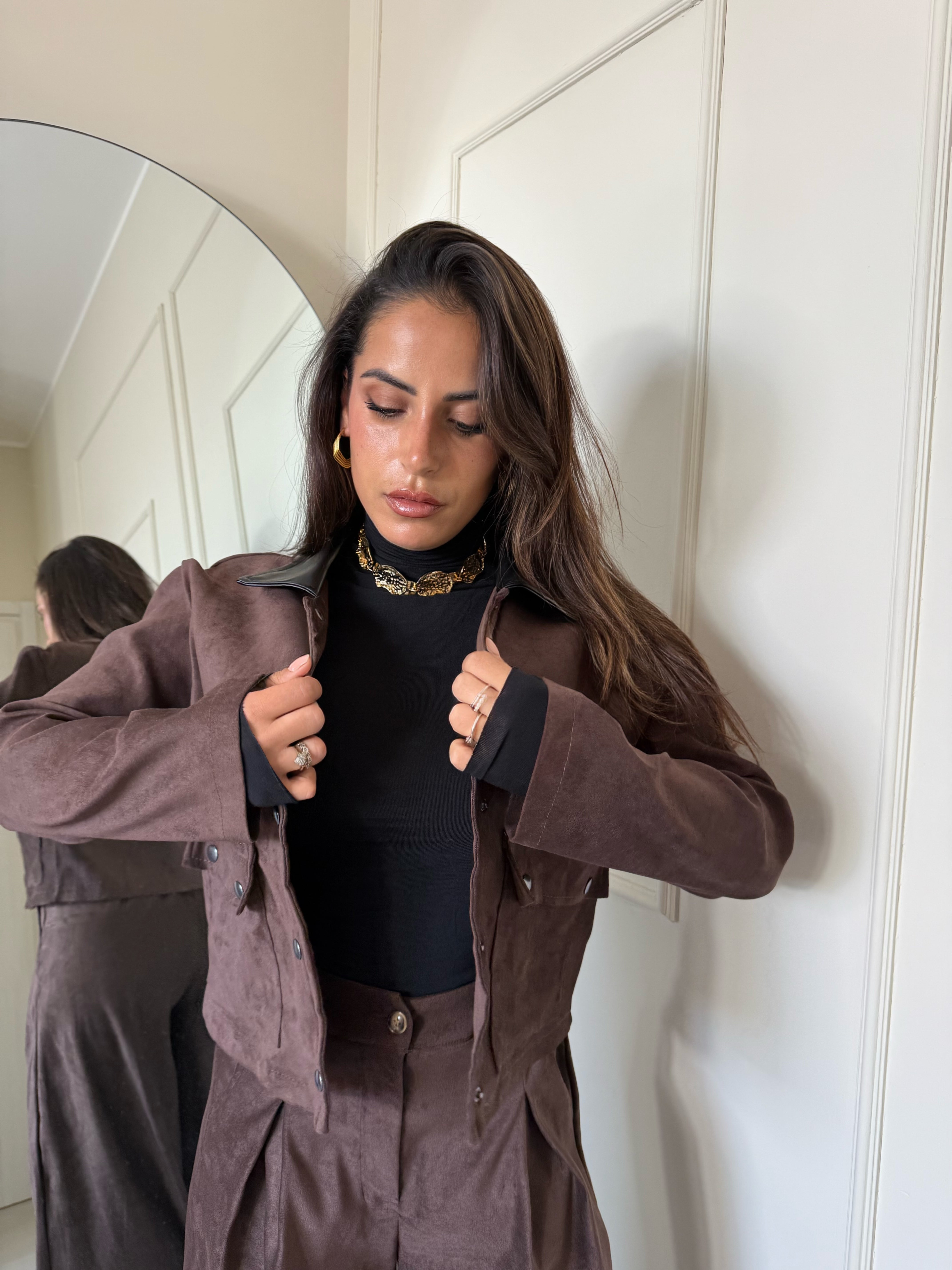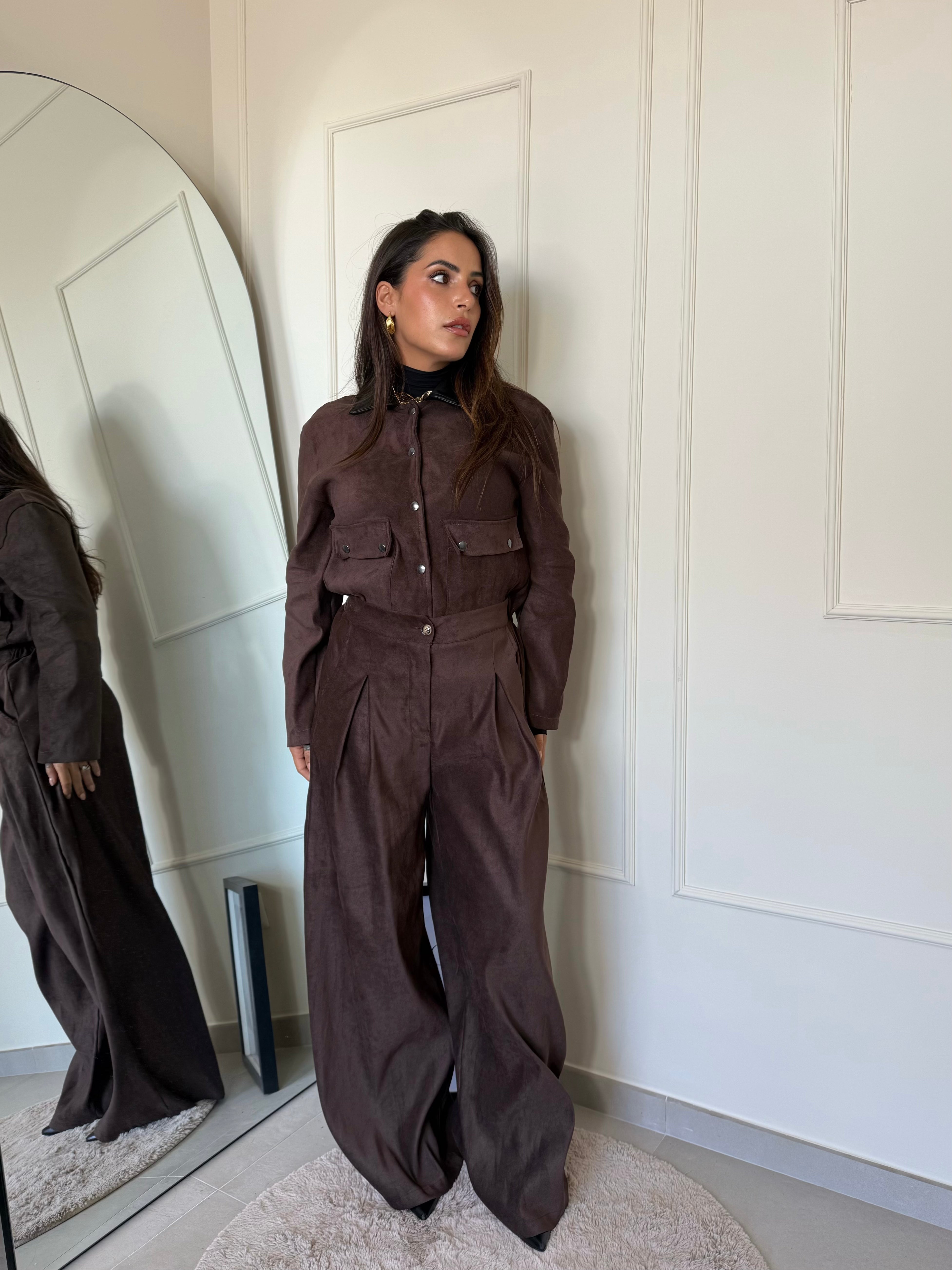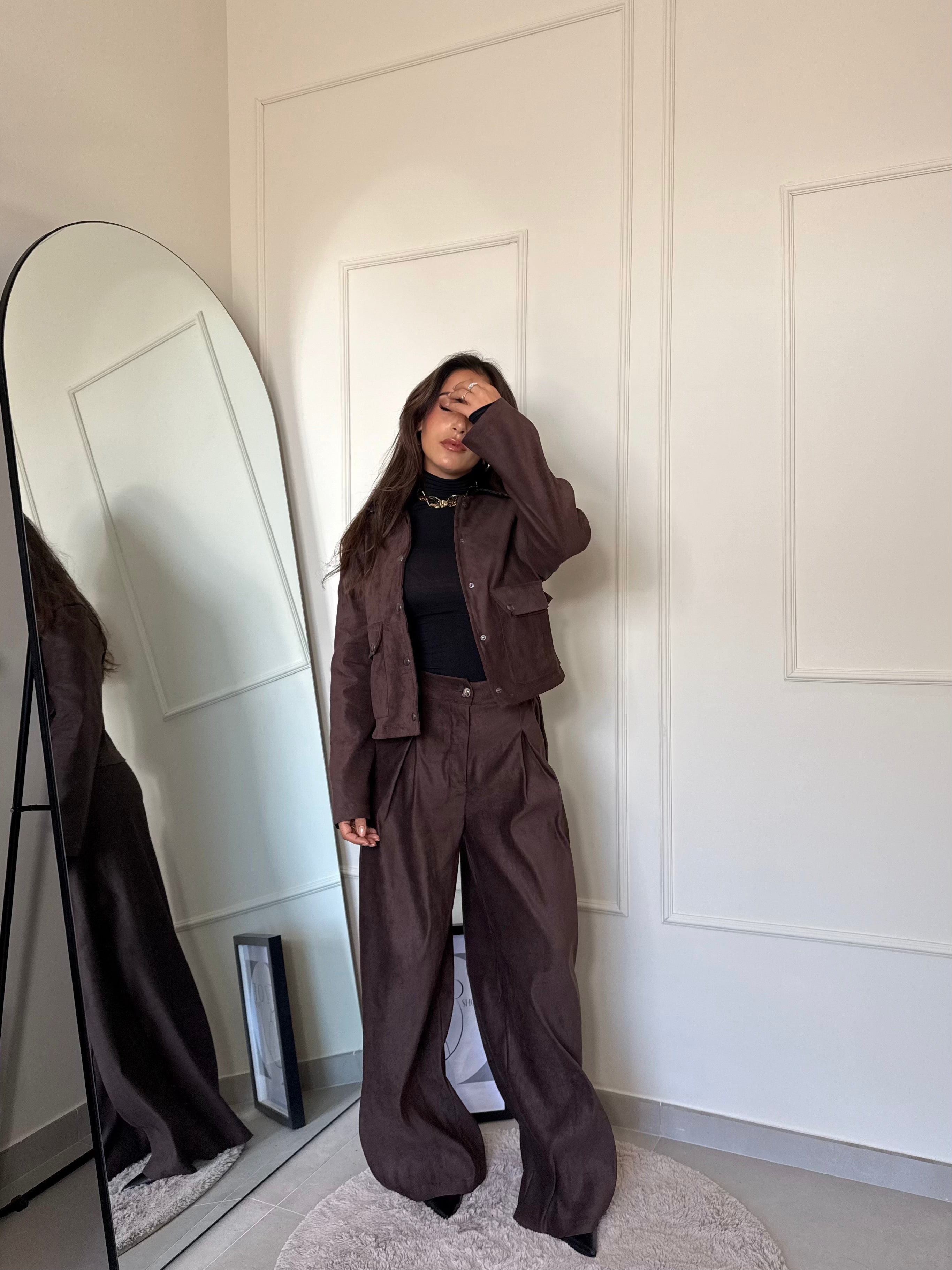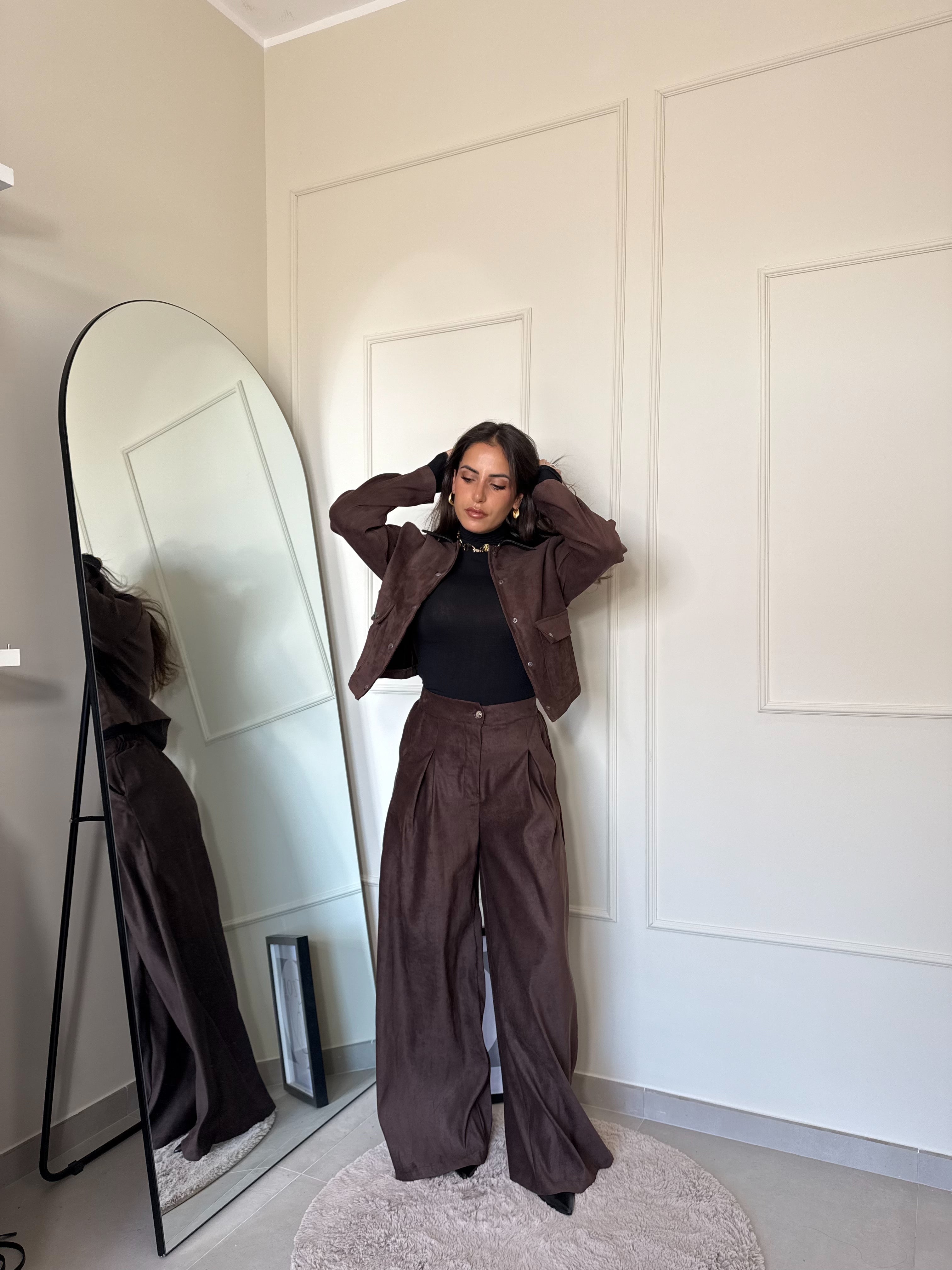 Stile e comfort in un solo look . Pantalone palazzo ampio e fluido, , presenta chiusura con zip e bottone , elastico sul retro . La giacca presenta colletto in ecopelle nero e chiusura con bottoni frontali . Perfetto sia di giorno che di sera .