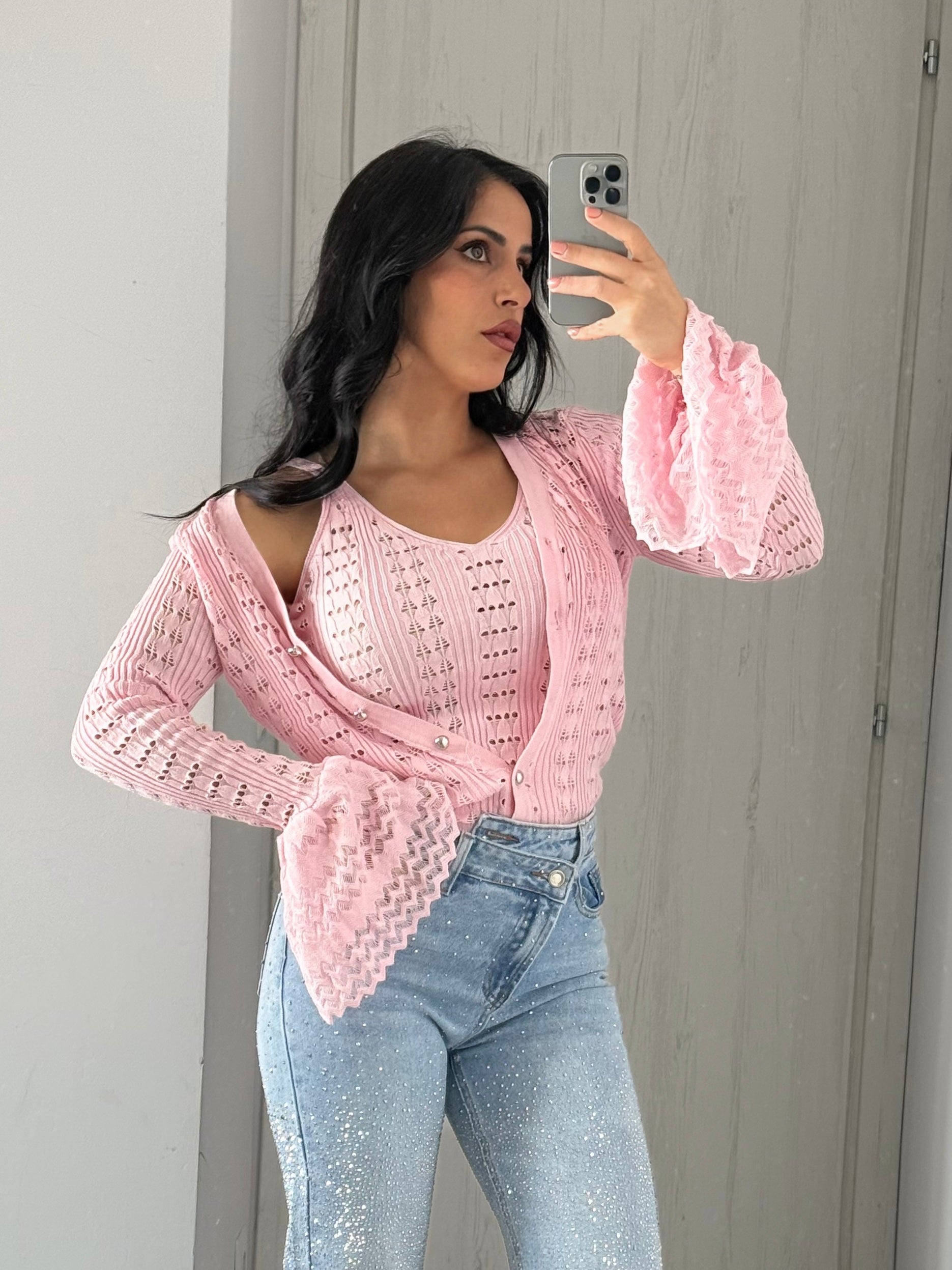 Il set perfetto per dare un tocco romantico al tuo look . Coordinato in maglia leggera traforata rosa , composto da canotta + cardigan abbinato con maniche ampie e dettagli in perle . Indossalo insieme oppure separa i pezzi per creare outfit sempre nuovi . Femminile comodo e leggero .