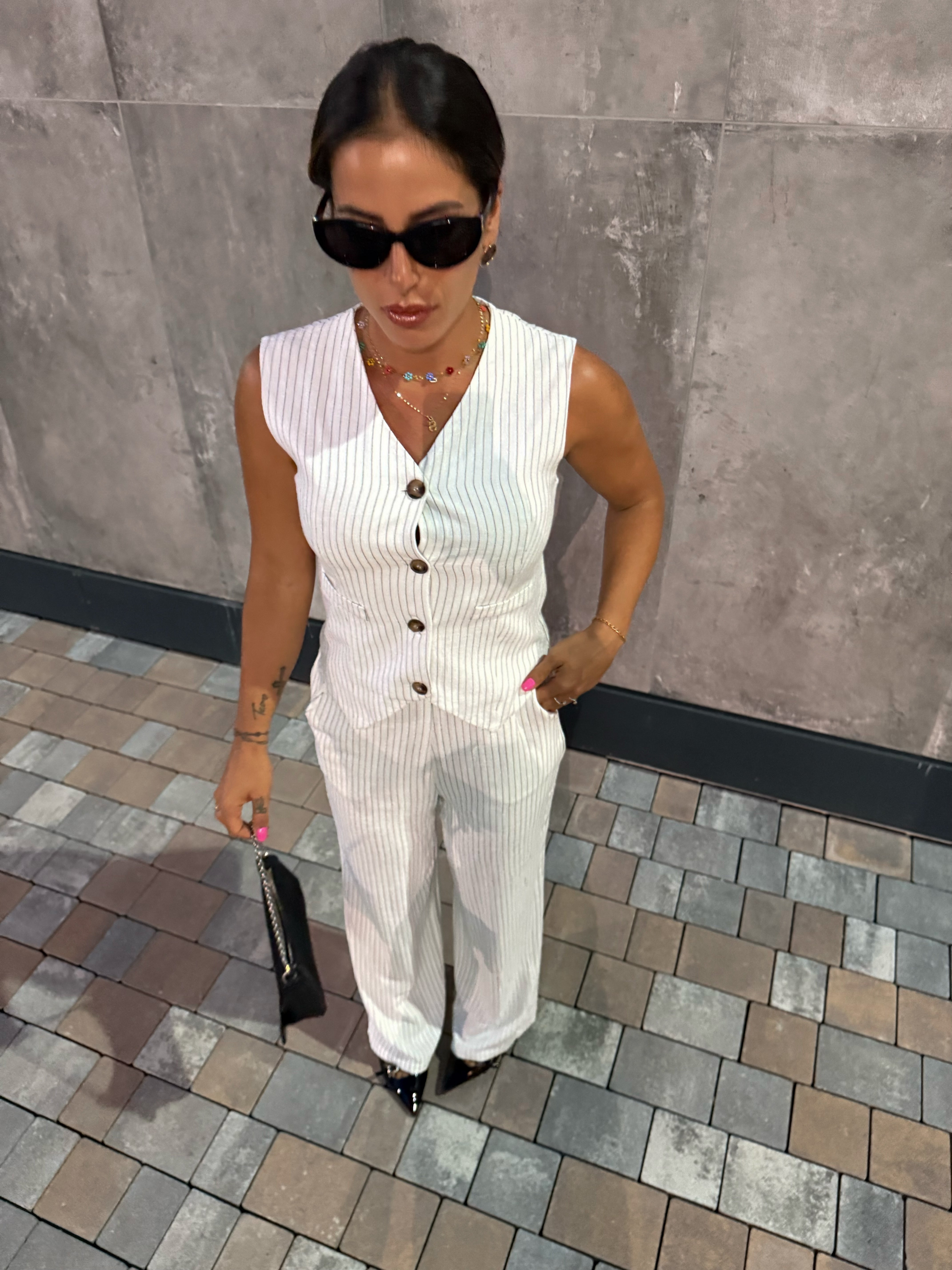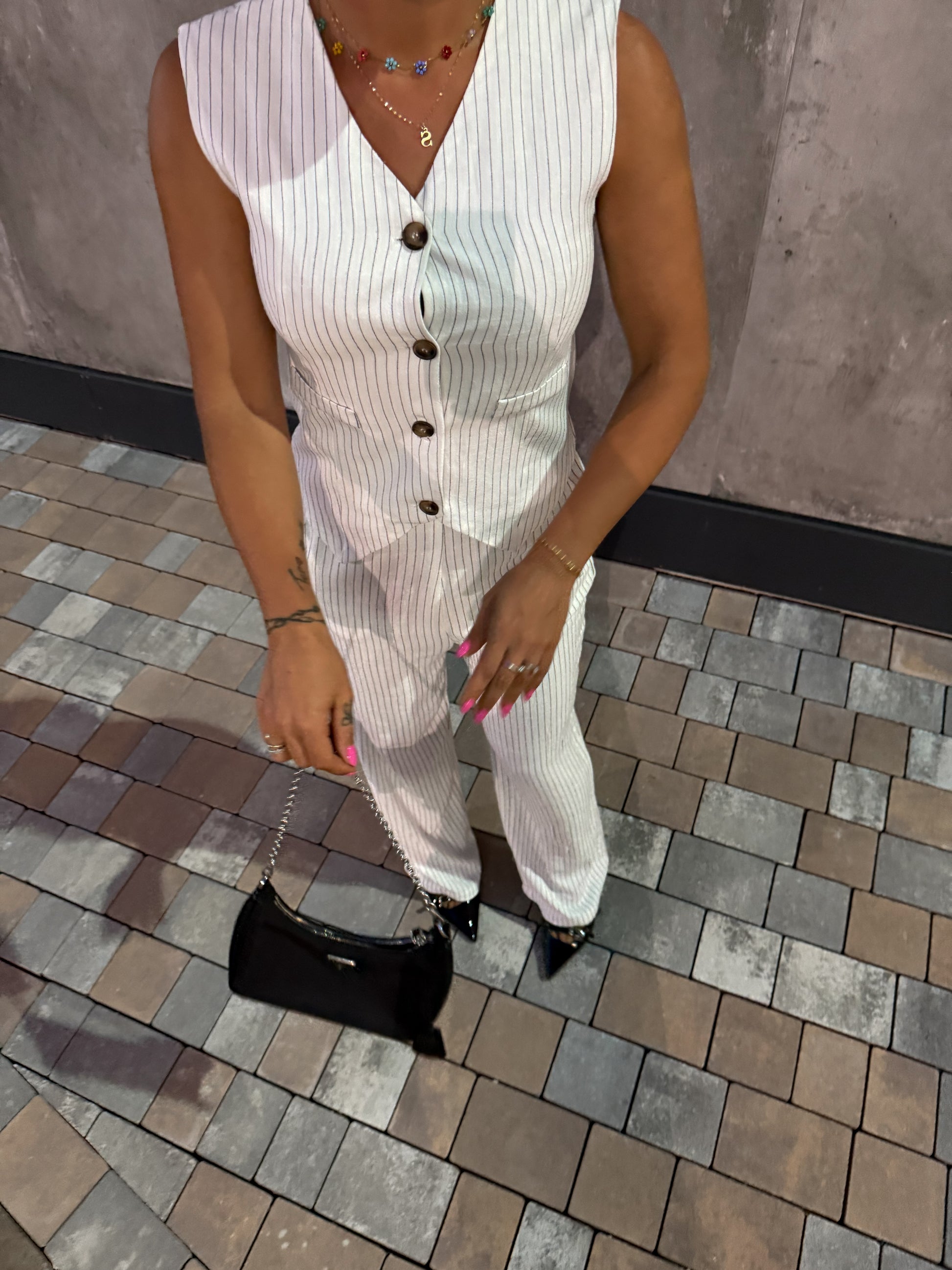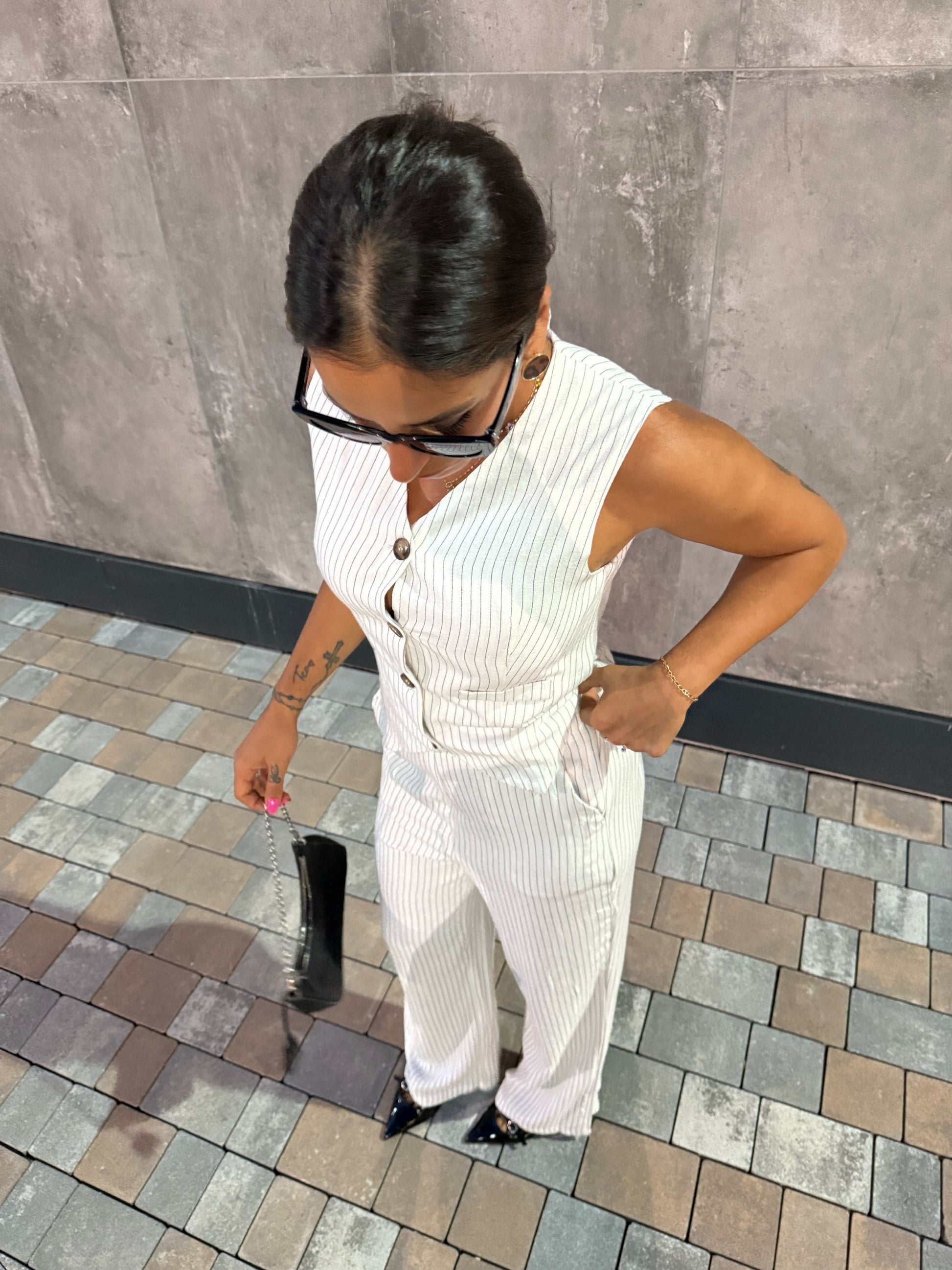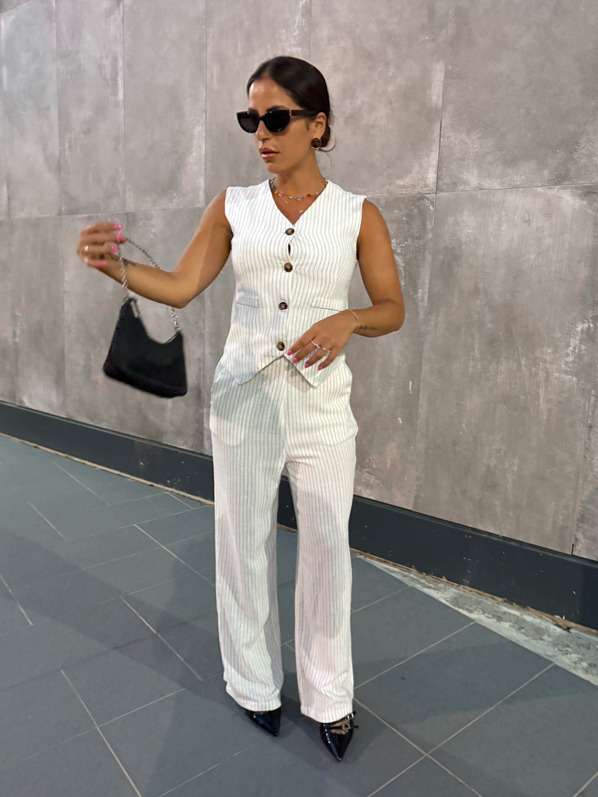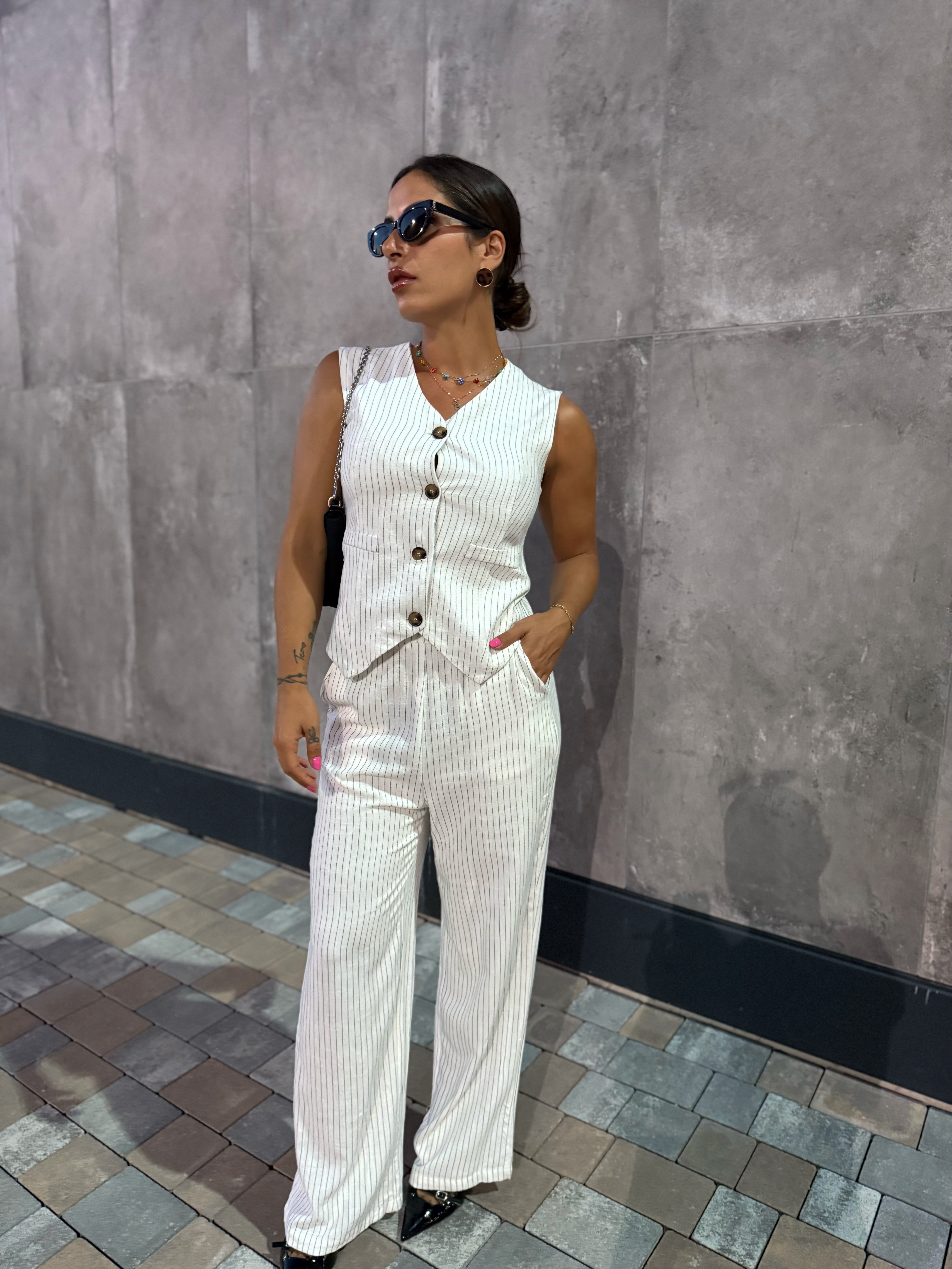 Un completo gessato non può mancare nel tuo armadio. Gilet dalla linea pulita con bottoni frontali , il pantalone a palazzo ha tasche comode e elastico in vita per il massimo del comfort.