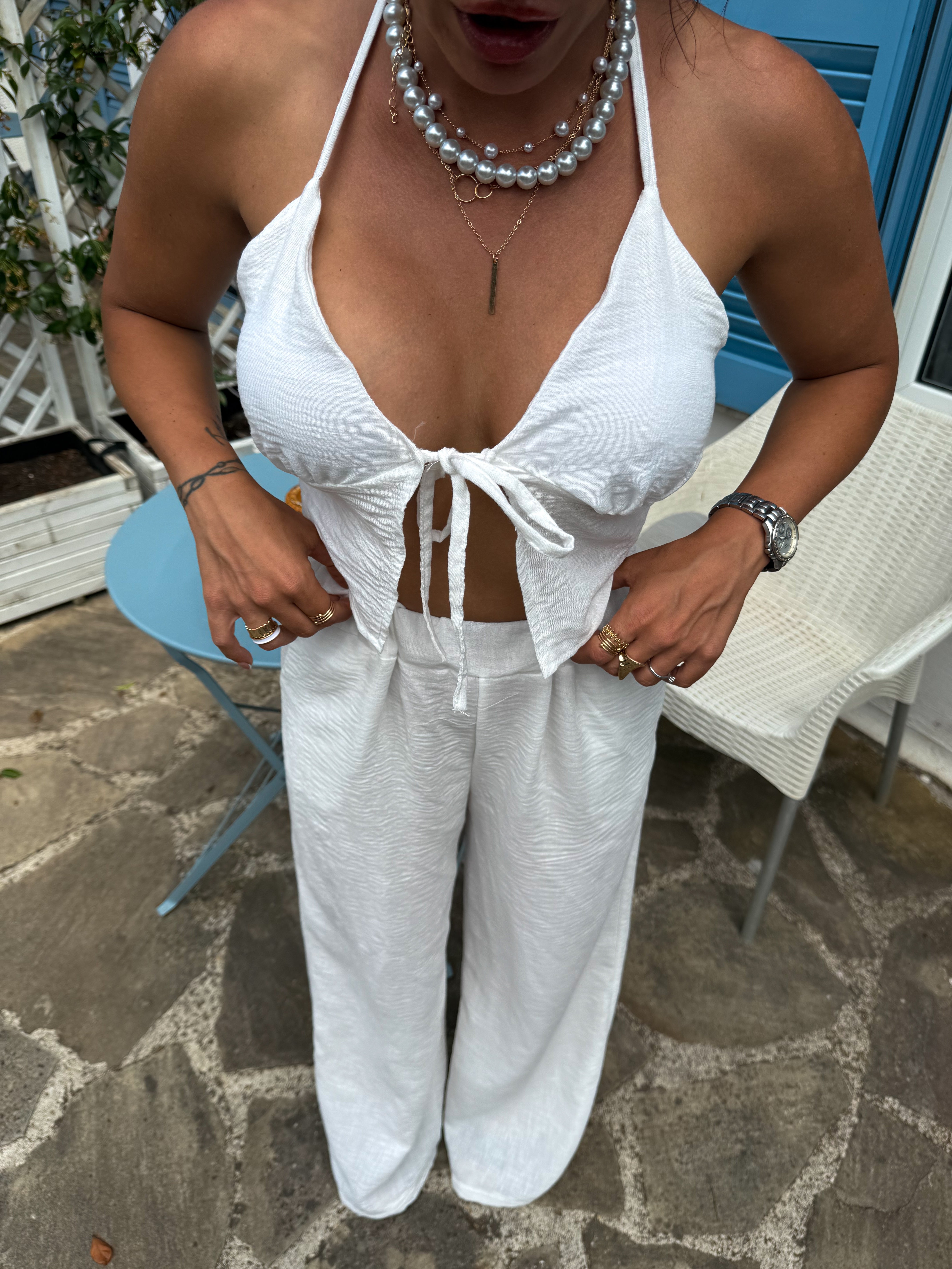 Immagina :un tessuto leggerissimo che accarezza la pelle ,un bianco luminoso che esalta l'abbronzatura . Questo coordinato è un passepartout per l'estate .