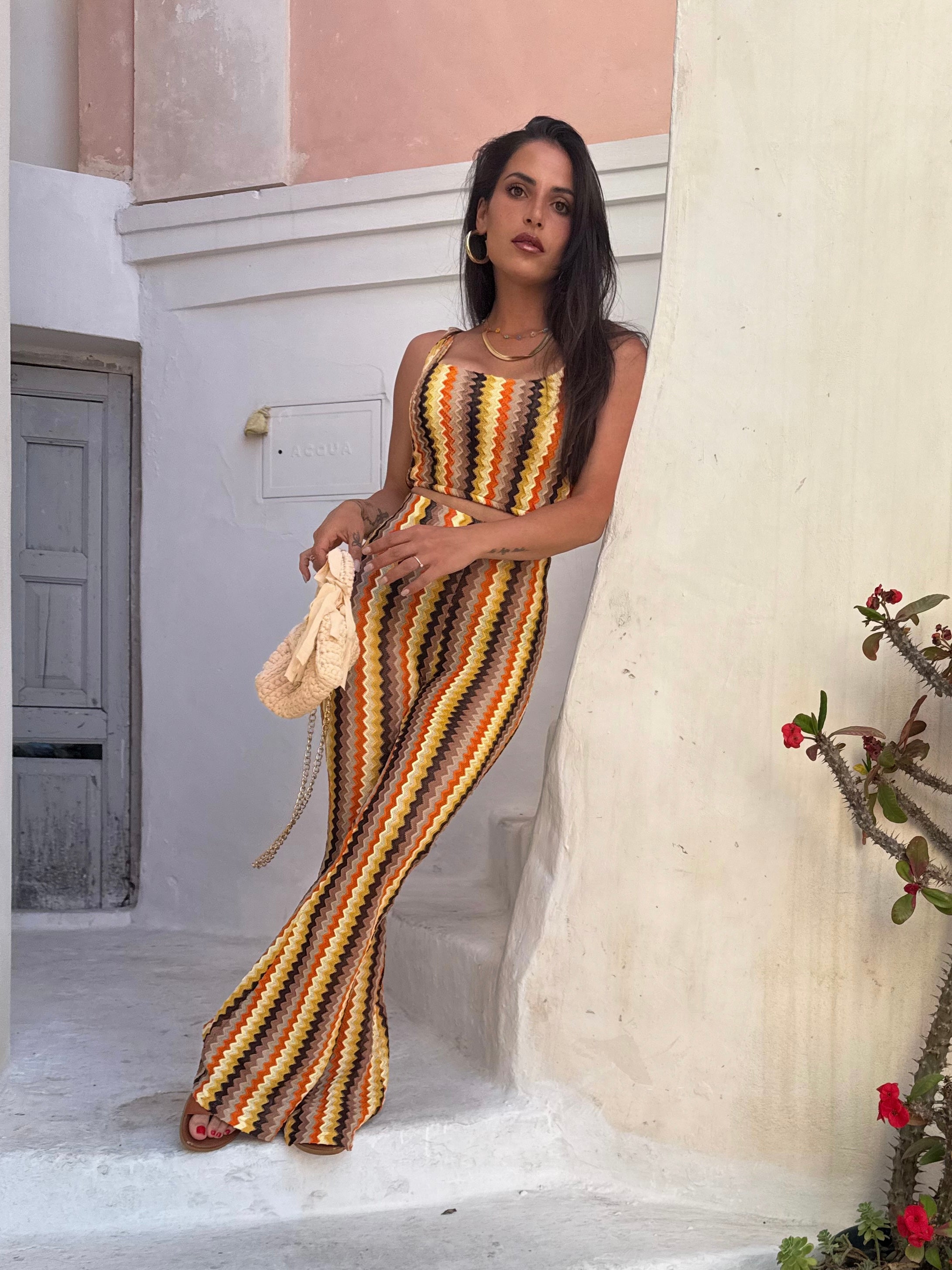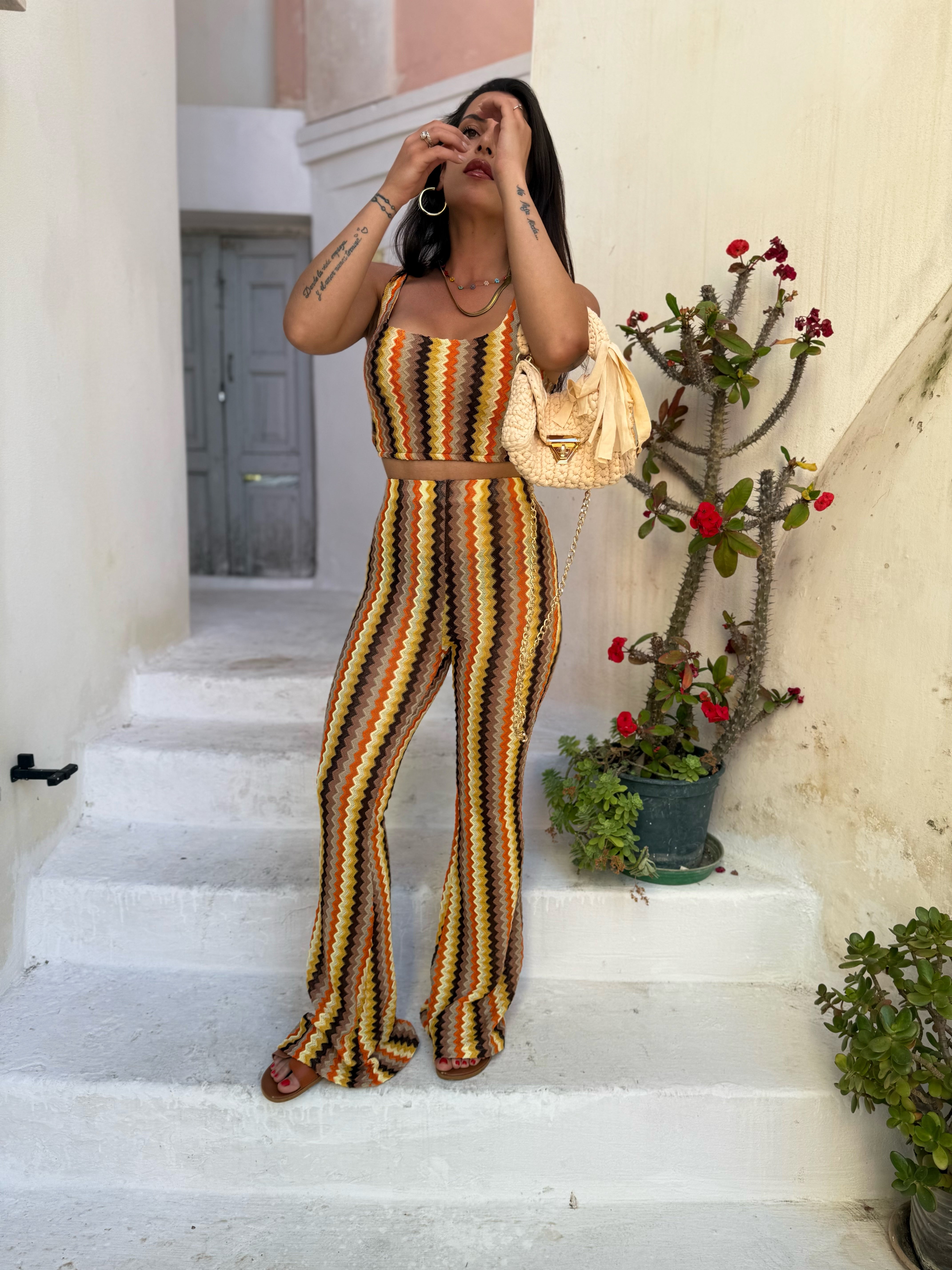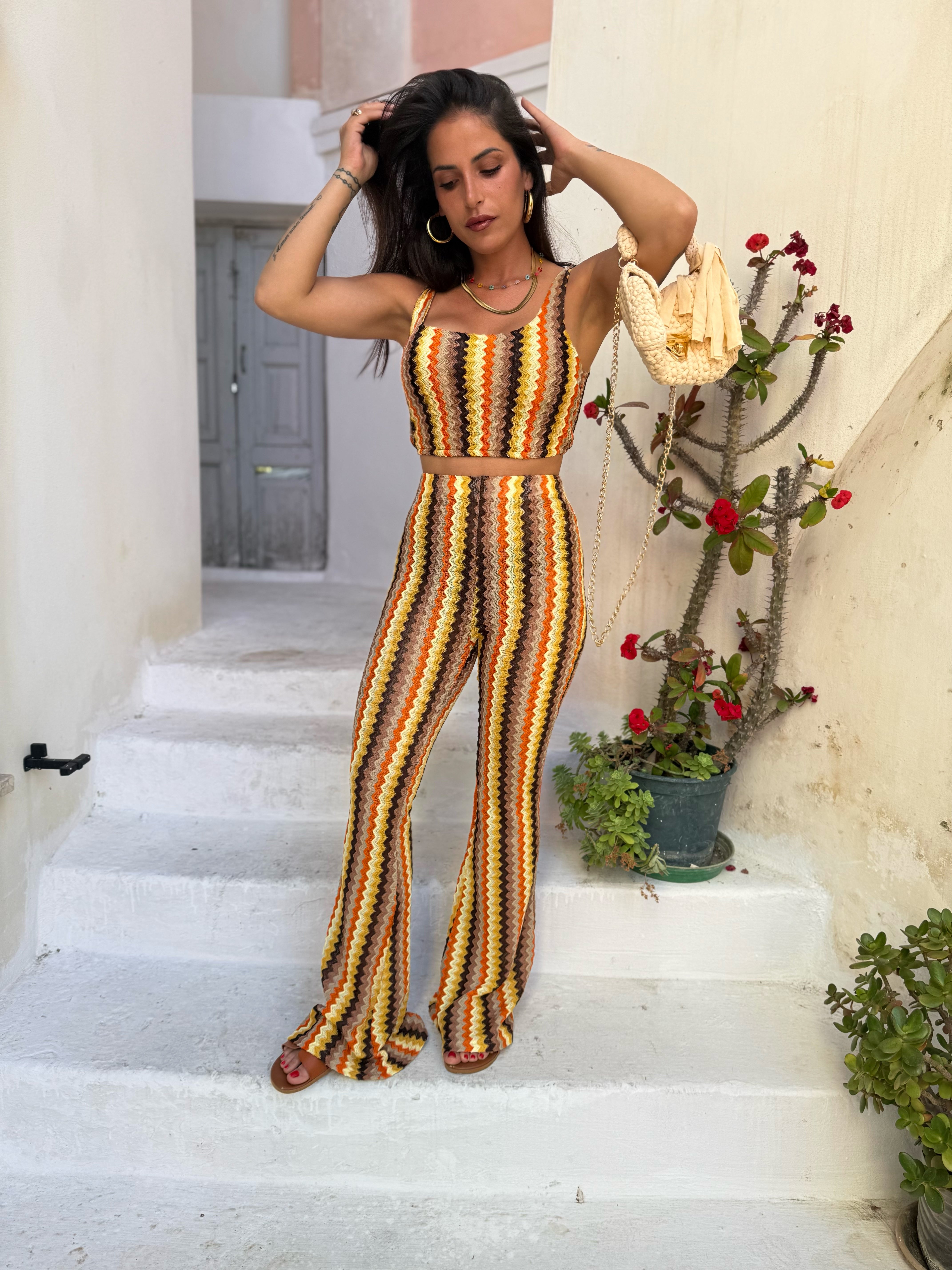 Il top crop e pantalone a zampa creano un mix perfetto tra comodità e femminilità .