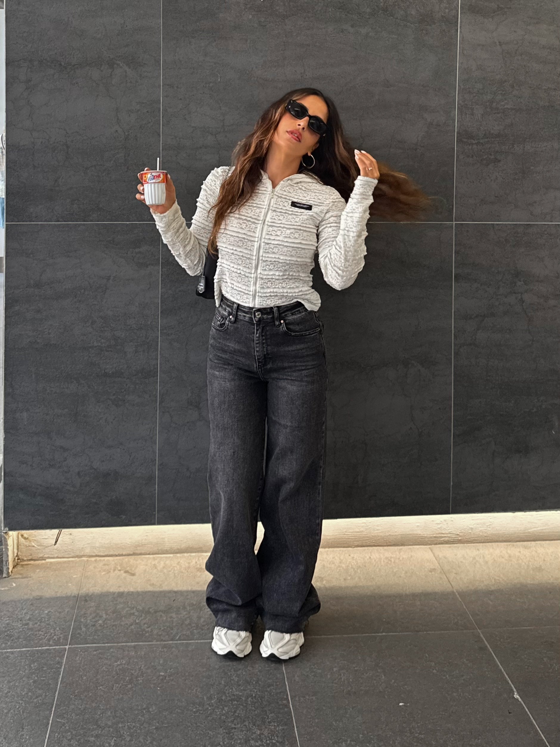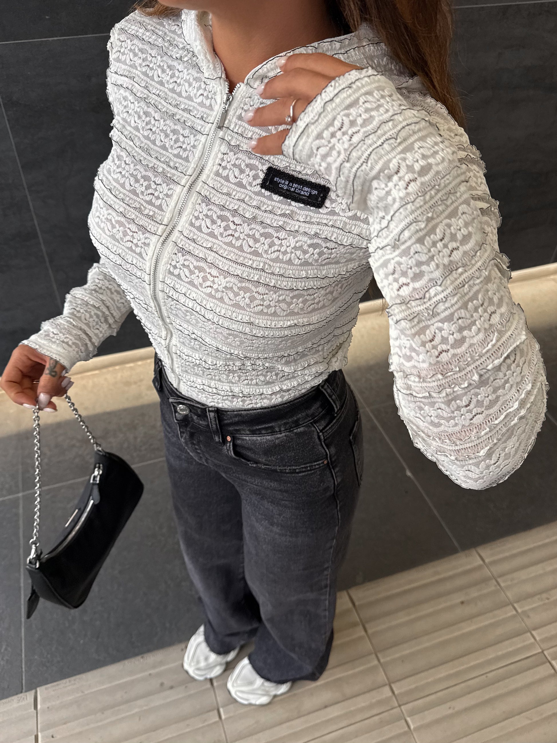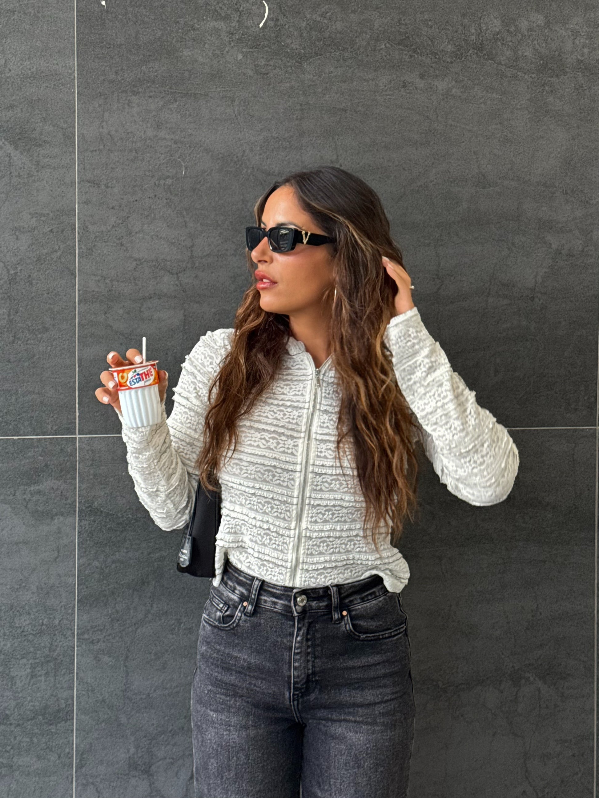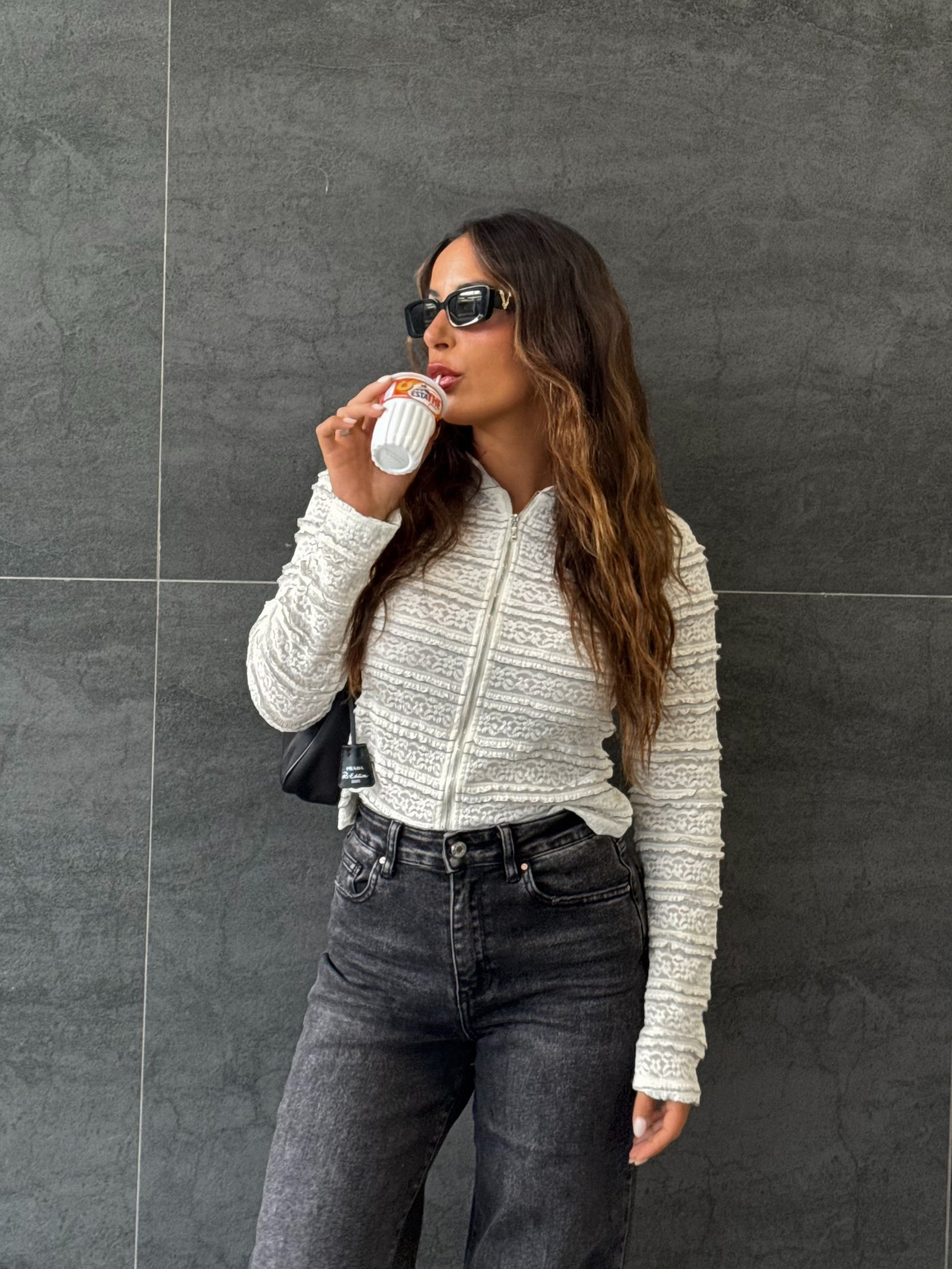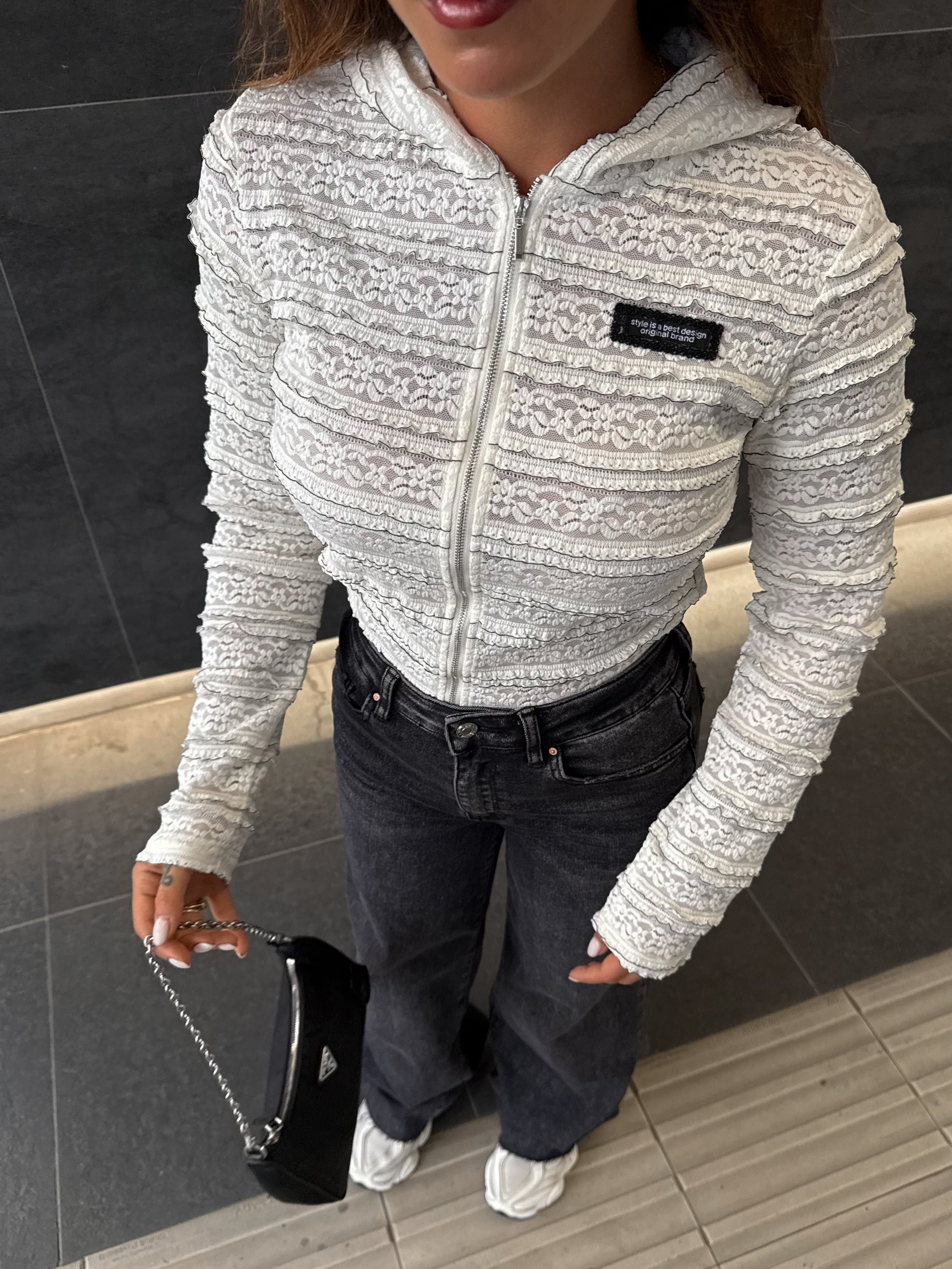 Un felpina diversa dal solito , perfetta per i tuoi look quotidiani. Il tessuto e ricamato traforato ,con zip frontale , cappuccio e una targhetta laterale a contrasto nera . Sta benissimo con jeans , pantaloni o anche sopra a sotto tuta per look più curati.