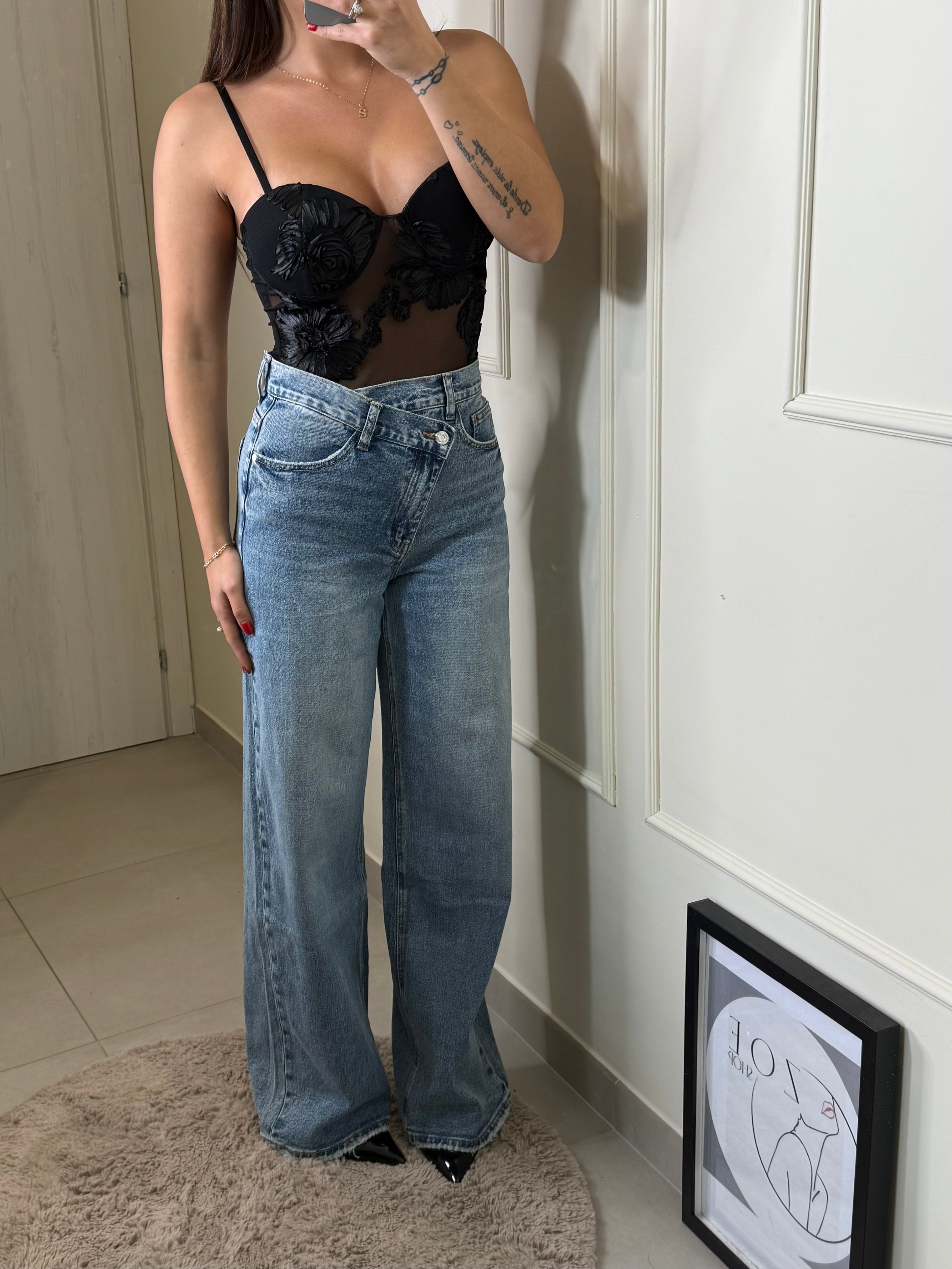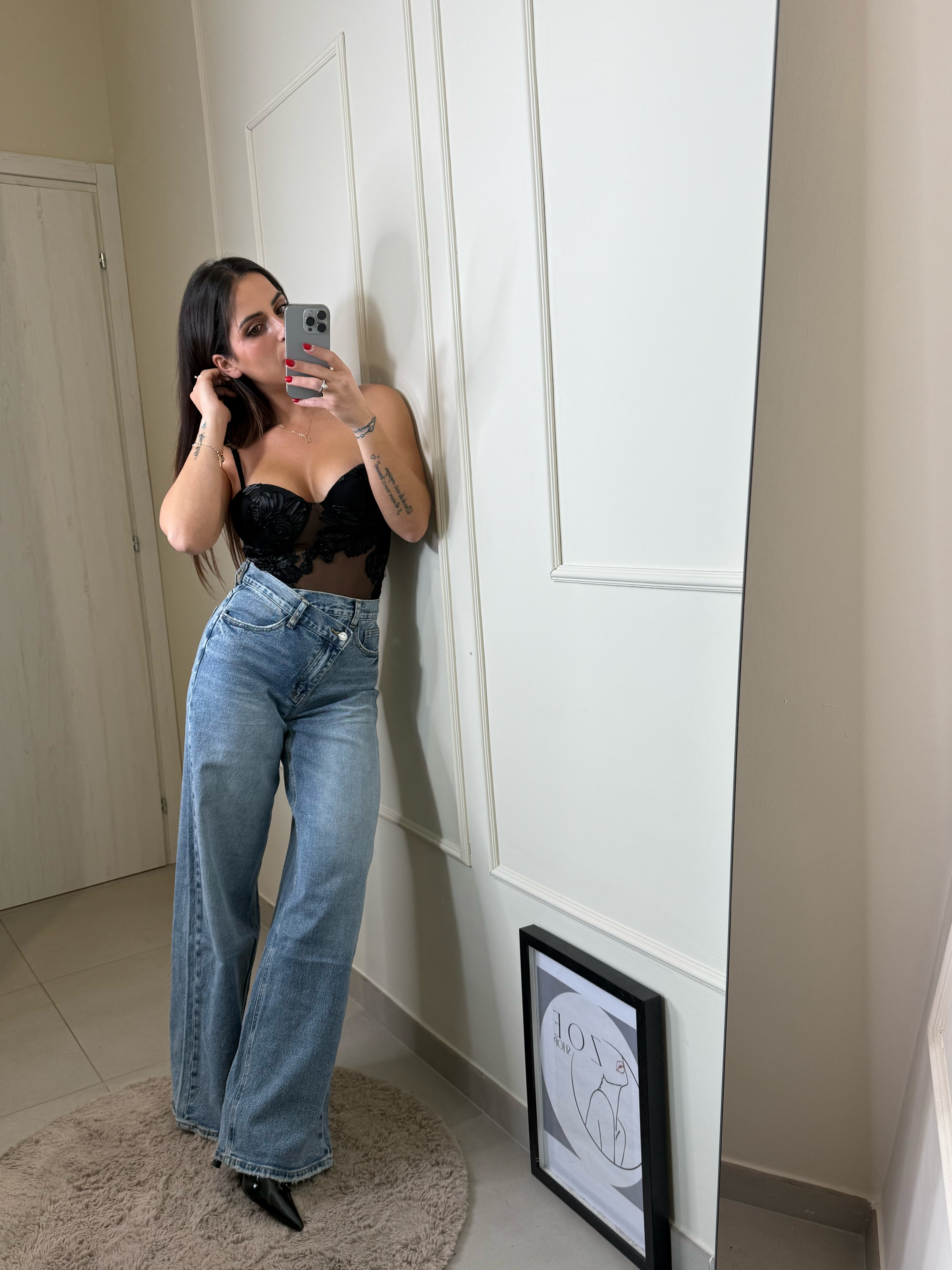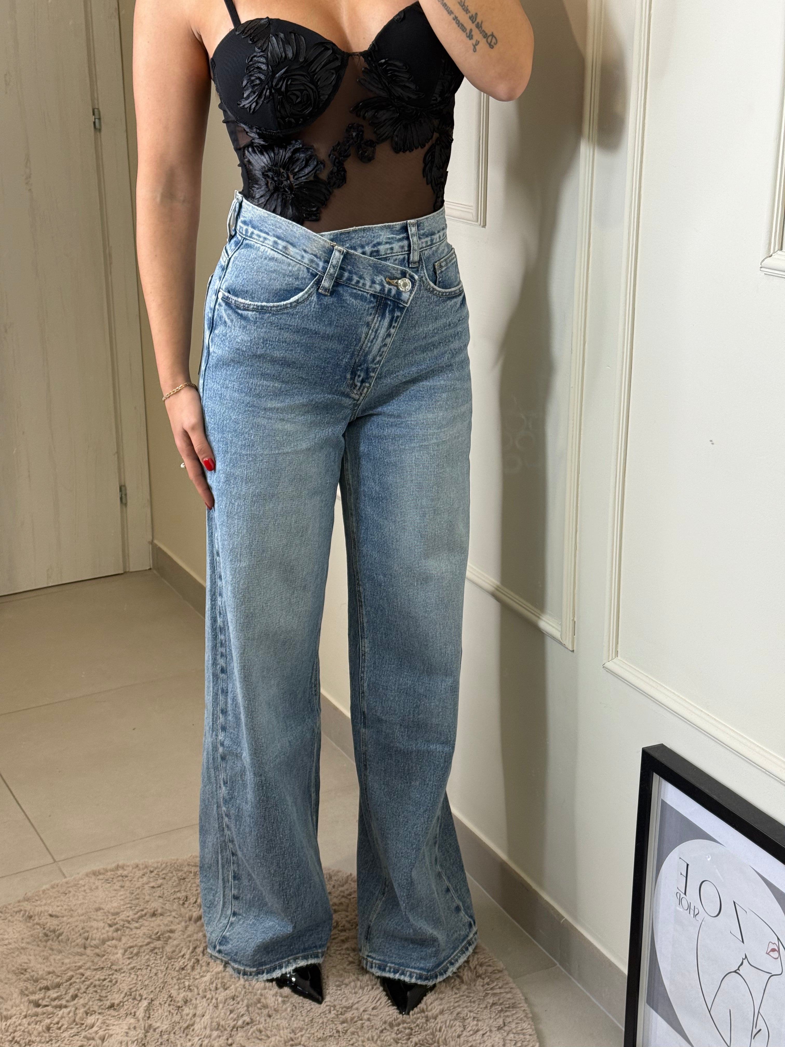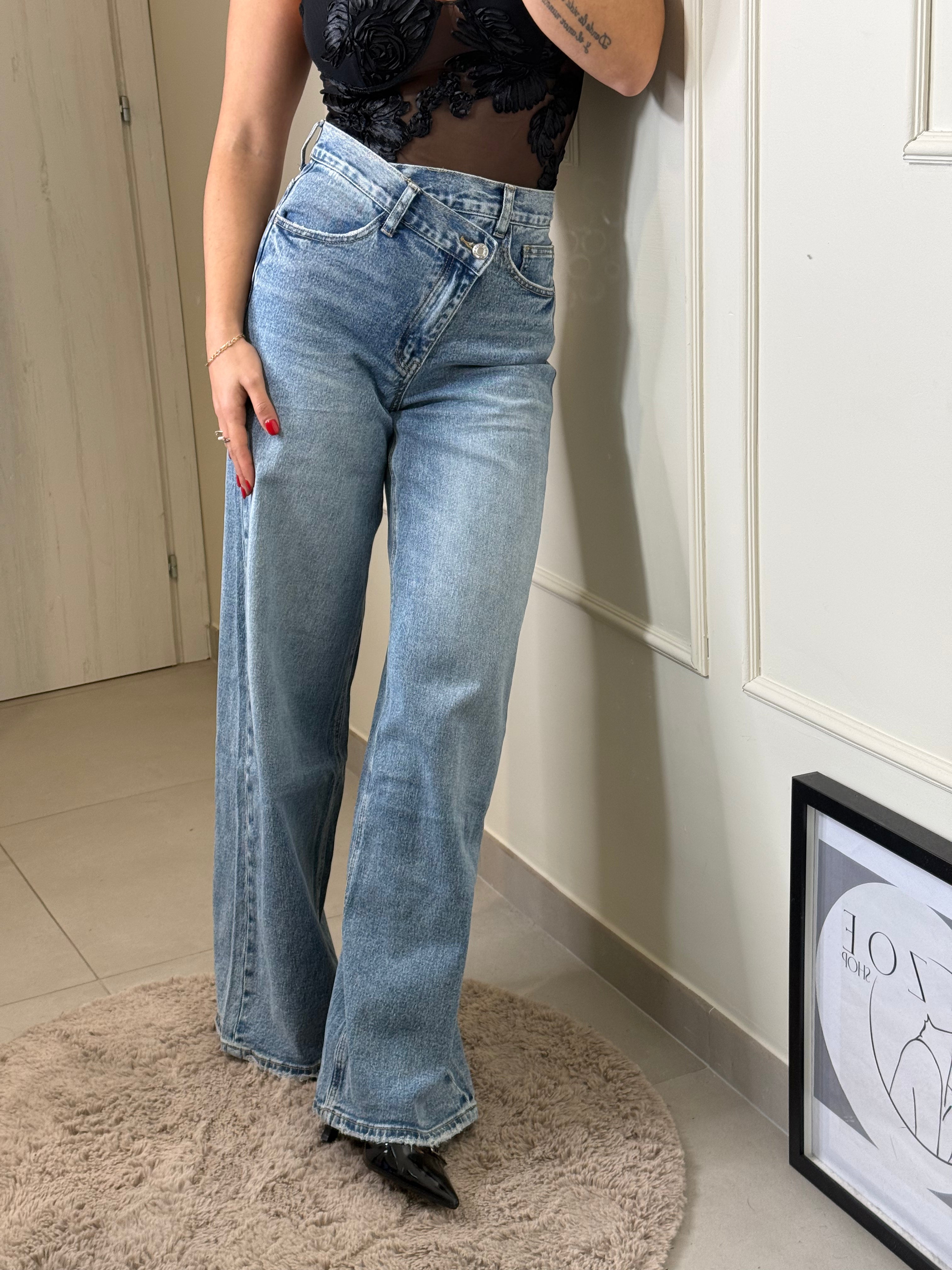 Un jeans essenziale , pensato per accompagnarti ogni giorno con comfort e stile . Elasticizzato , vestibilità morbida e confortevole . Gamba dritta , lavaggio chiaro basic , un vero passe - partout facile da abbinare in ogni stagione . A renderlo speciale è la chiusura asimmetrica sul davanti , un dettaglio discreto ma distintivo che spezza la linearità del classico jeans basico e lo rende meno scontato. Tagli XS S M L . Sara in foto indossa S ed è alta 1, 63