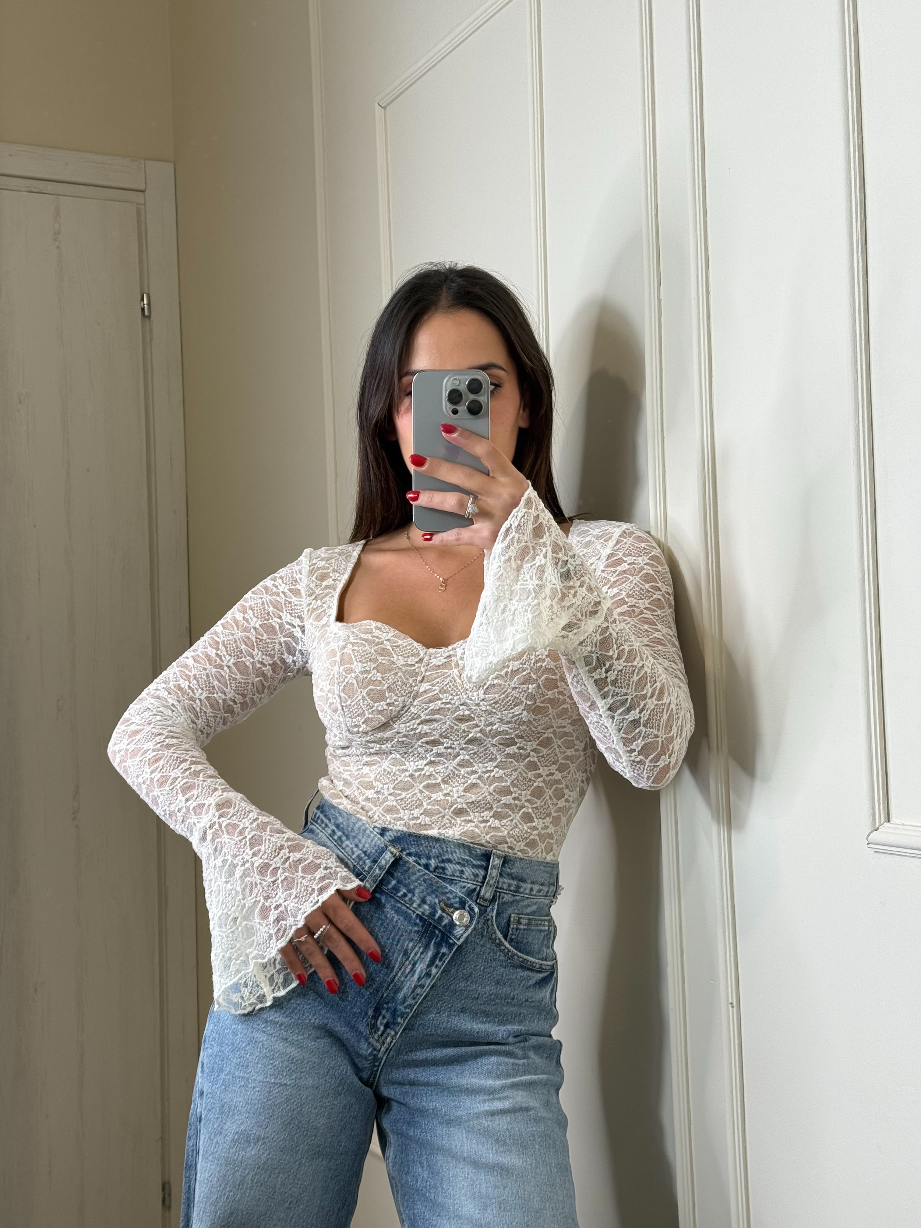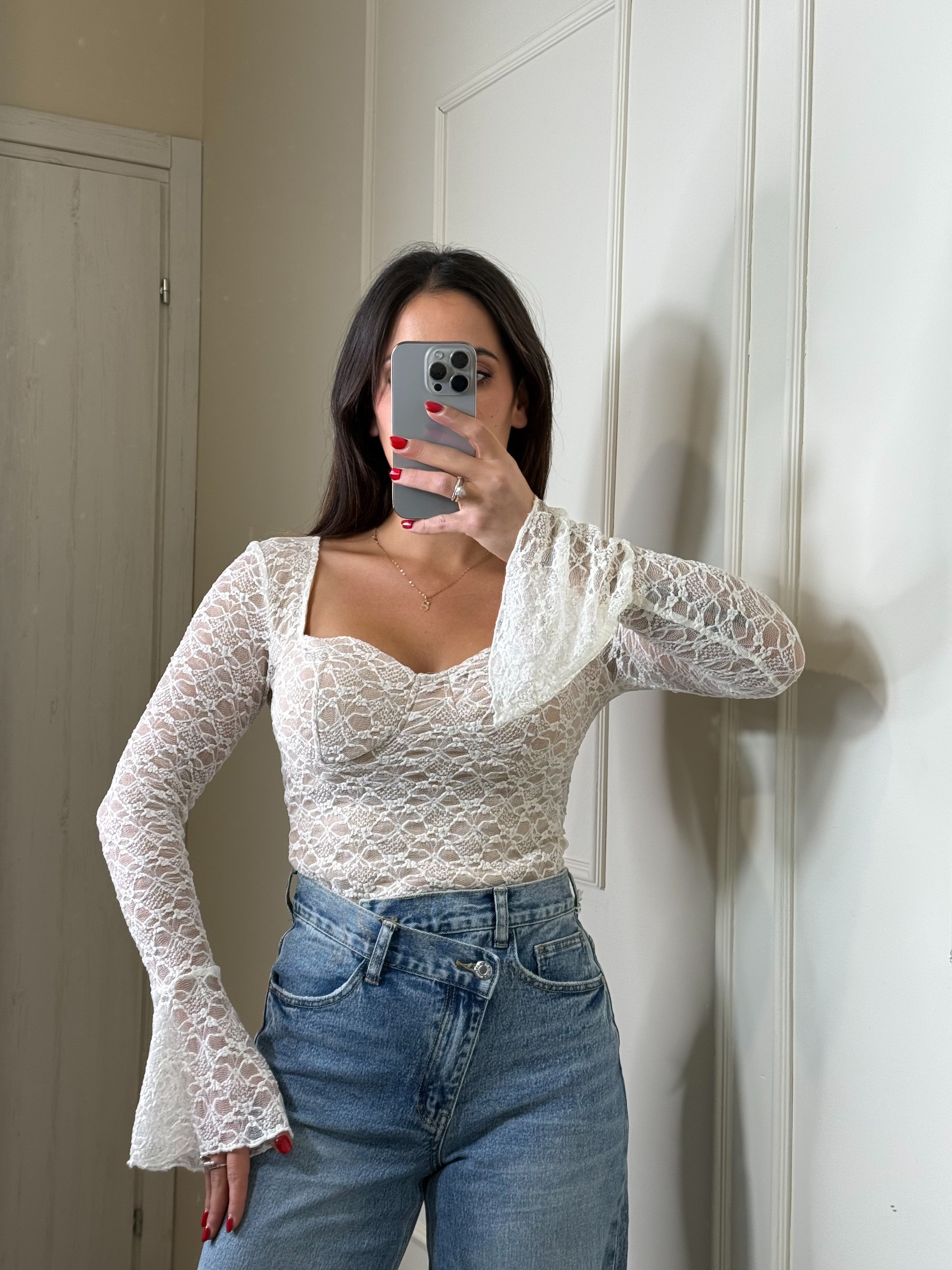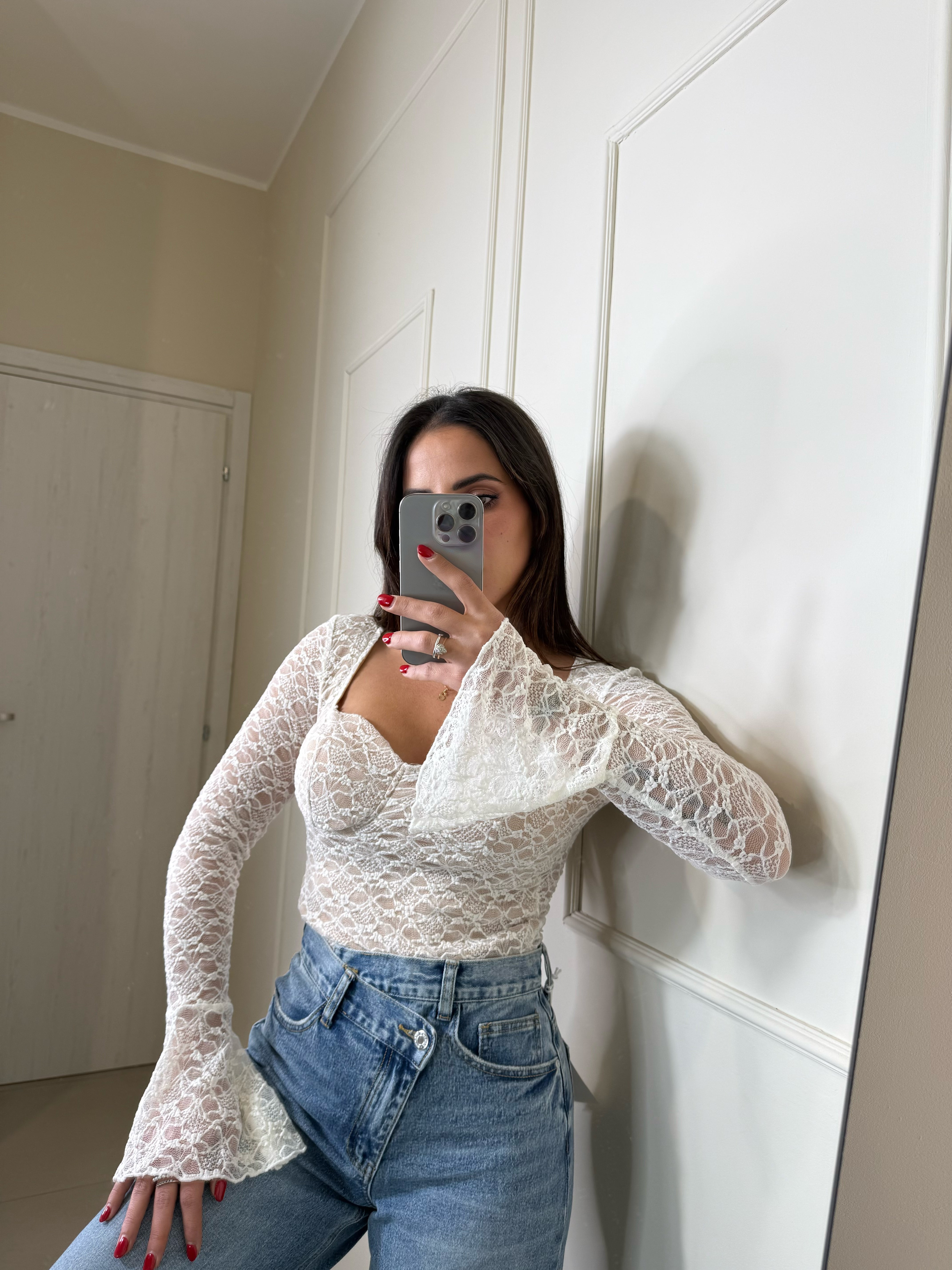 Delicata e femminile , color panna caratterizzata da coppa imbottita e scollo a cuore ,interamente ricamata e volant sui polsini. Taglia unica veste da XS a L