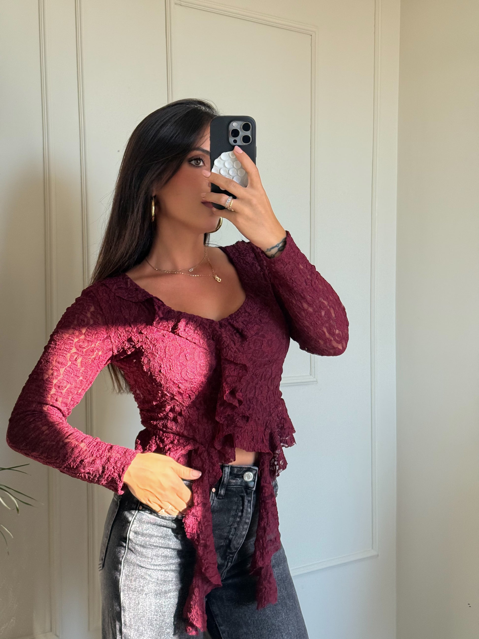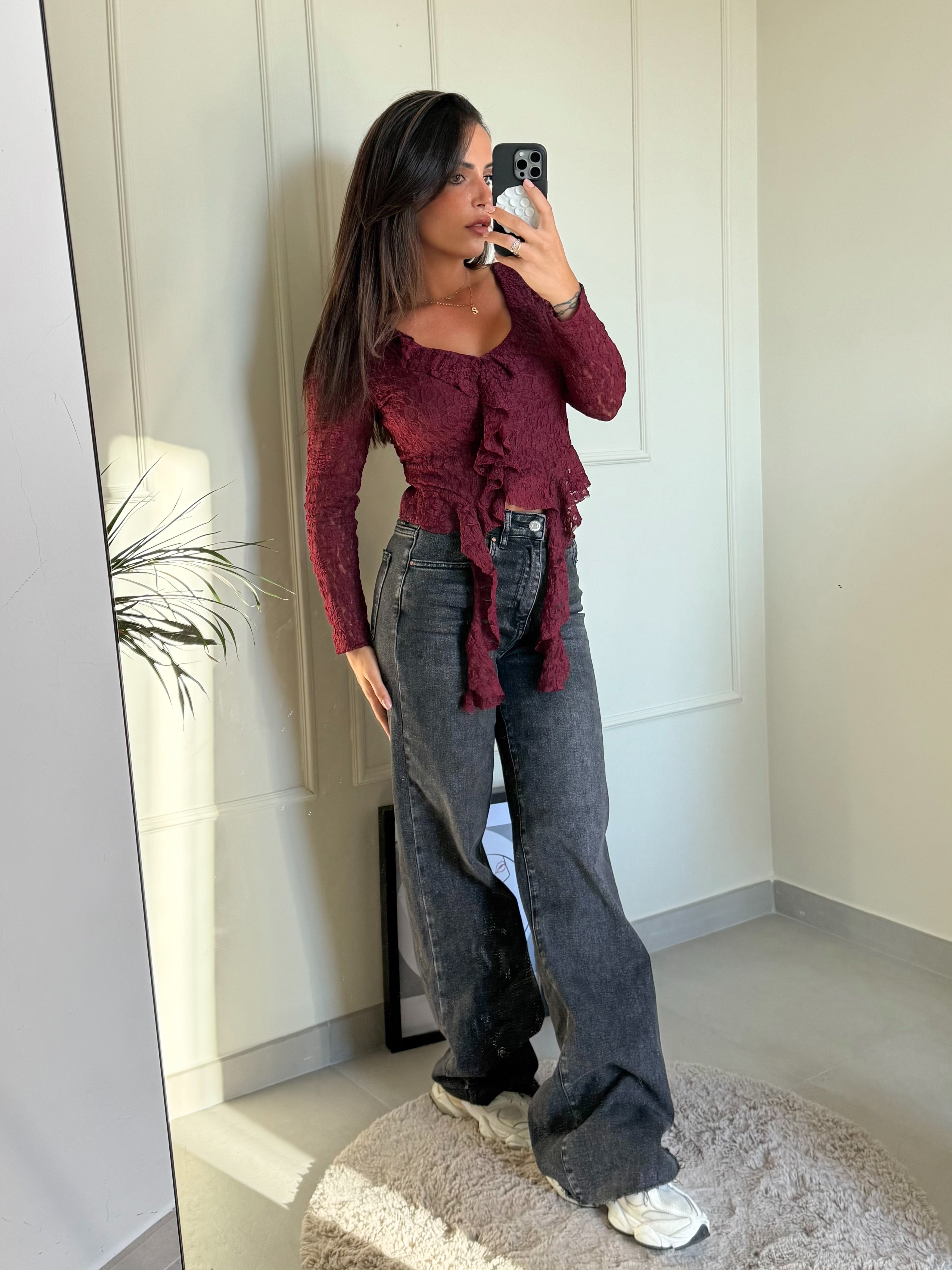 Questa maglia ha quel dettaglio in più , ricamo delicato e due volant davanti che la rendono speciale senza esagerare . Perfetta se cerchi un tocco femminile ma naturale.