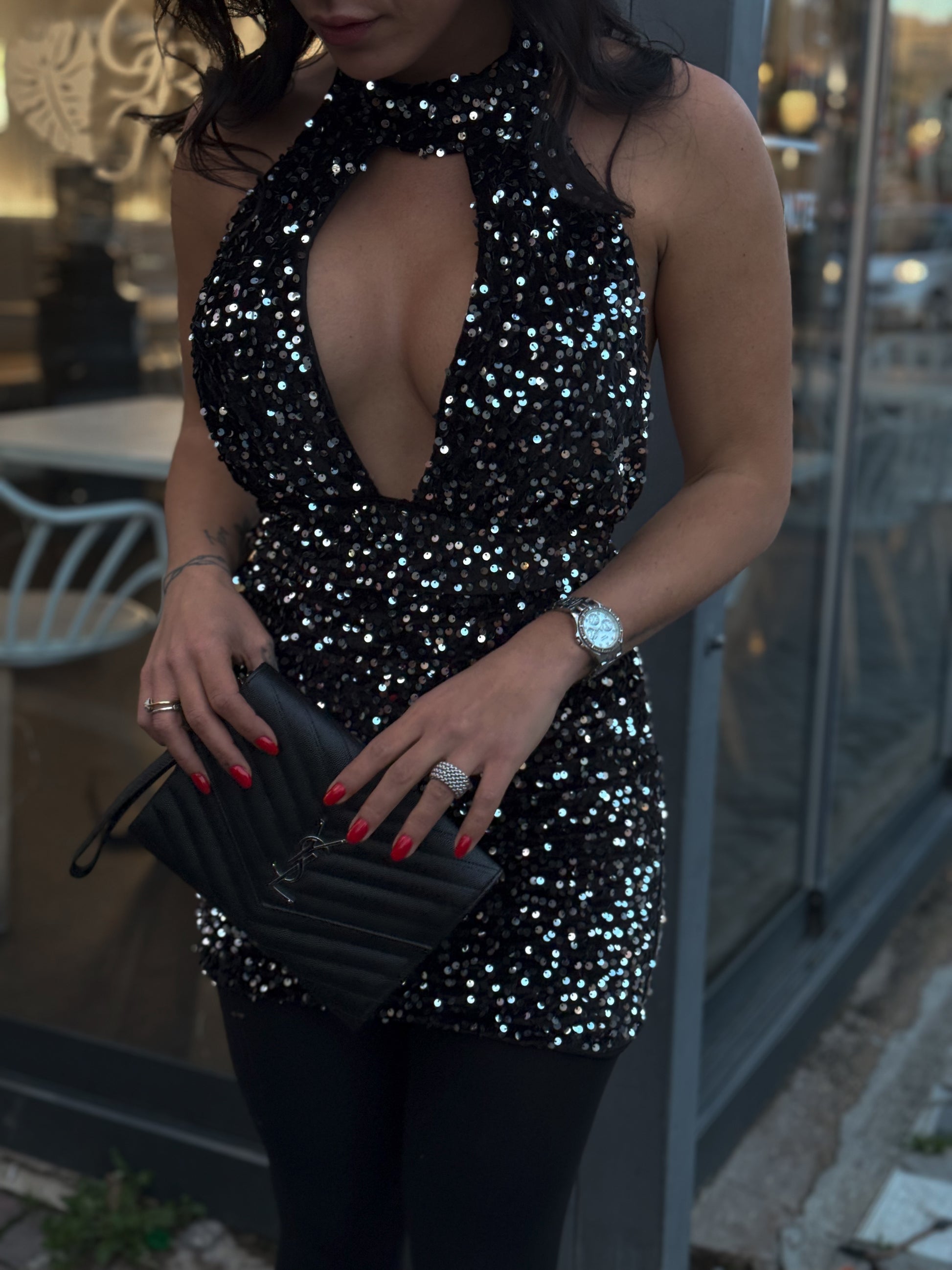 Mini dress interamente ricoperto da pailllettes , scollo profondo a goccia e collo alto con chiusura sul retro . Sensuale , elegante e perfetto per le serate in cui vuoi essere protagonista . Il fit è aderente ma confortevole ,Ideale per cene speciali , un party una serata in disco sia in estate che in inverno .