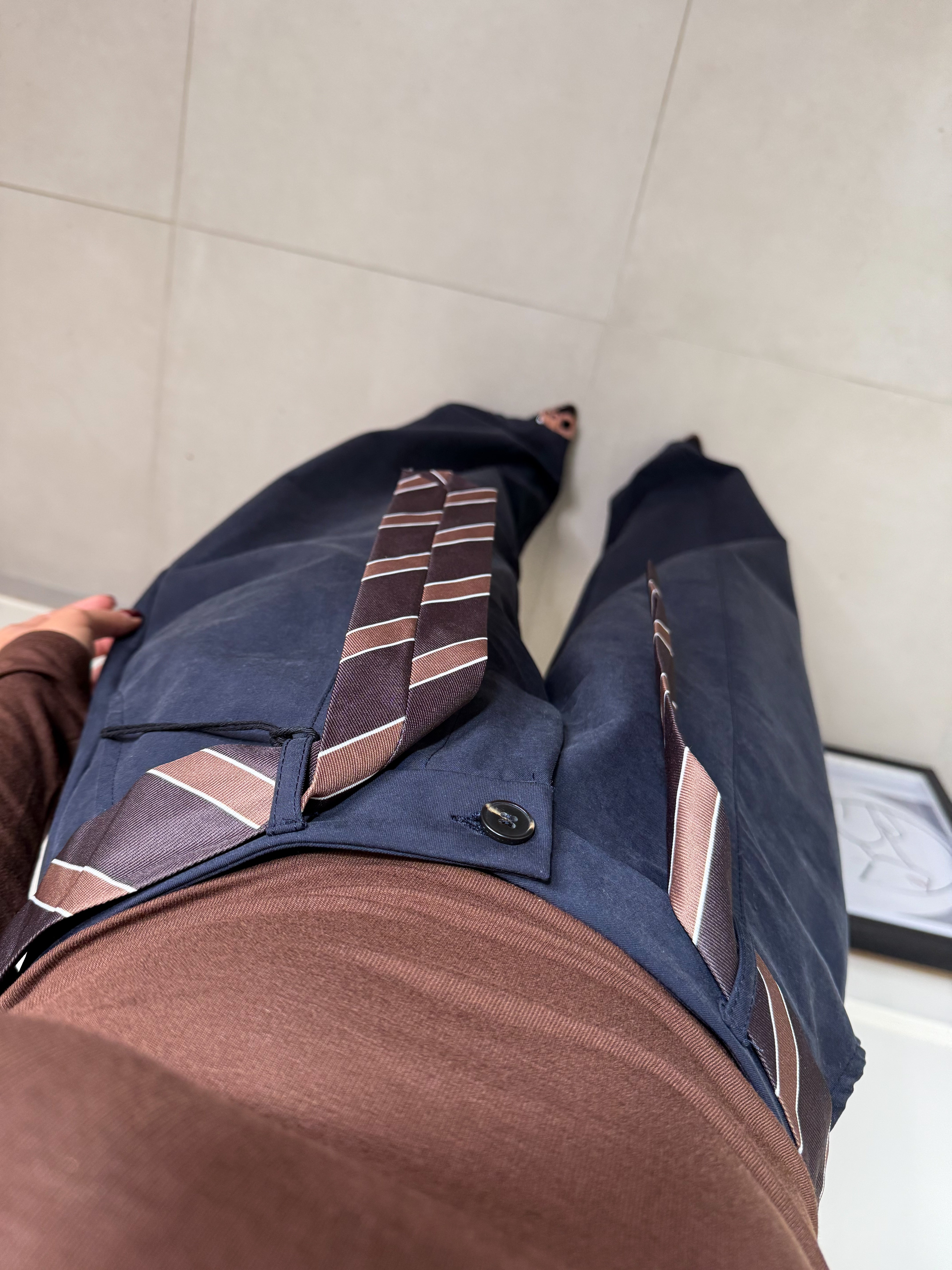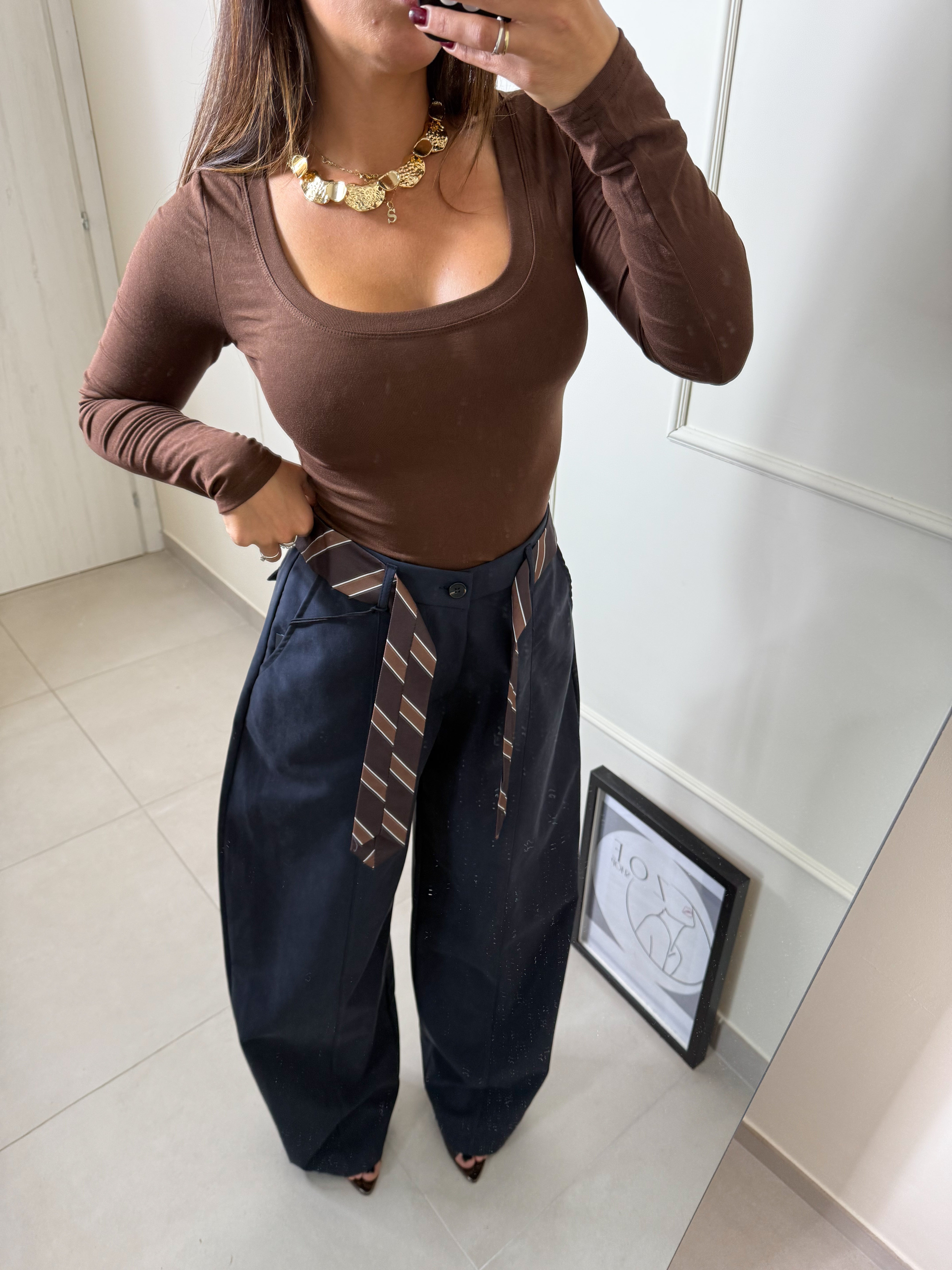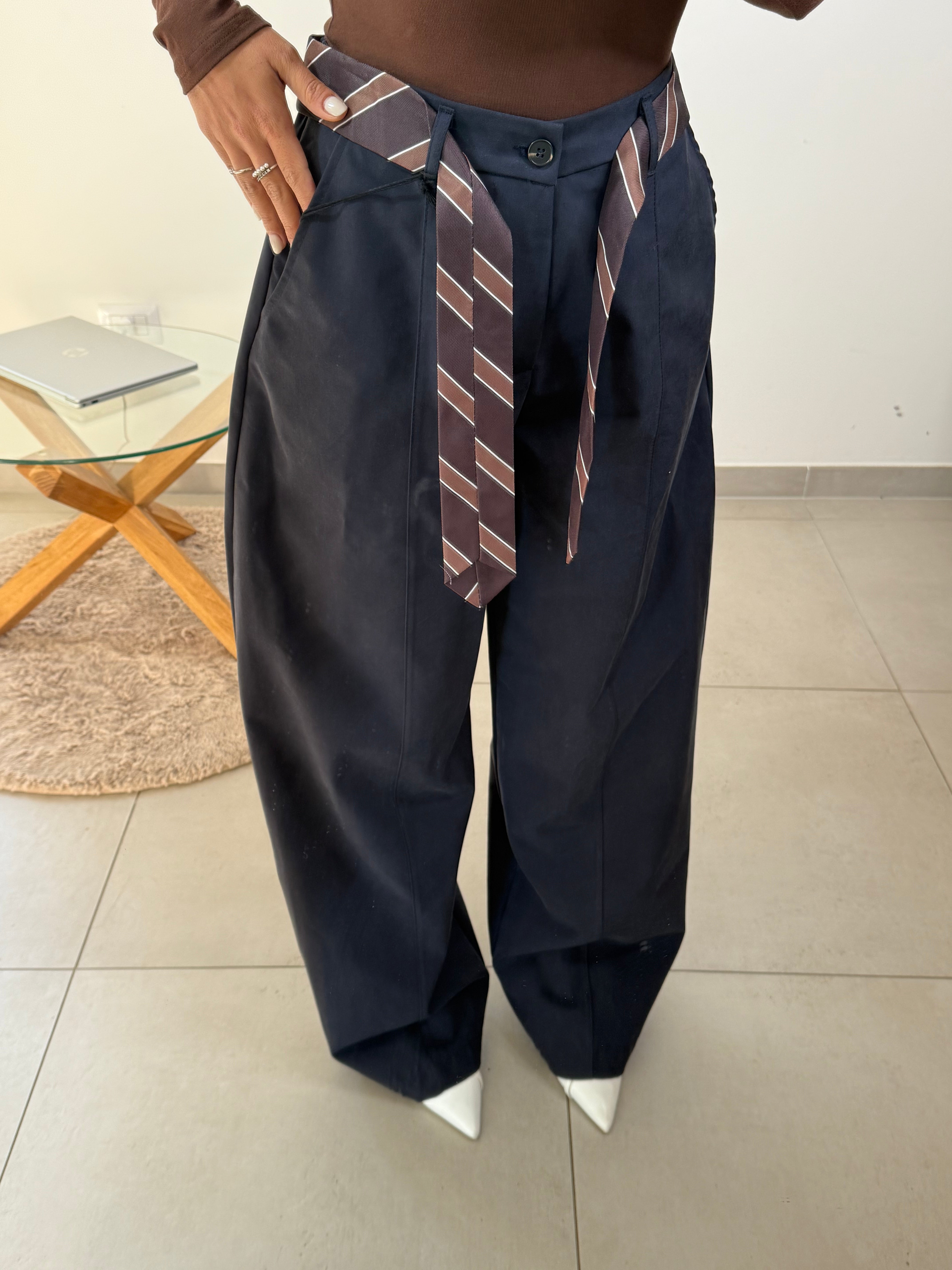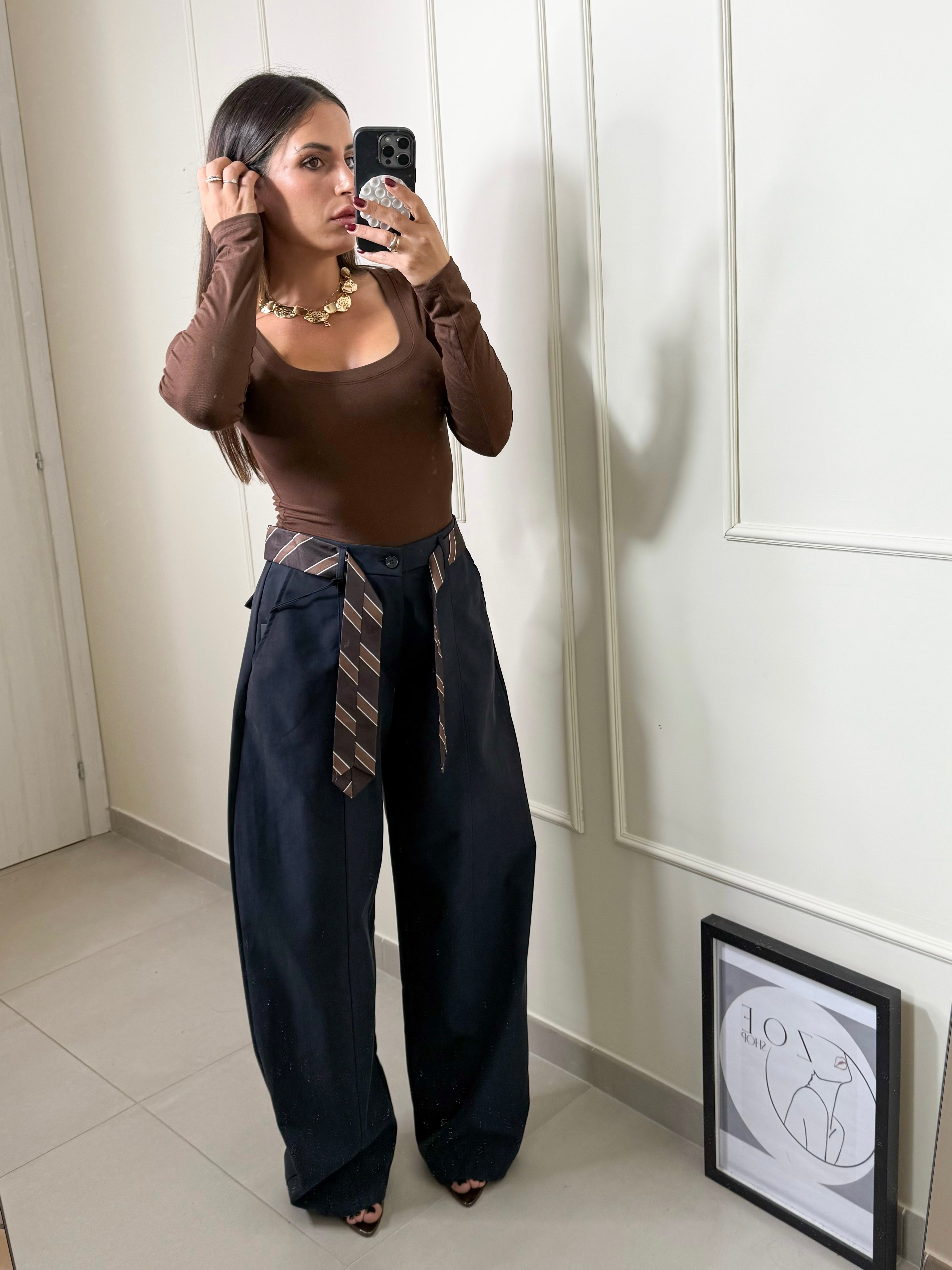 Comodo figo e super versatile . Questo pantalone blu notte modello ballon ha una linea ampia e morbida. Taglia unica ma veste da XS a L , inclusa avrete la cravatta che dona un tocco stiloso . Sara è alta 1,63