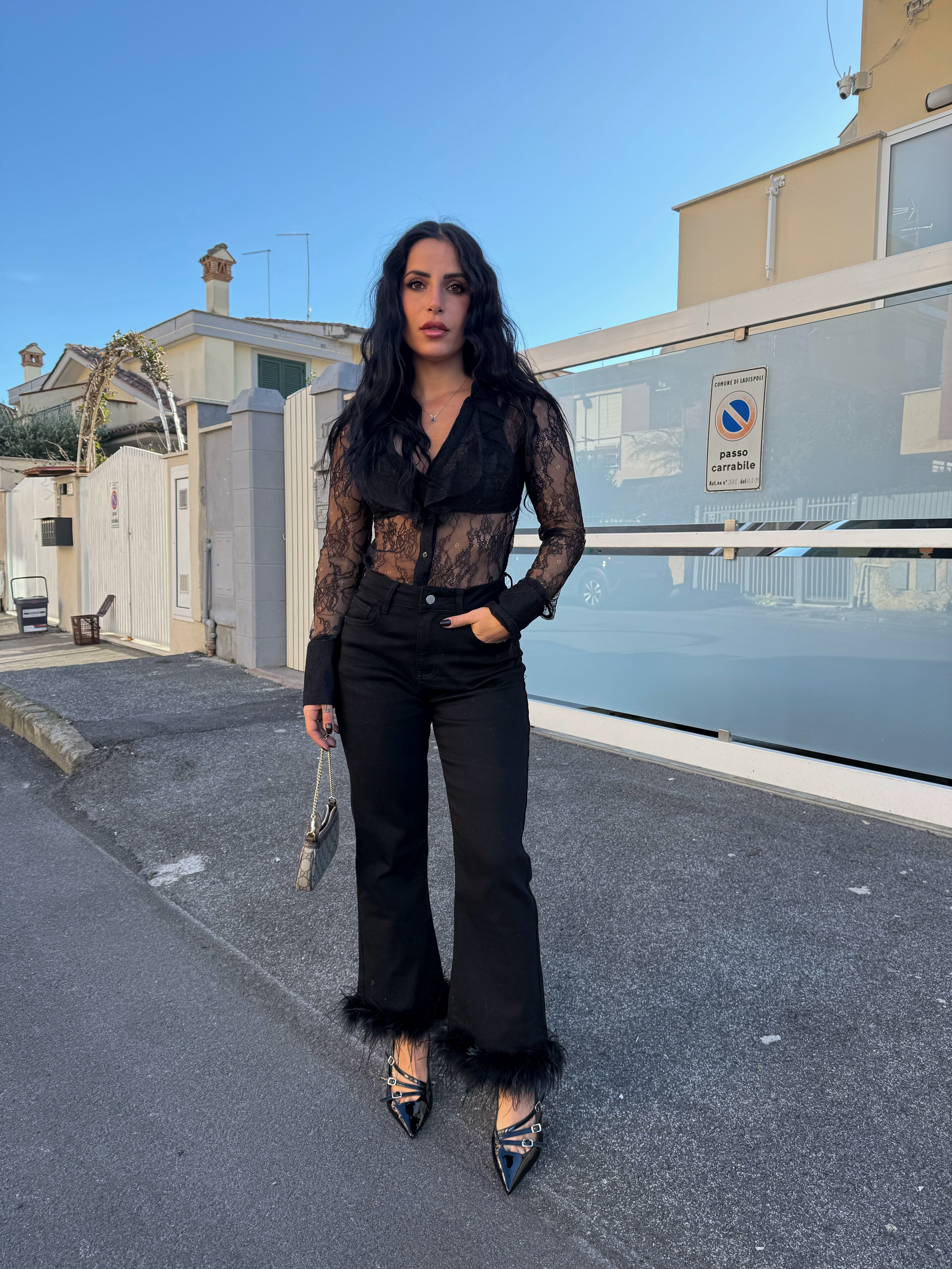 Linee pulite e fit regolare che valorizza la gamba , con dettaglio finale super chic , piume tono su tono sull'orlo per un effetto wow assicurato .