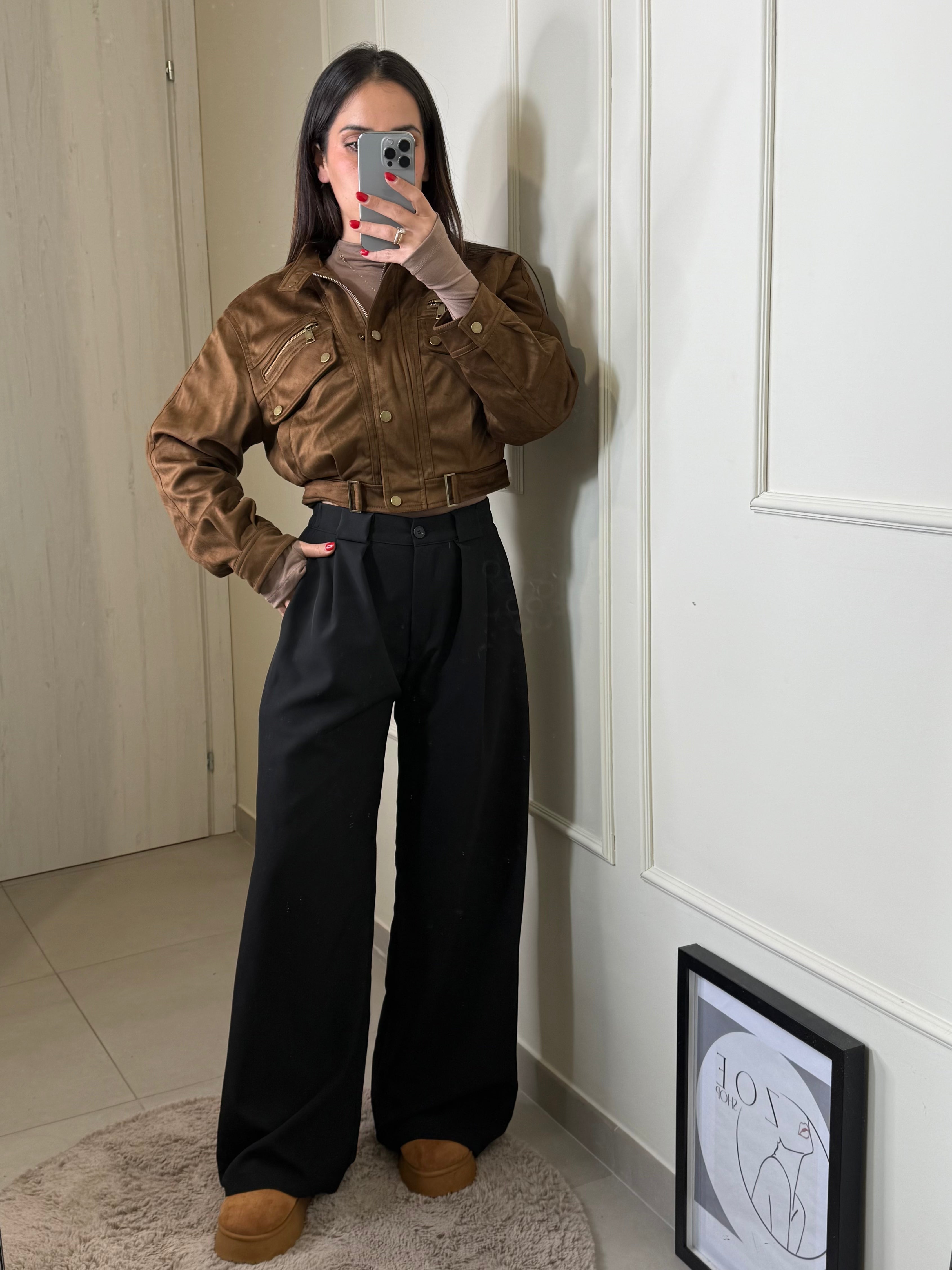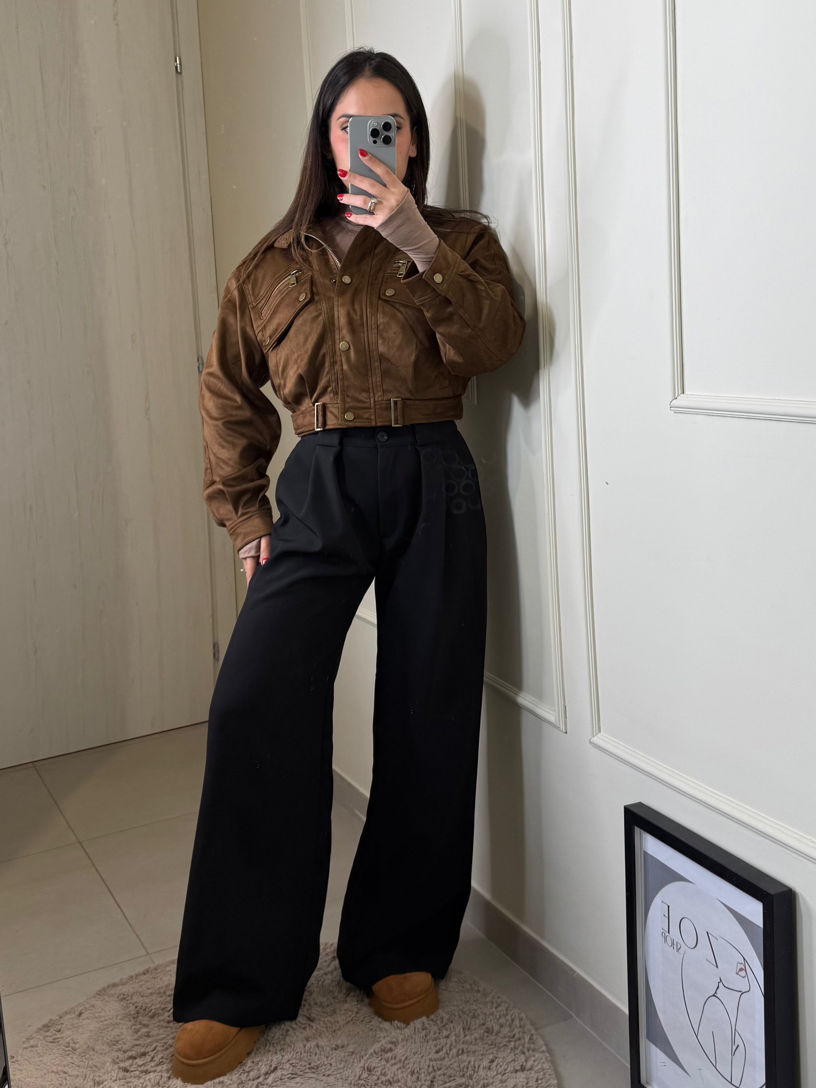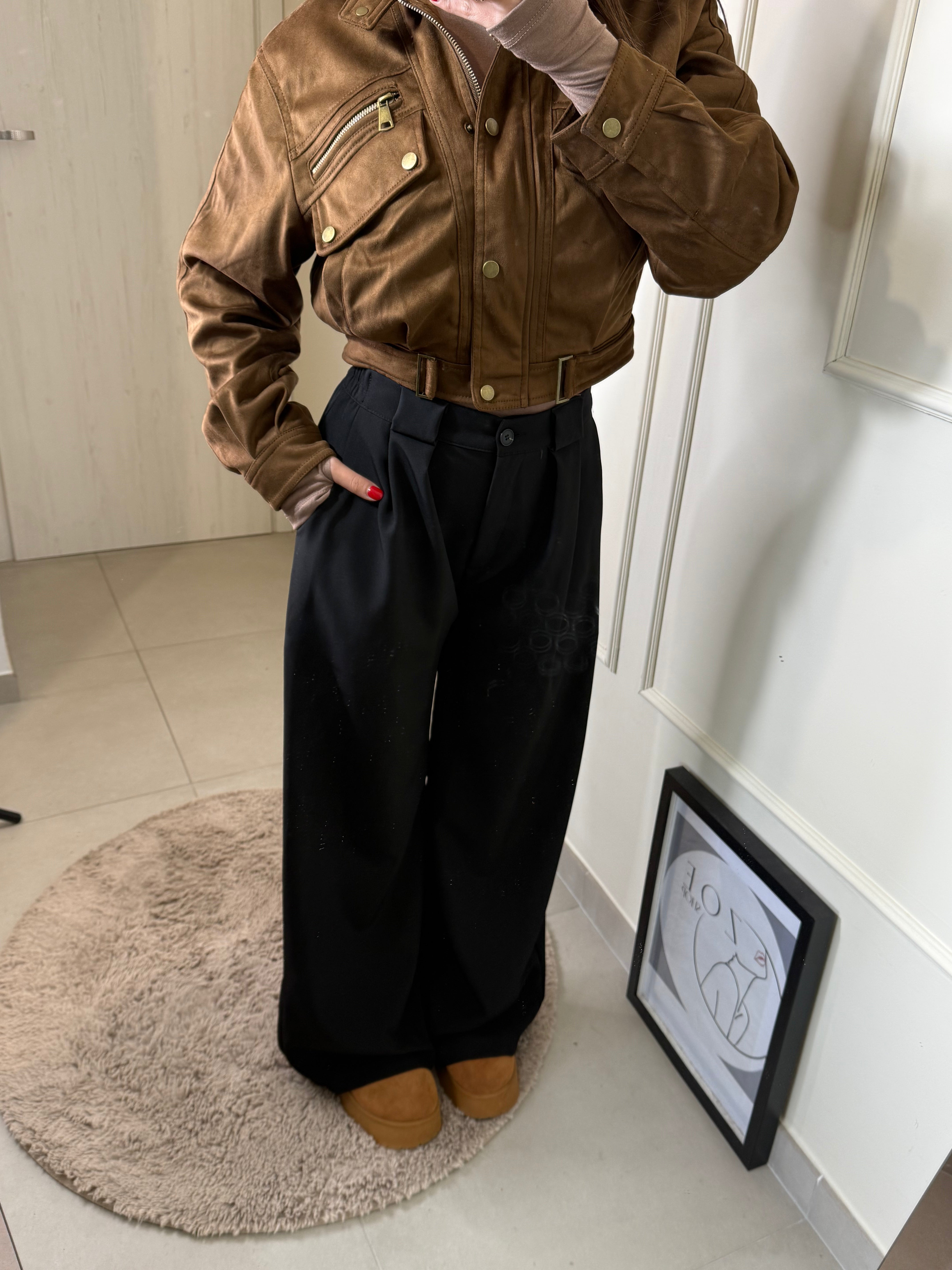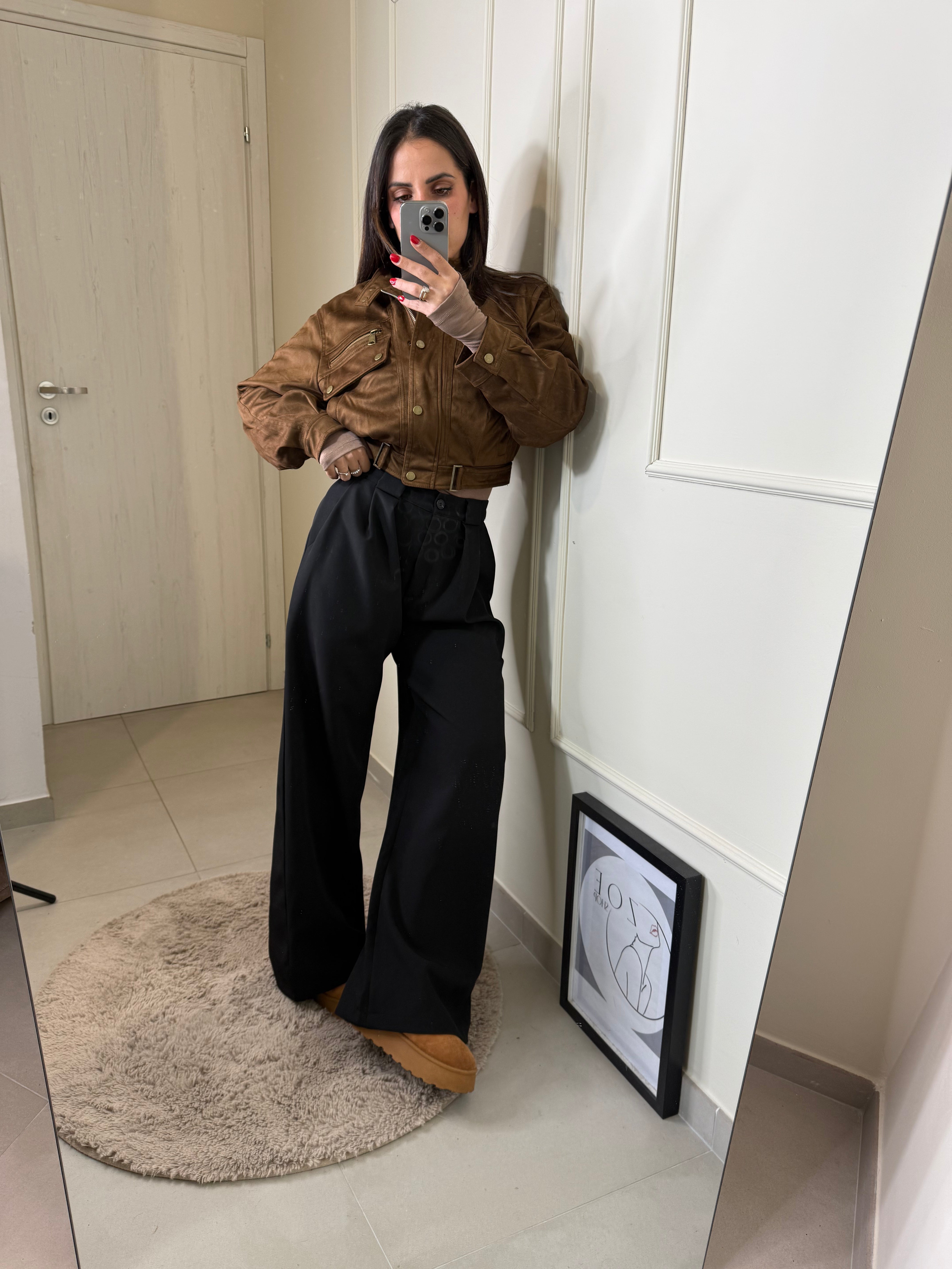 Pantalone palazzo nero dal design raffinato . Perfetto per accompagnarti con stile in ogni momento della giornata ,linea ampia e fluida , scivola morbido sulla figura , regalando comfort e movimento ad ogni passo. Chiusura con zip e bottone , elastico sul retro e passanti per la cinta . Un capo estremamente versatile , ideale per l'ufficio abbinato a camicia e blazer ma altrettanto perfetto per look quotidiano o serali. Taglia unica veste da XS a L