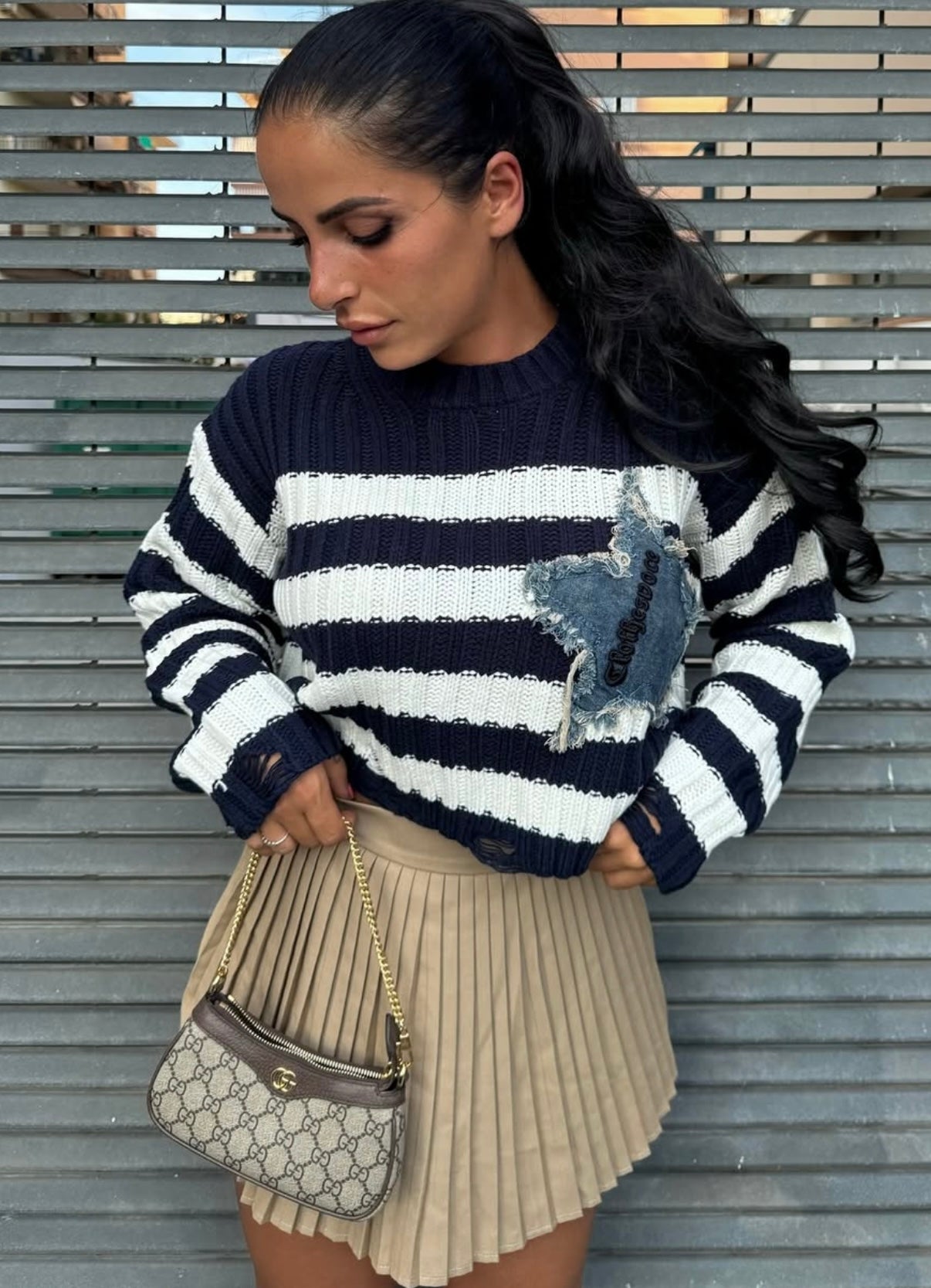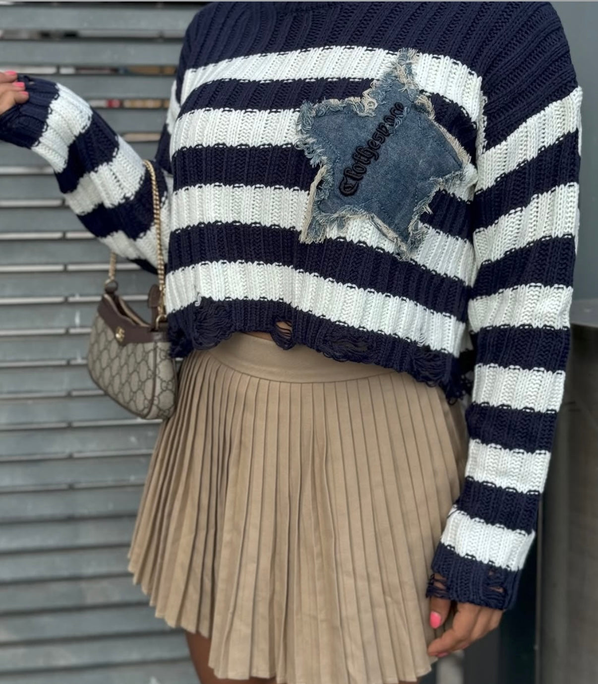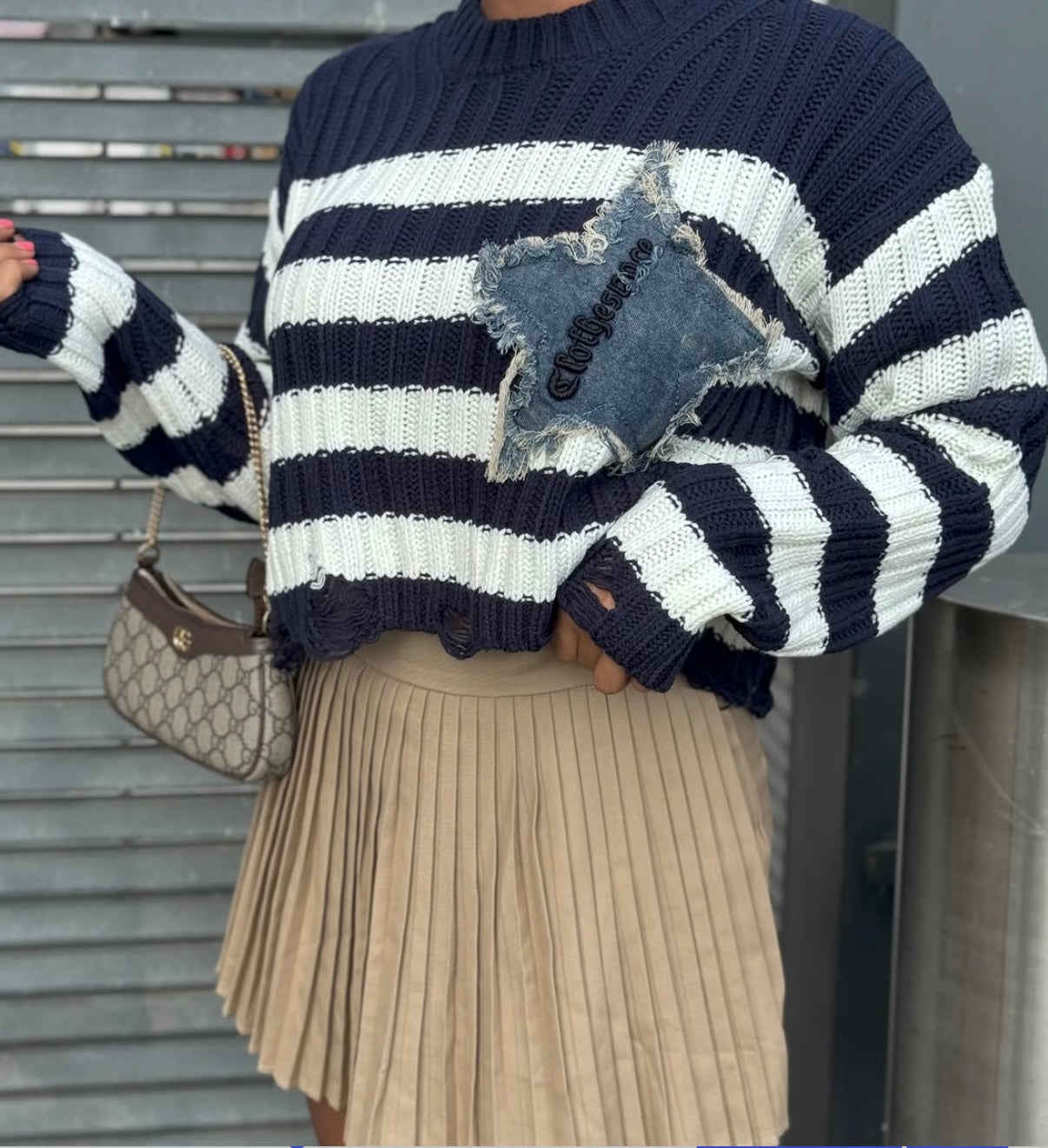 Le righe blu e bianche danno un mood fresco mentre il fondo a taglio vivo aggiunge quel tocco che rende il look più moderno. Inserto in denim sul davanti, un dettaglio di tendenza che crea contrasto e rende il capo unico. Sta bene con tutto: jeans, pantaloni morbidi, gonne o sotto una giacca per un look casual ma curato.taglia unica veste da XS A L