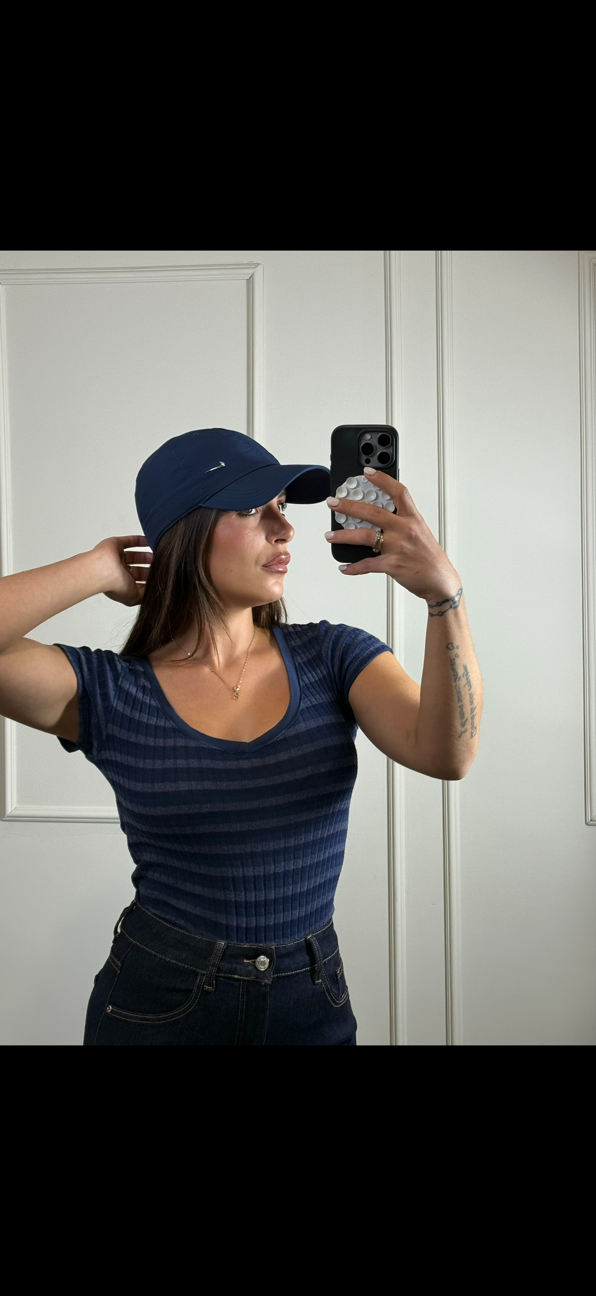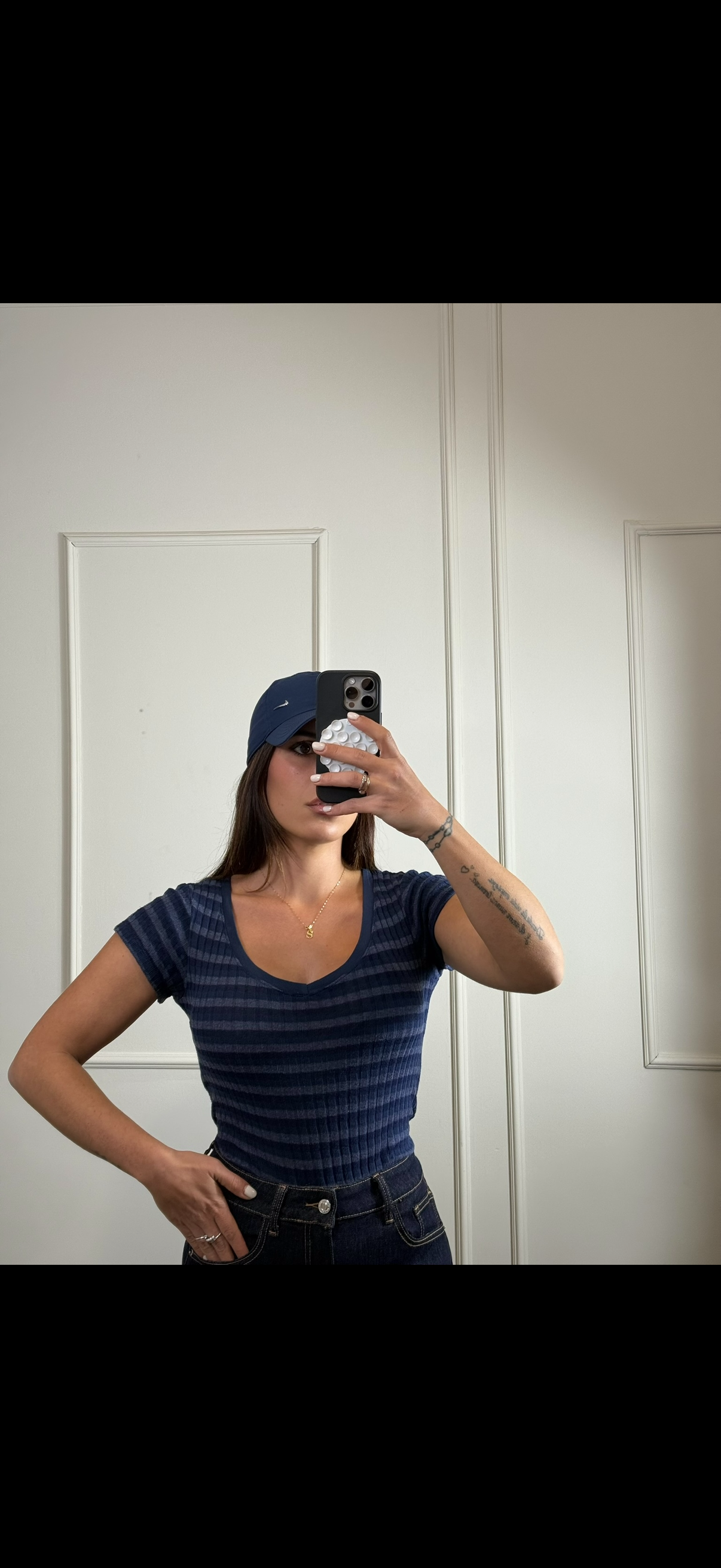 Canotta dal design essenziale e raffinato, realizzata in una delicata tonalità di blu con righe blu più chiare che donano un effetto elegante e moderno. Lo scollo valorizza la silhouette, rendendola perfetta sia per look casual che più curati. Taglia unica veste da xs a l