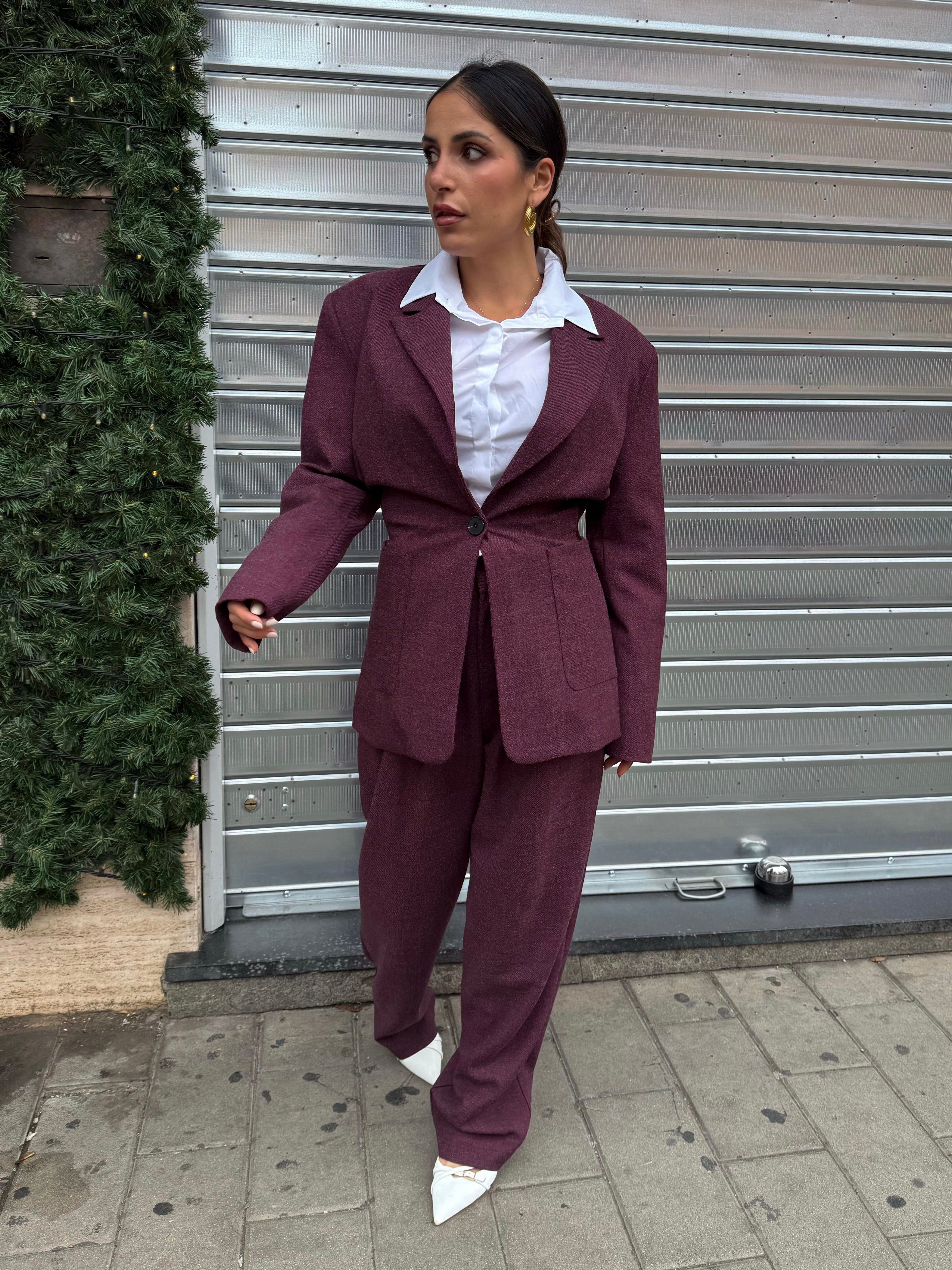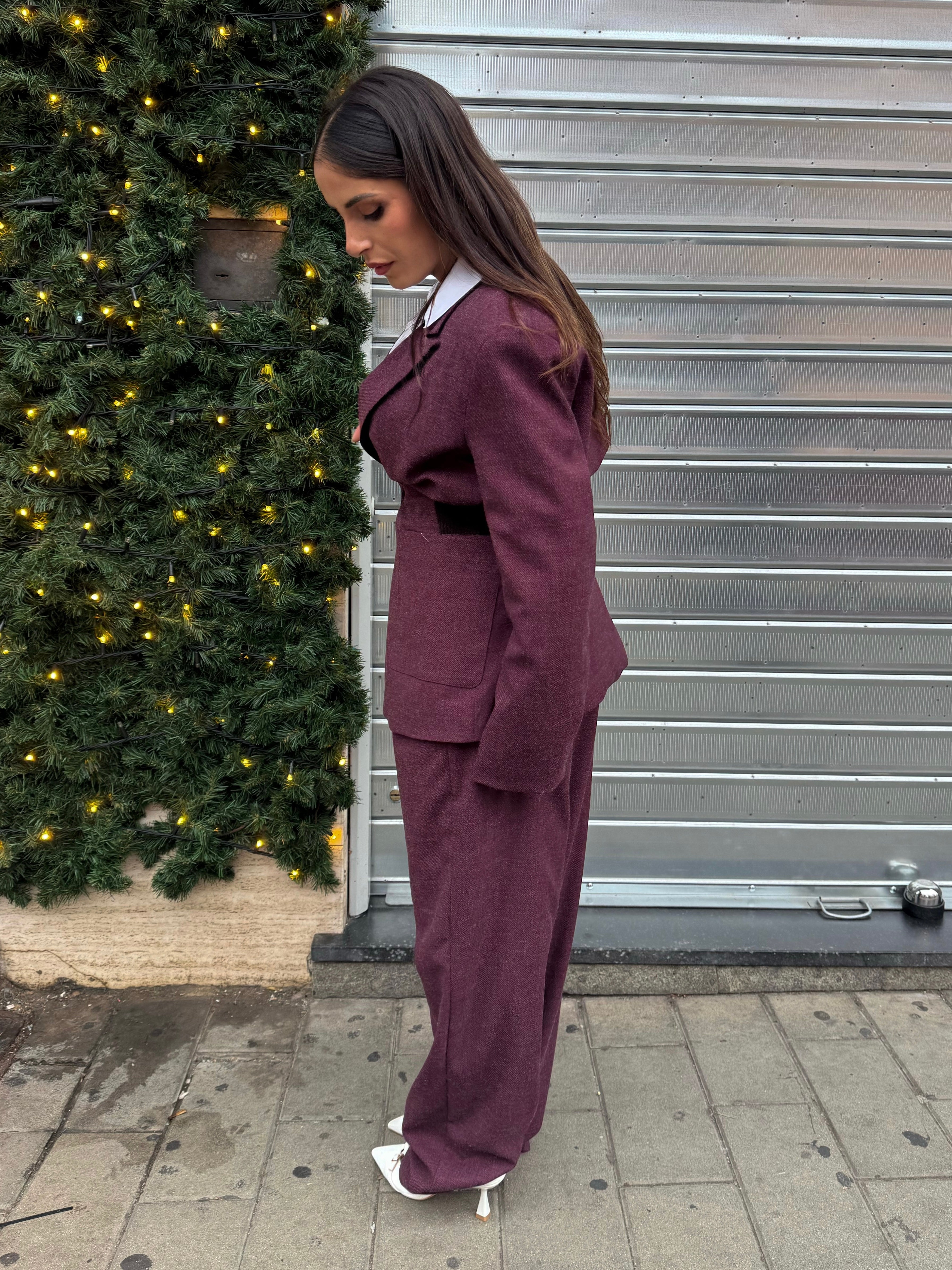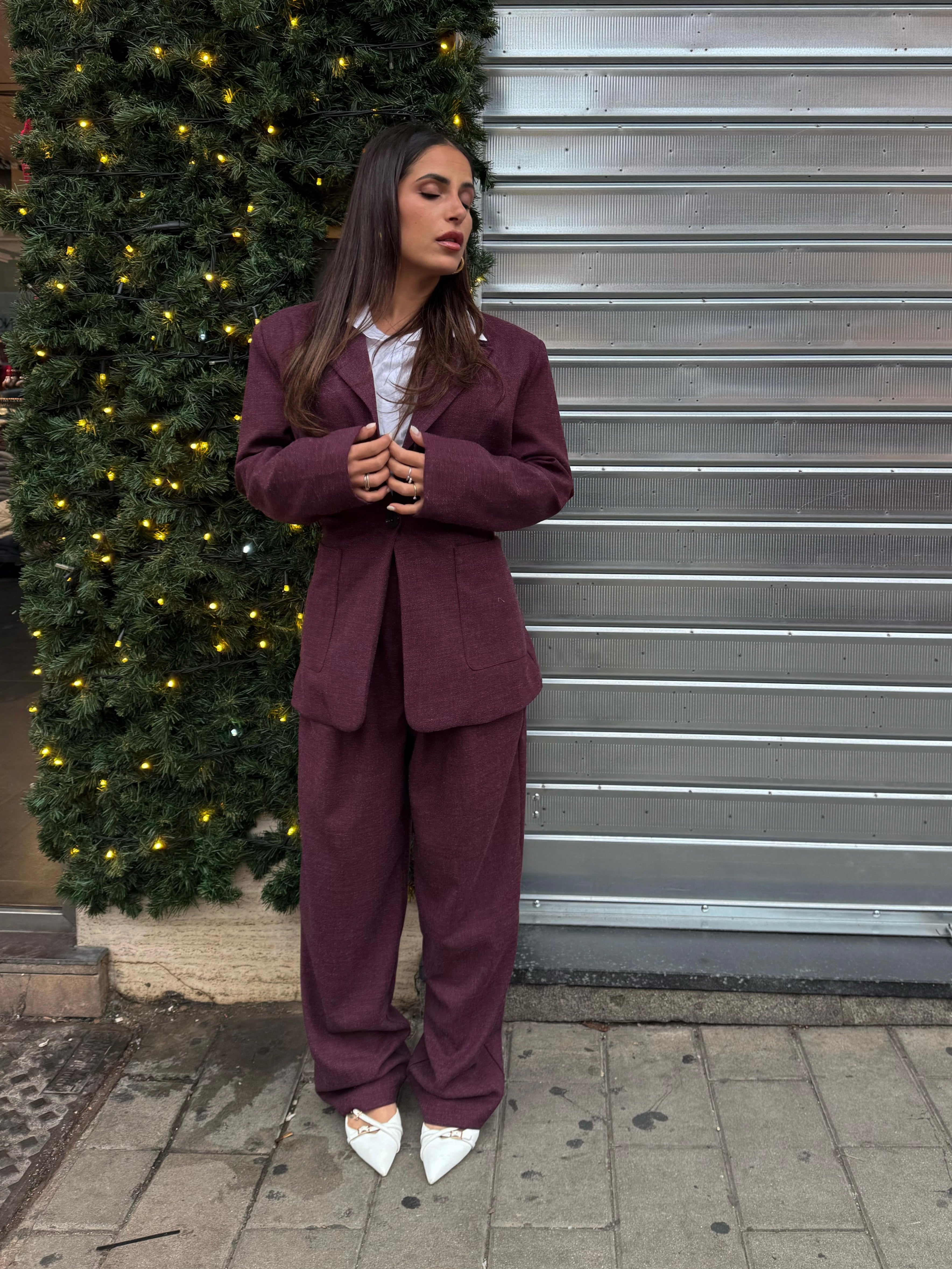Completo elegante e contemporaneo in panno color prugna-bordeaux Il blazer presenta spalline imbottite, foderato all'interno , chiusura frontale con due...