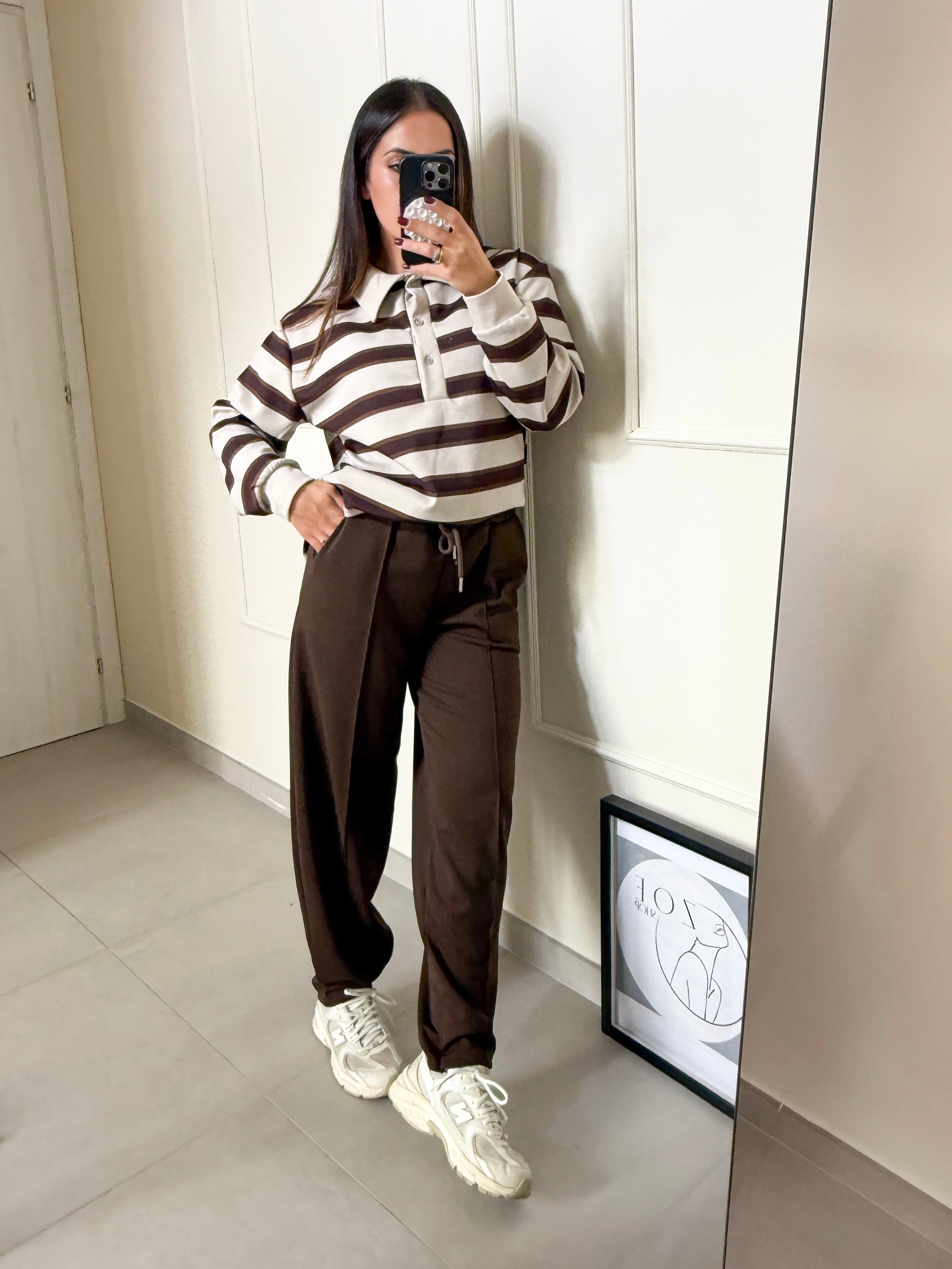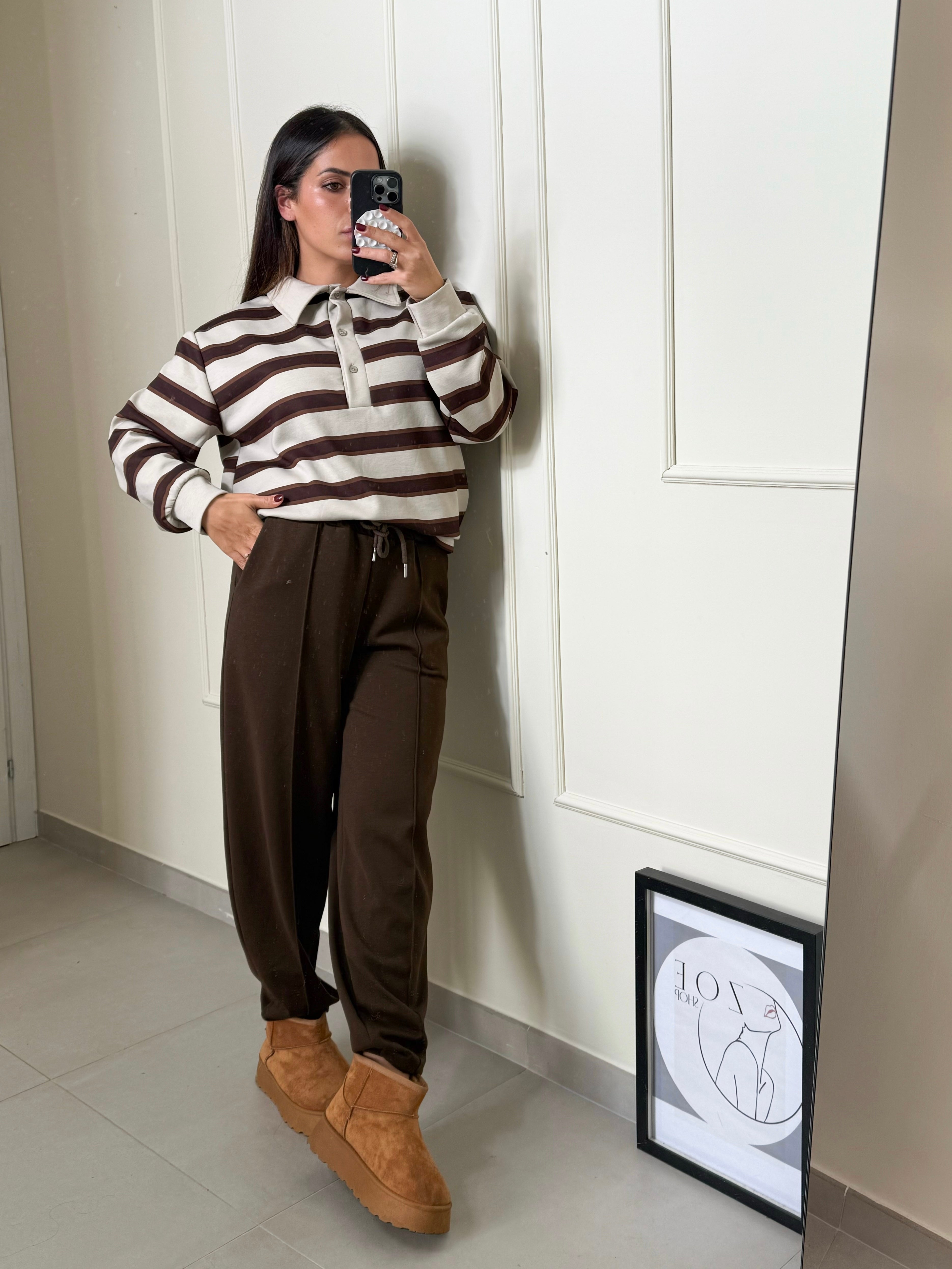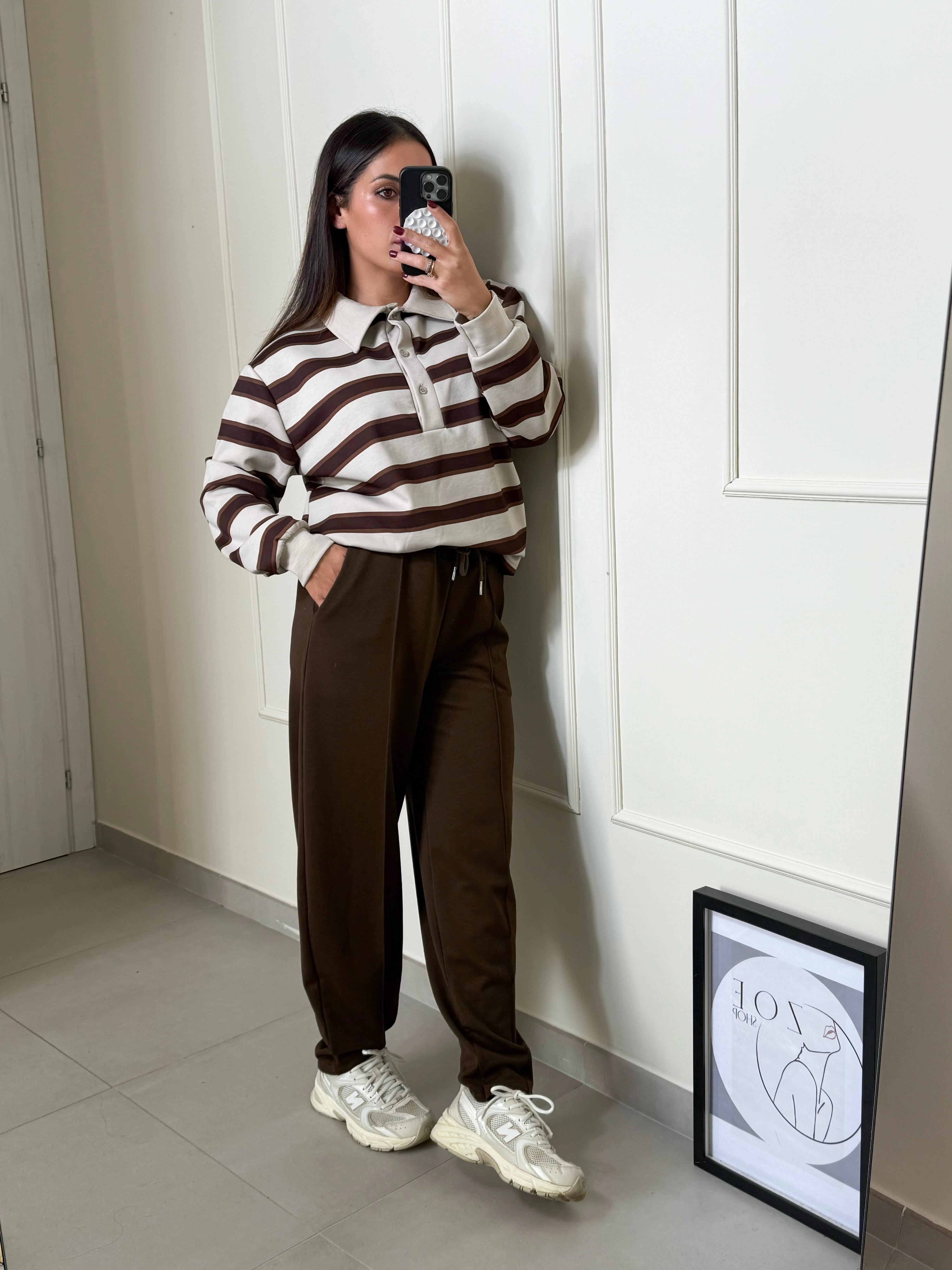 Questa tuta unisce comfort e stile in un look moderno e di tendenza, Polo oversize a righe nei toni del marrone e beige, pantalone tinta unita con elastico in vita e fondo stretto. Realizzata in un tessuto morbido e internamente felpato. Taglia unica veste da XS a L abbondante. Sara è alta 1.63