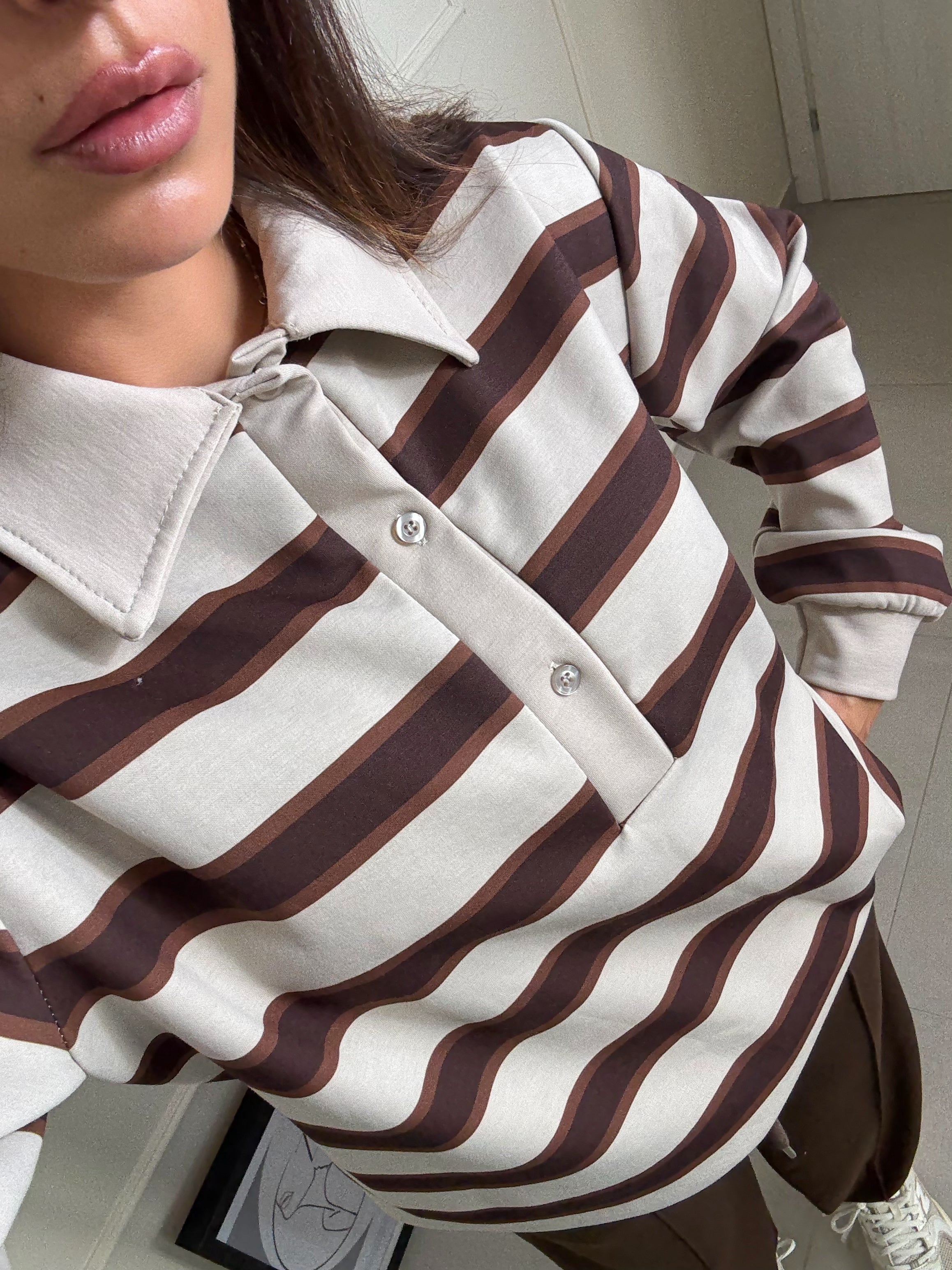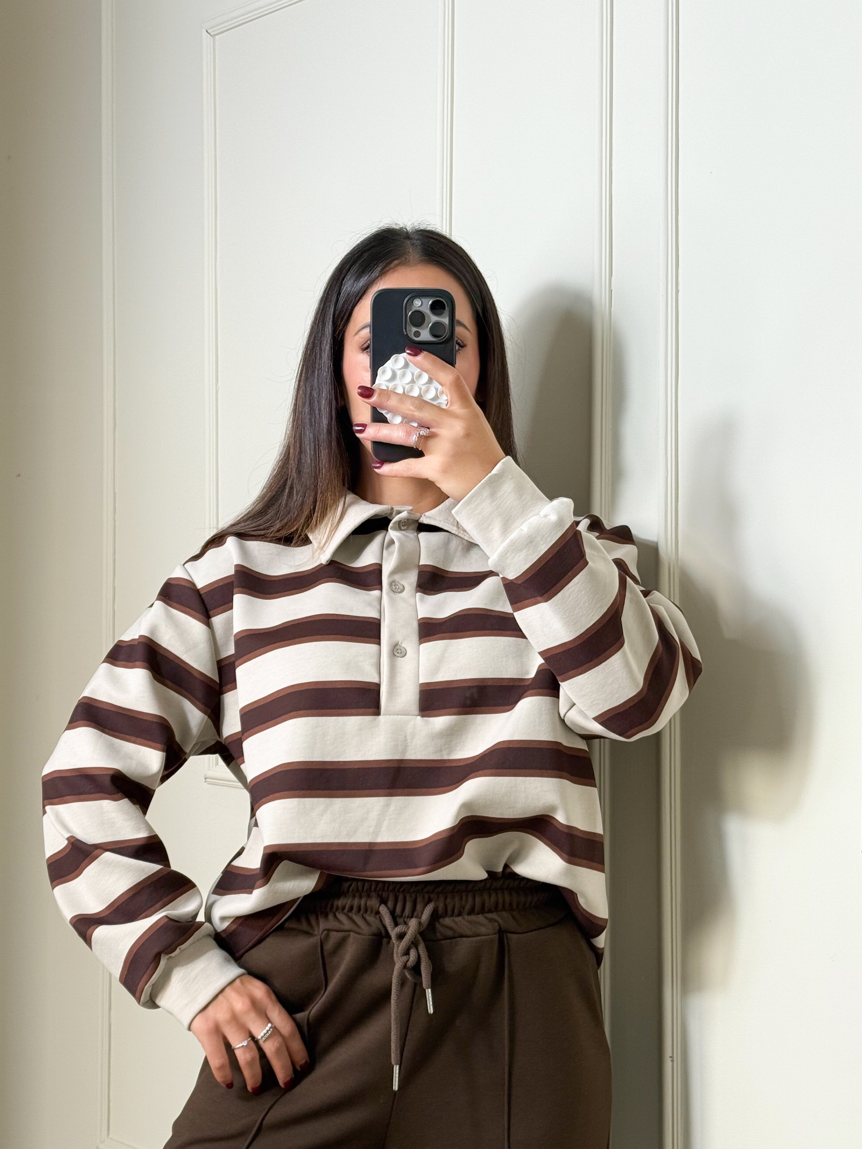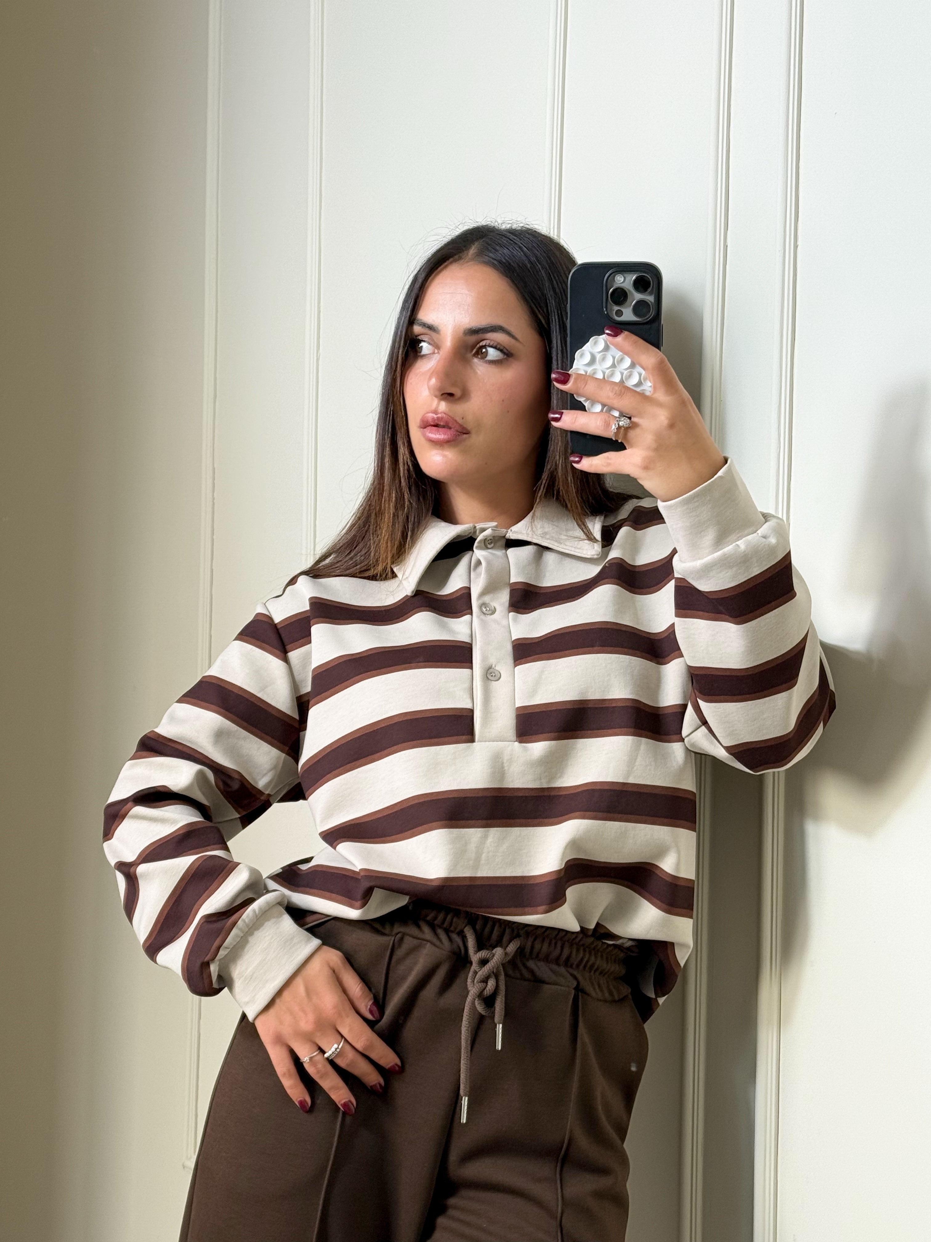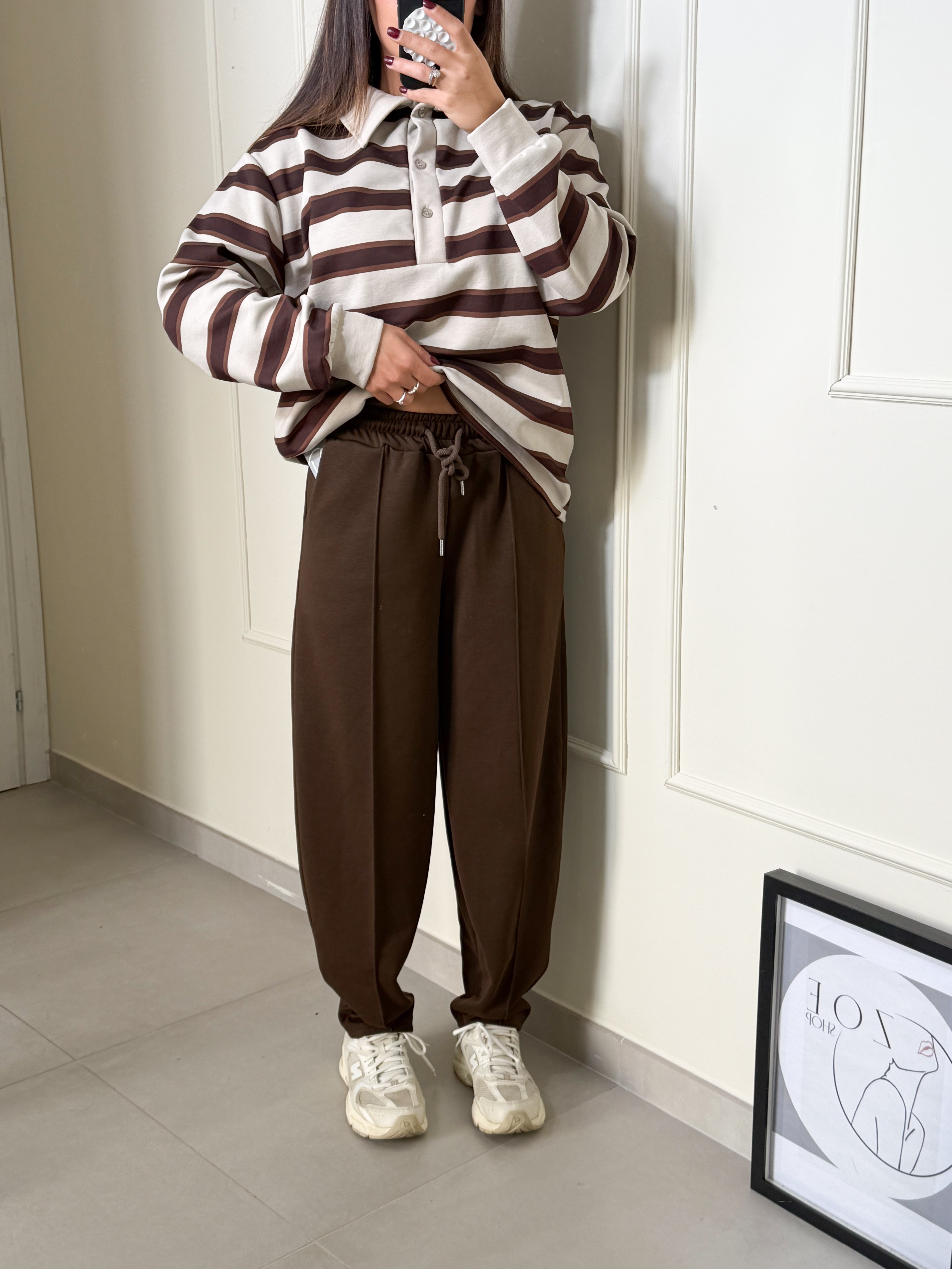 Questa tuta unisce comfort e stile in un look moderno e di tendenza, Polo oversize a righe nei toni del marrone e beige, pantalone tinta unita con elastico in vita e fondo stretto. Realizzata in un tessuto morbido e internamente felpato. Taglia unica veste da XS a L abbondante. Sara è alta 1.63